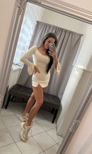 Olan trapéz ujjú bézs szoknya nadrágos overál
