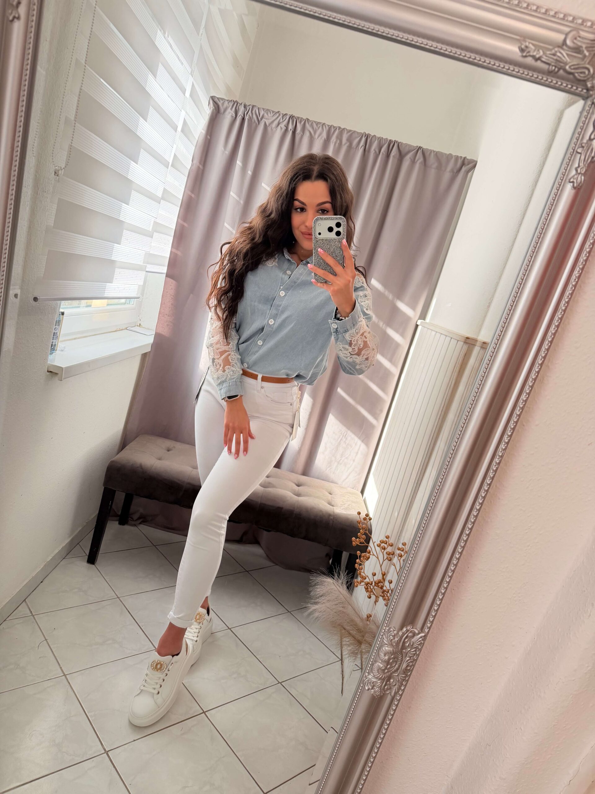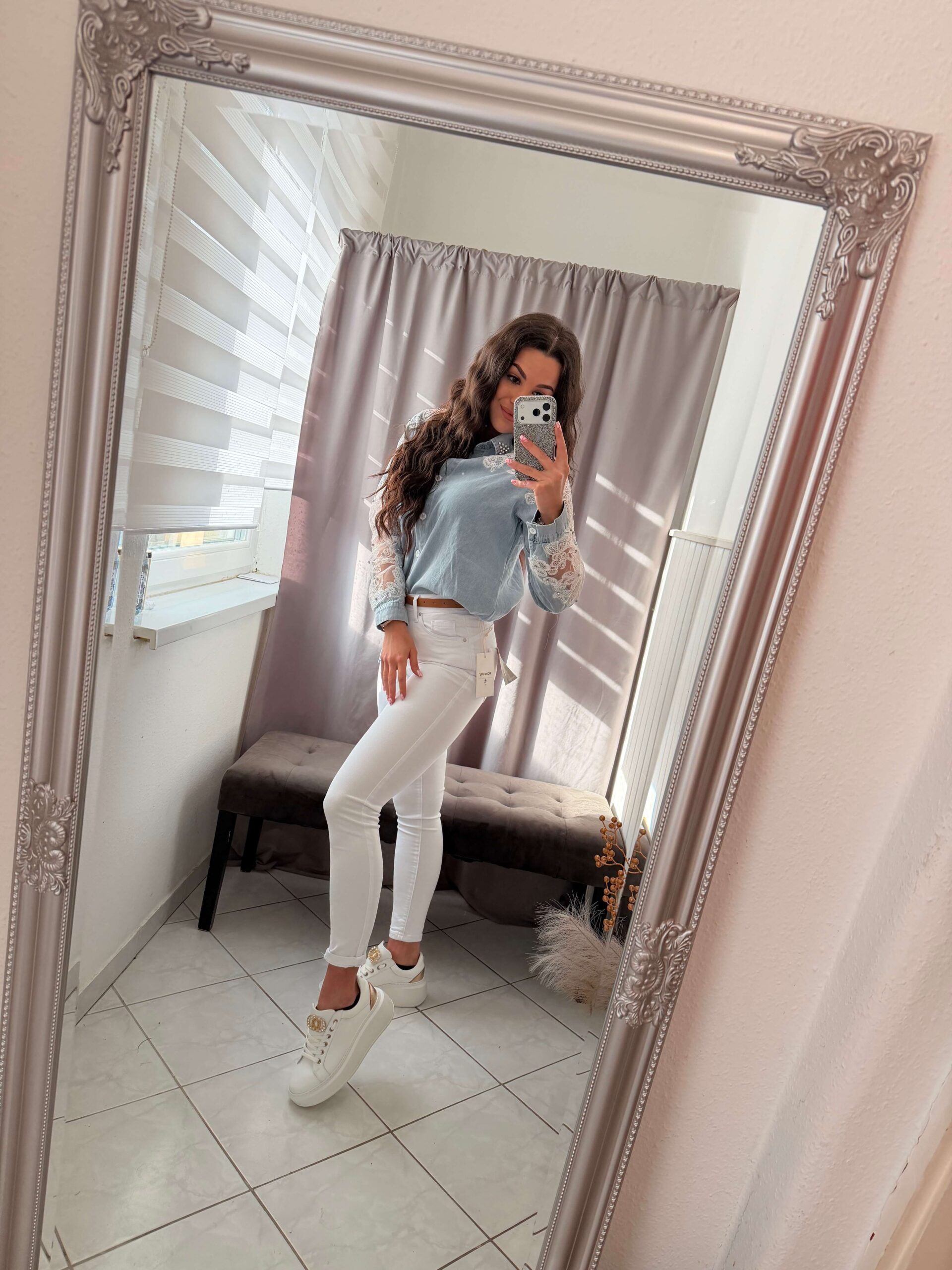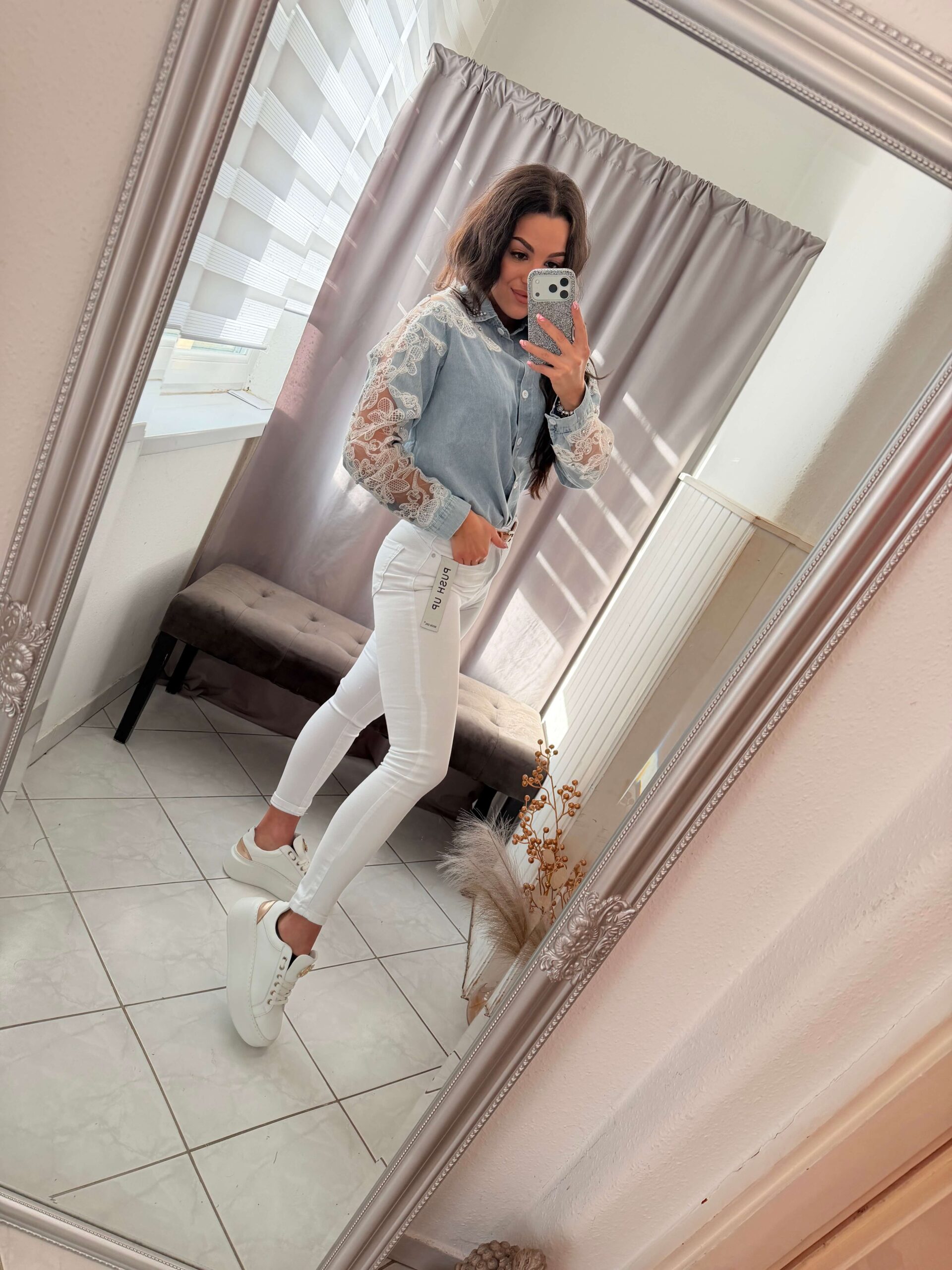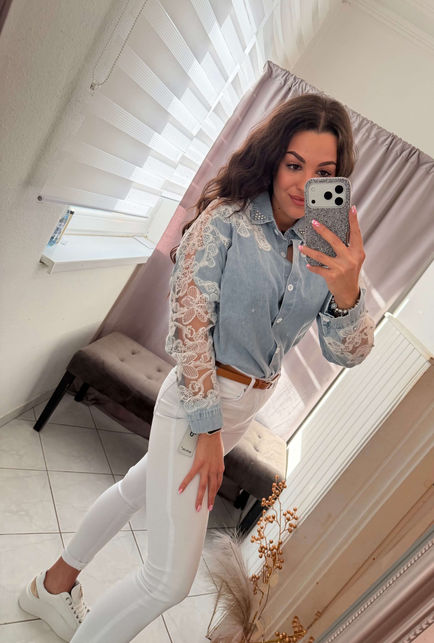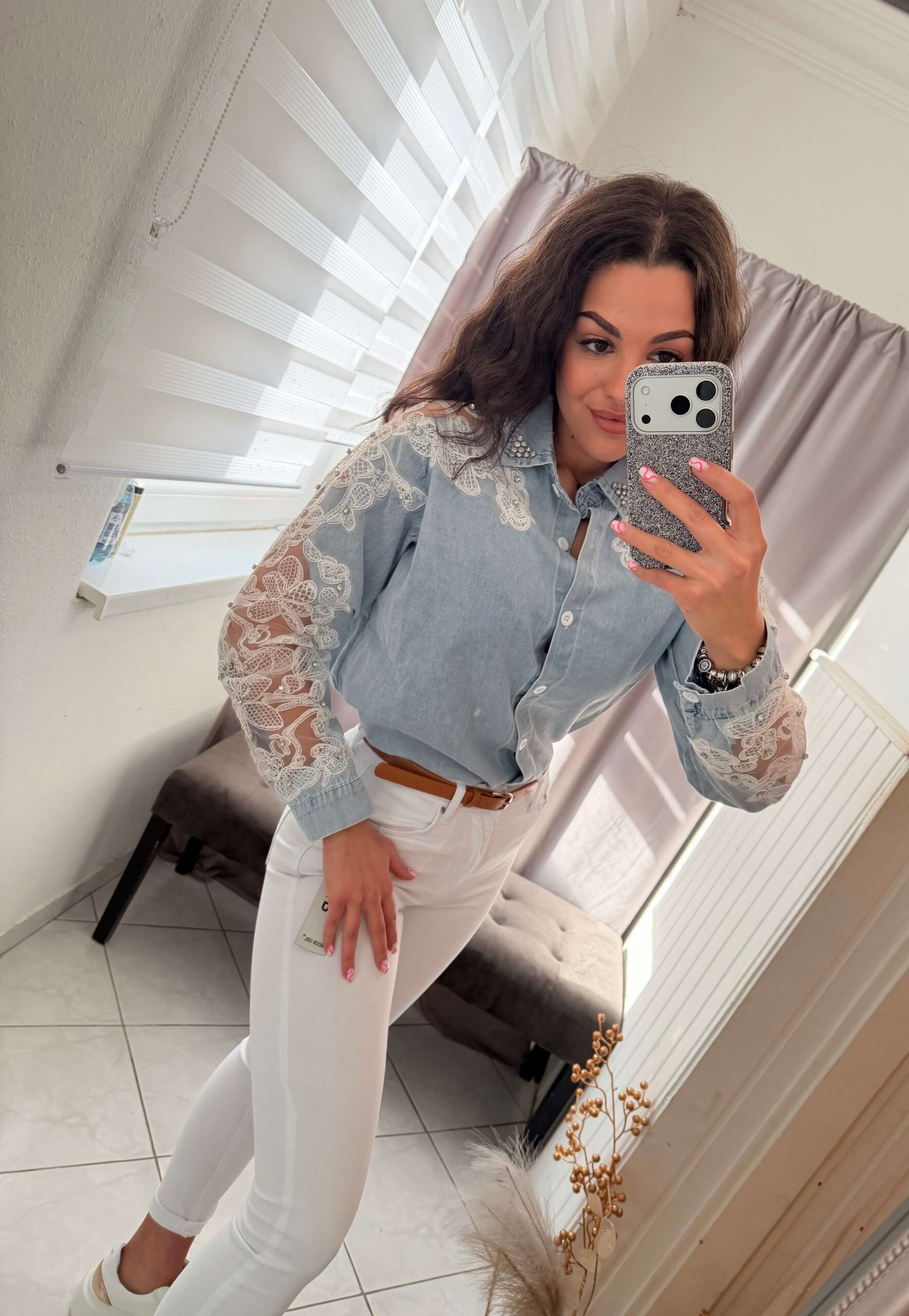 Dessa gyöngyös világoskék farmer ing.
