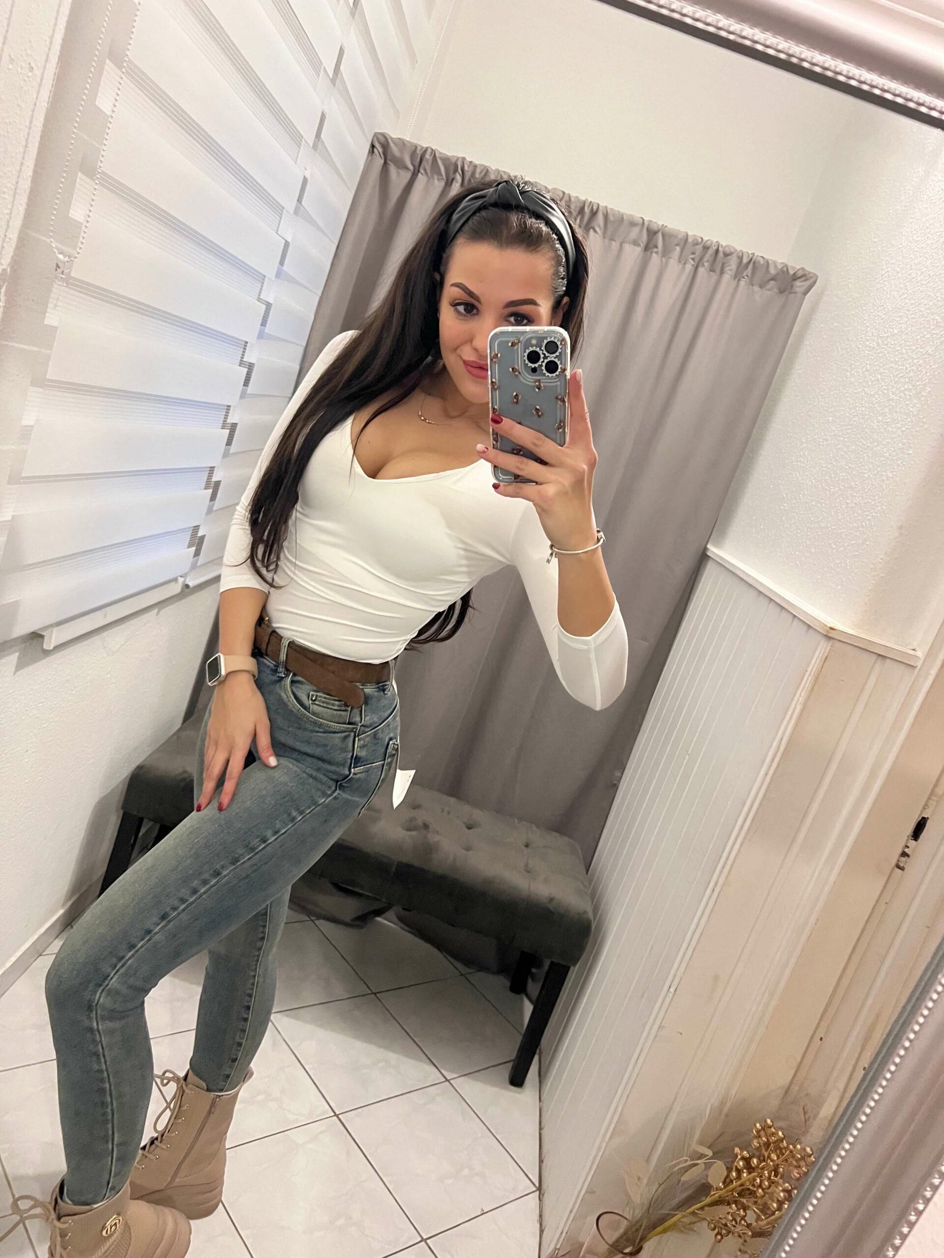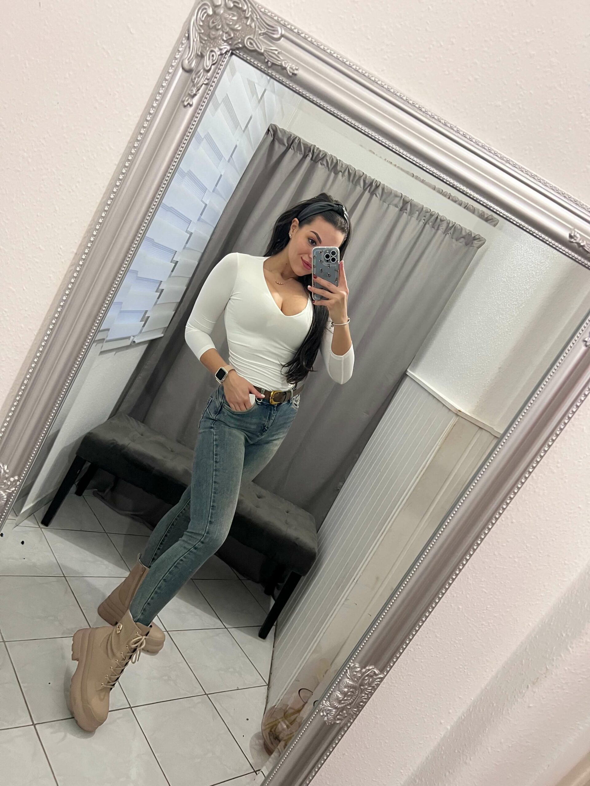 Dóra v kivágású, 3/4 ujjú fazon, törtfehér színben.