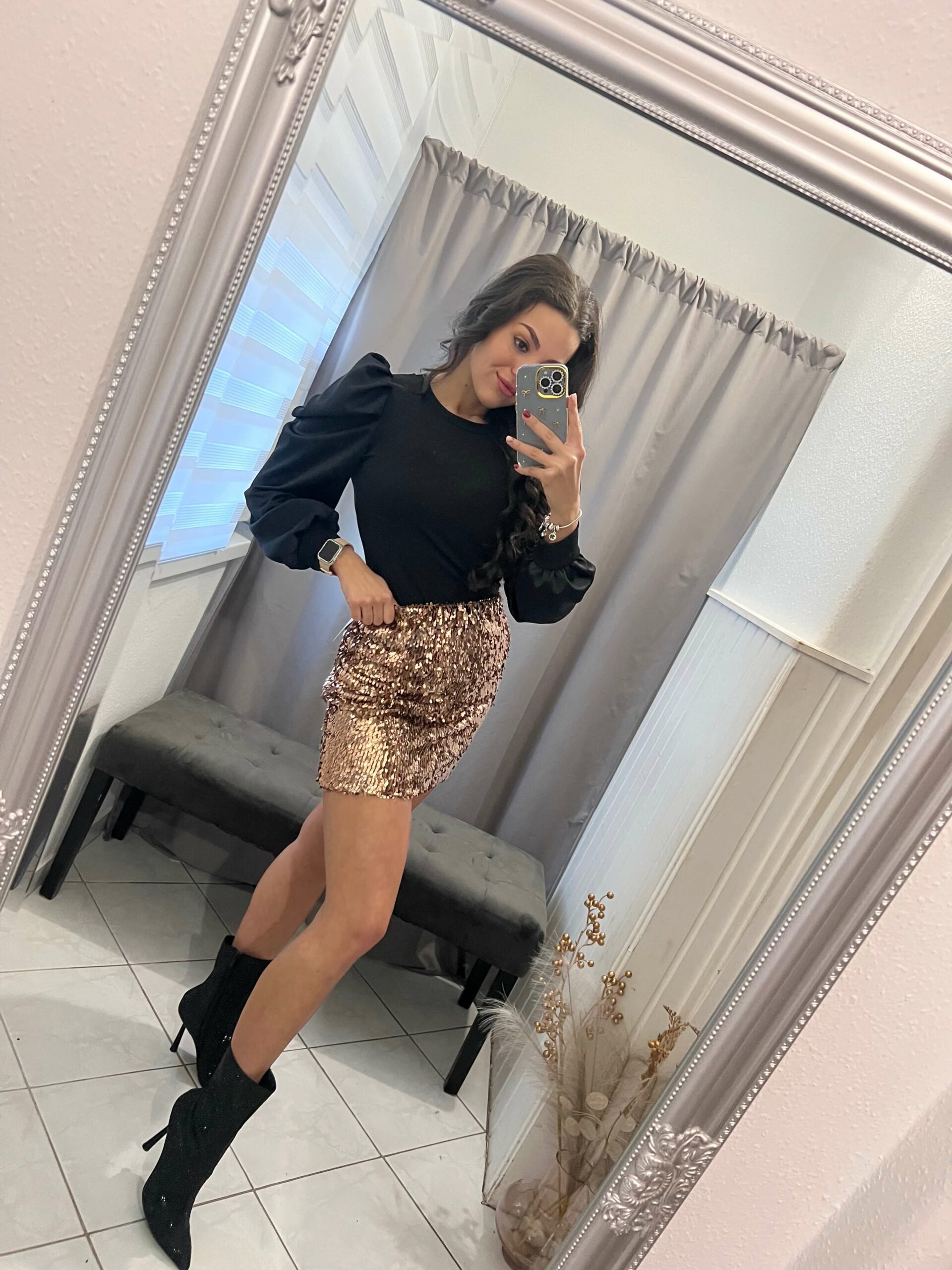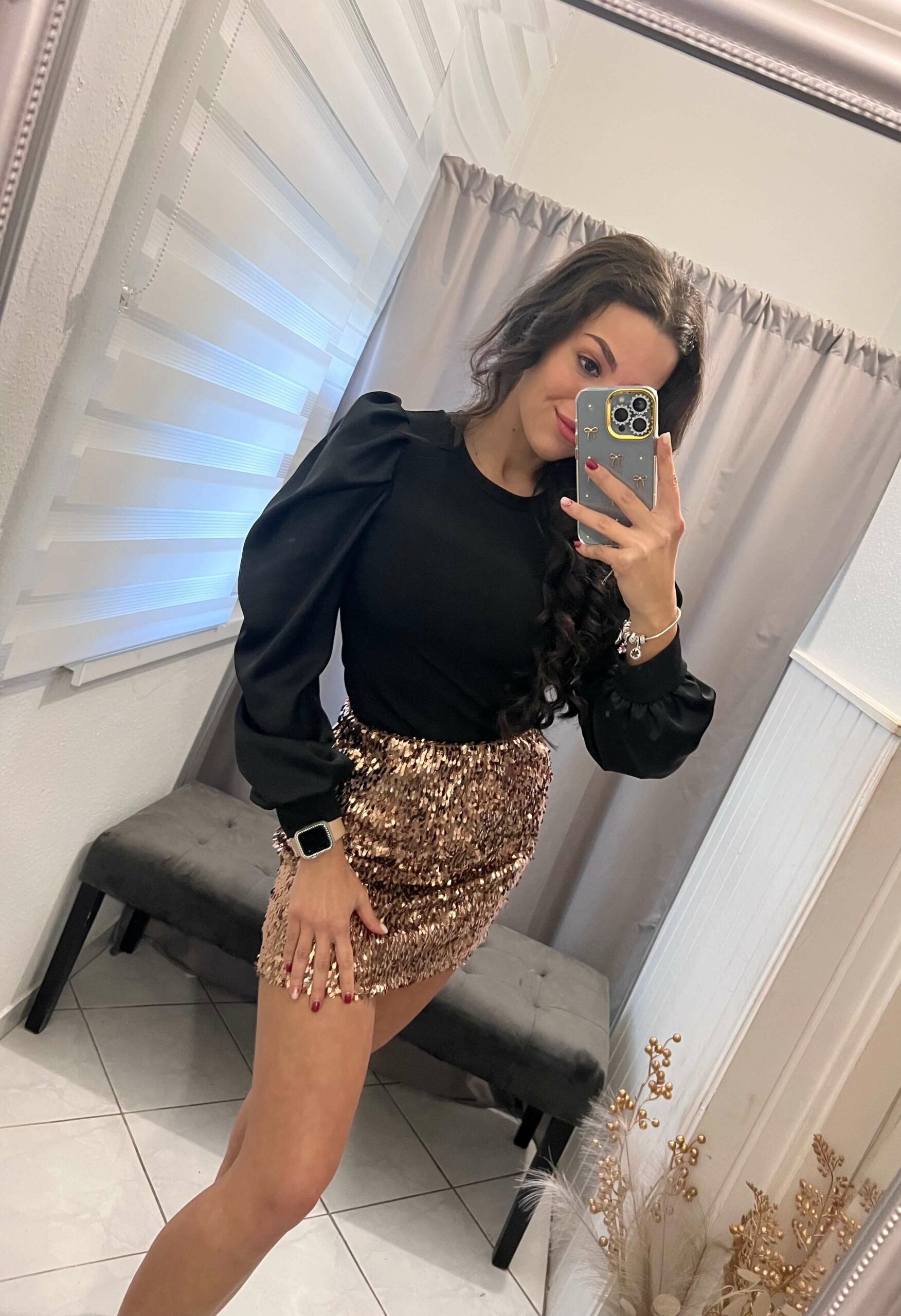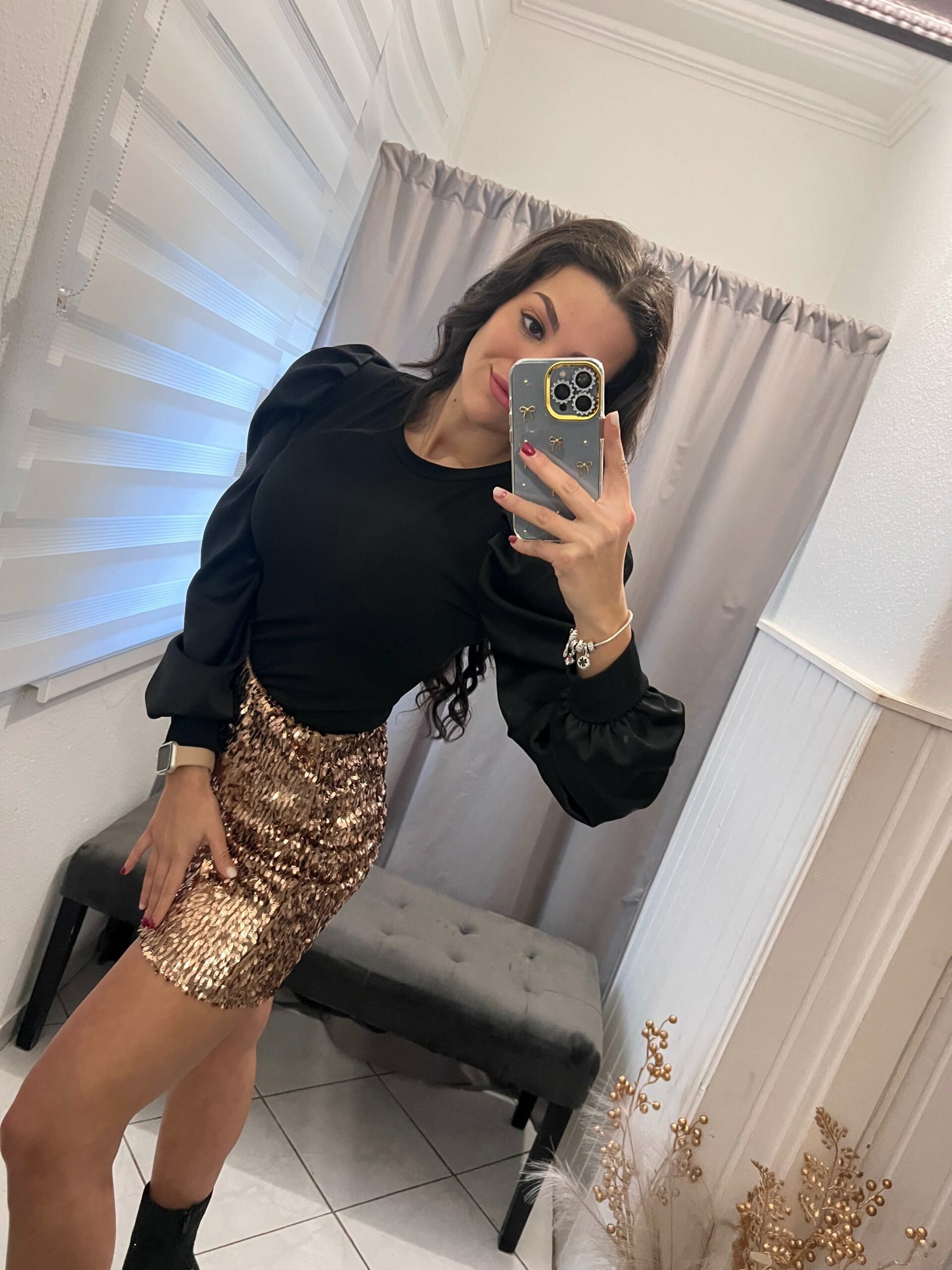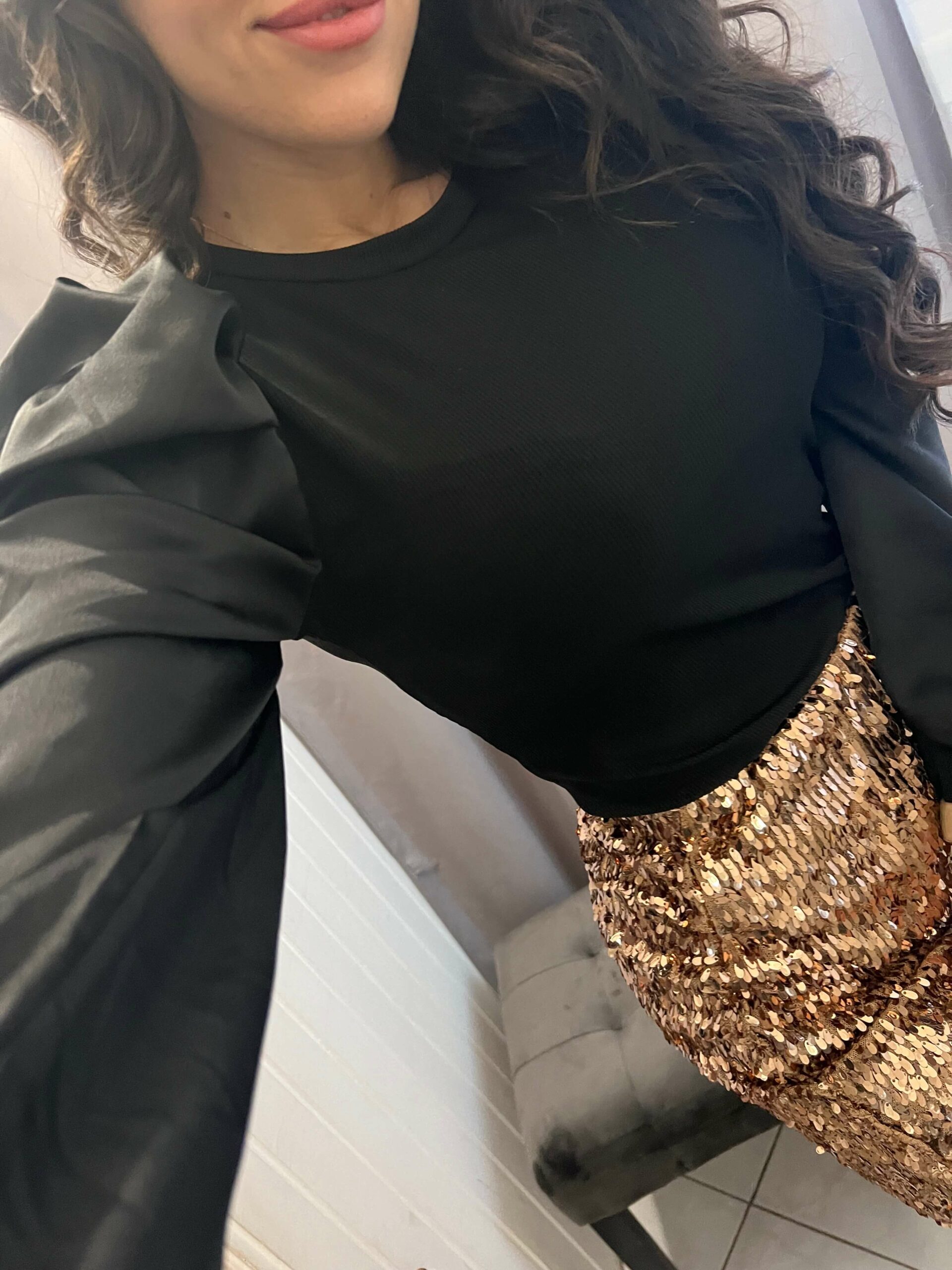 Helka fekete bordázott kialakitású ,ujja szatén anyagú puffos húzott vállrésszel.