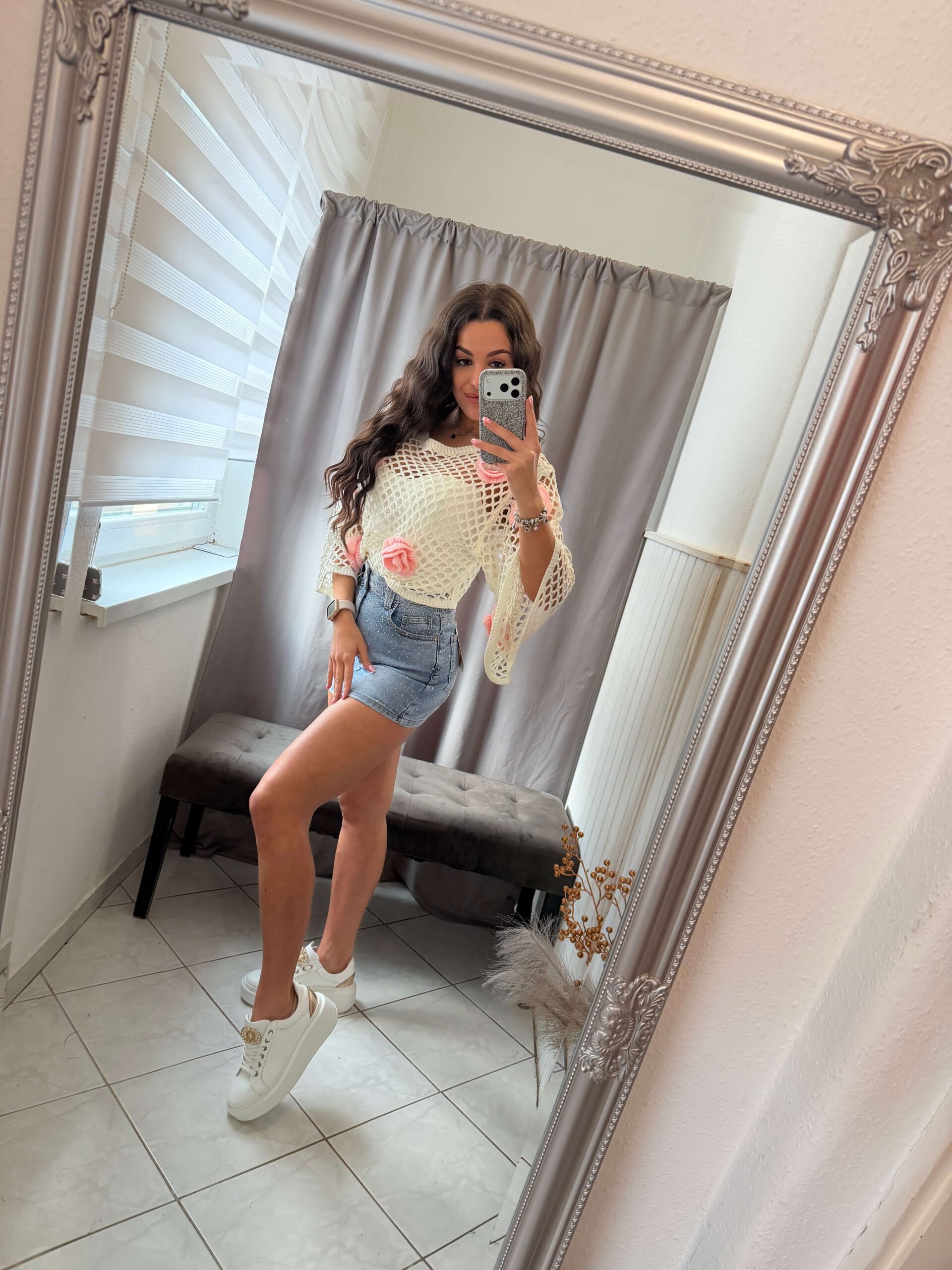 Kera fehér horgolt virág mintás felső.