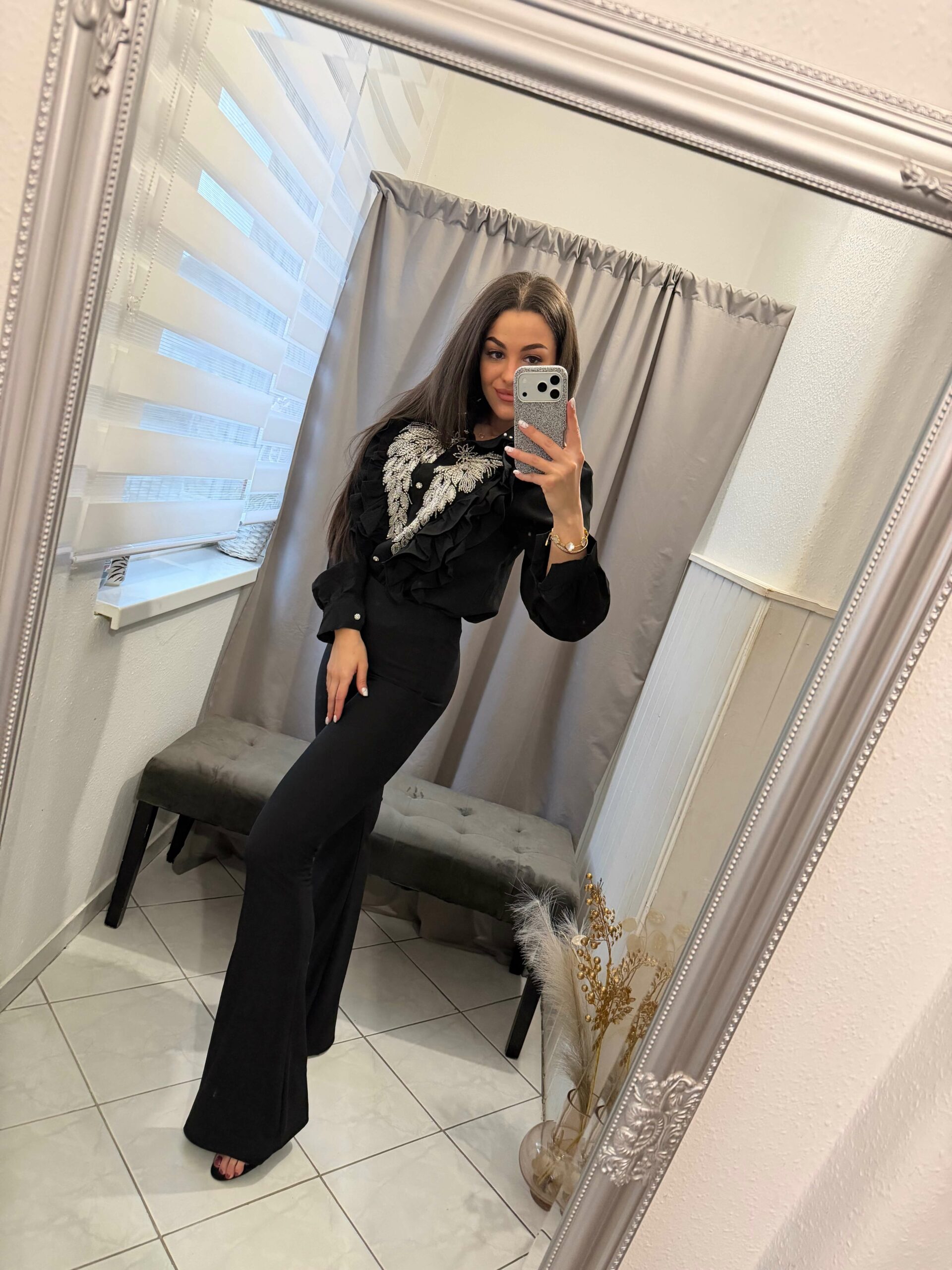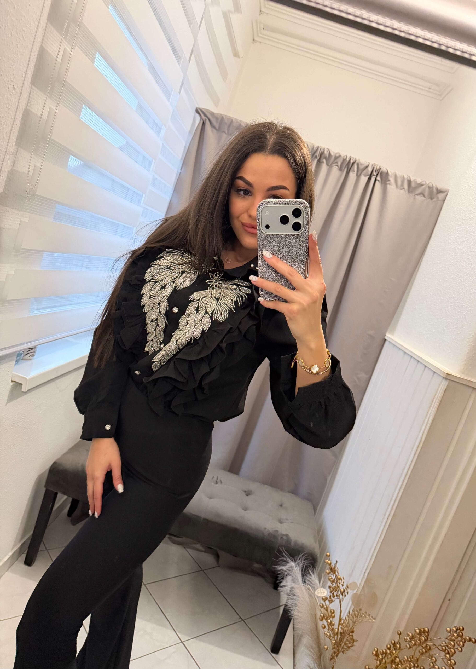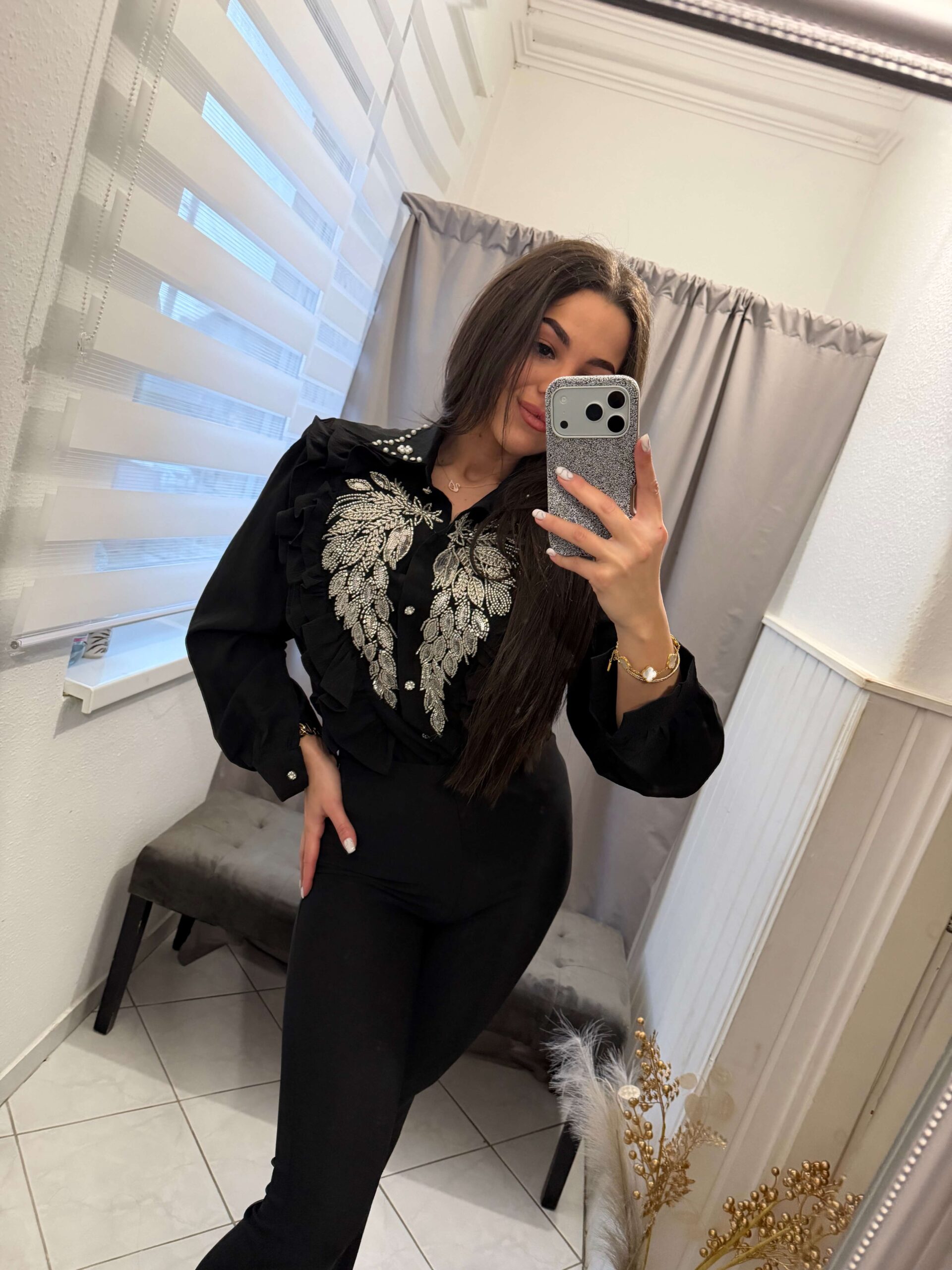 Kila fodros kövekkel diszitett fekete ing.