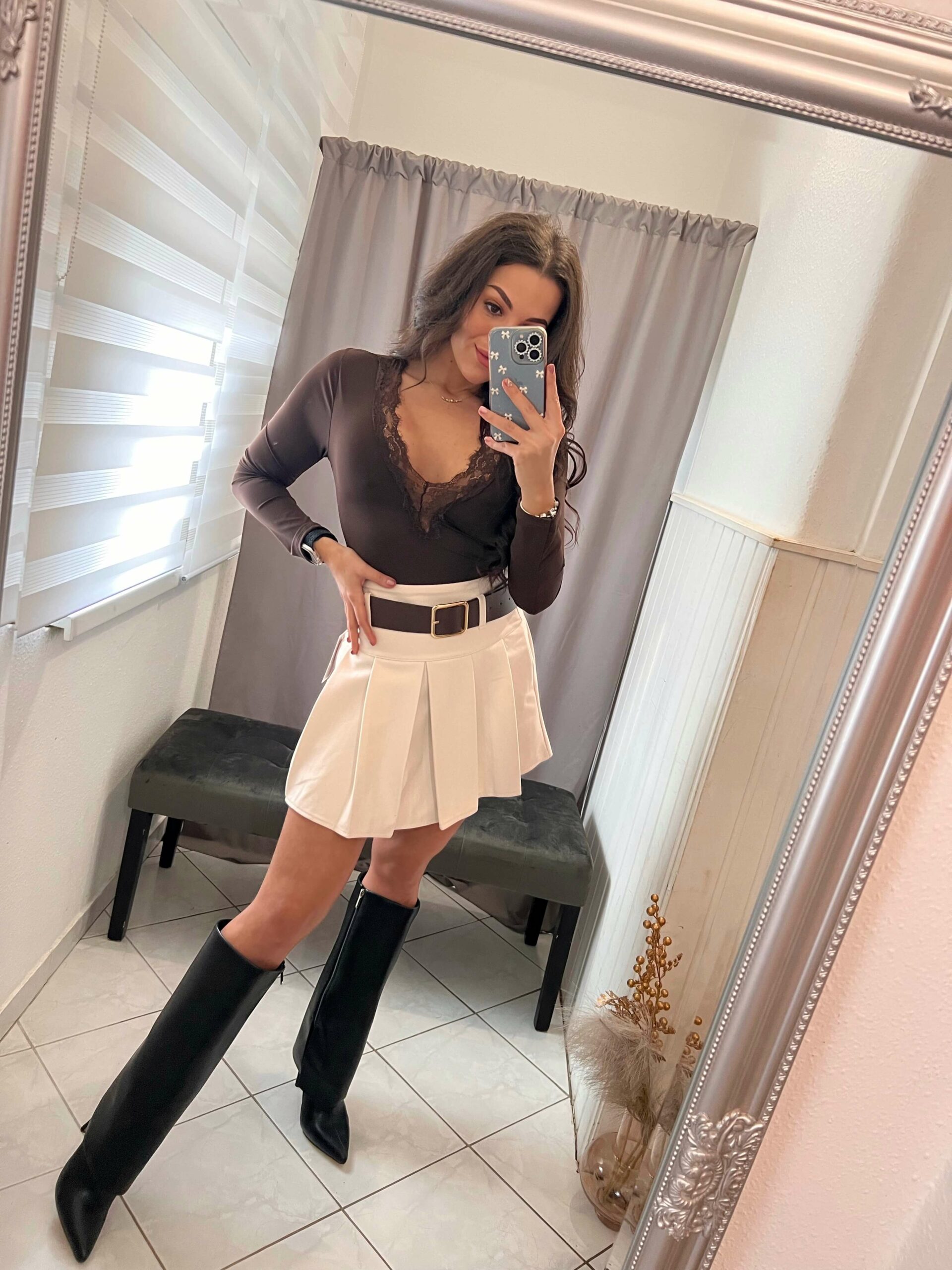 Kolen v kivágott fehér body, csoki barna csipke diszitéssel.