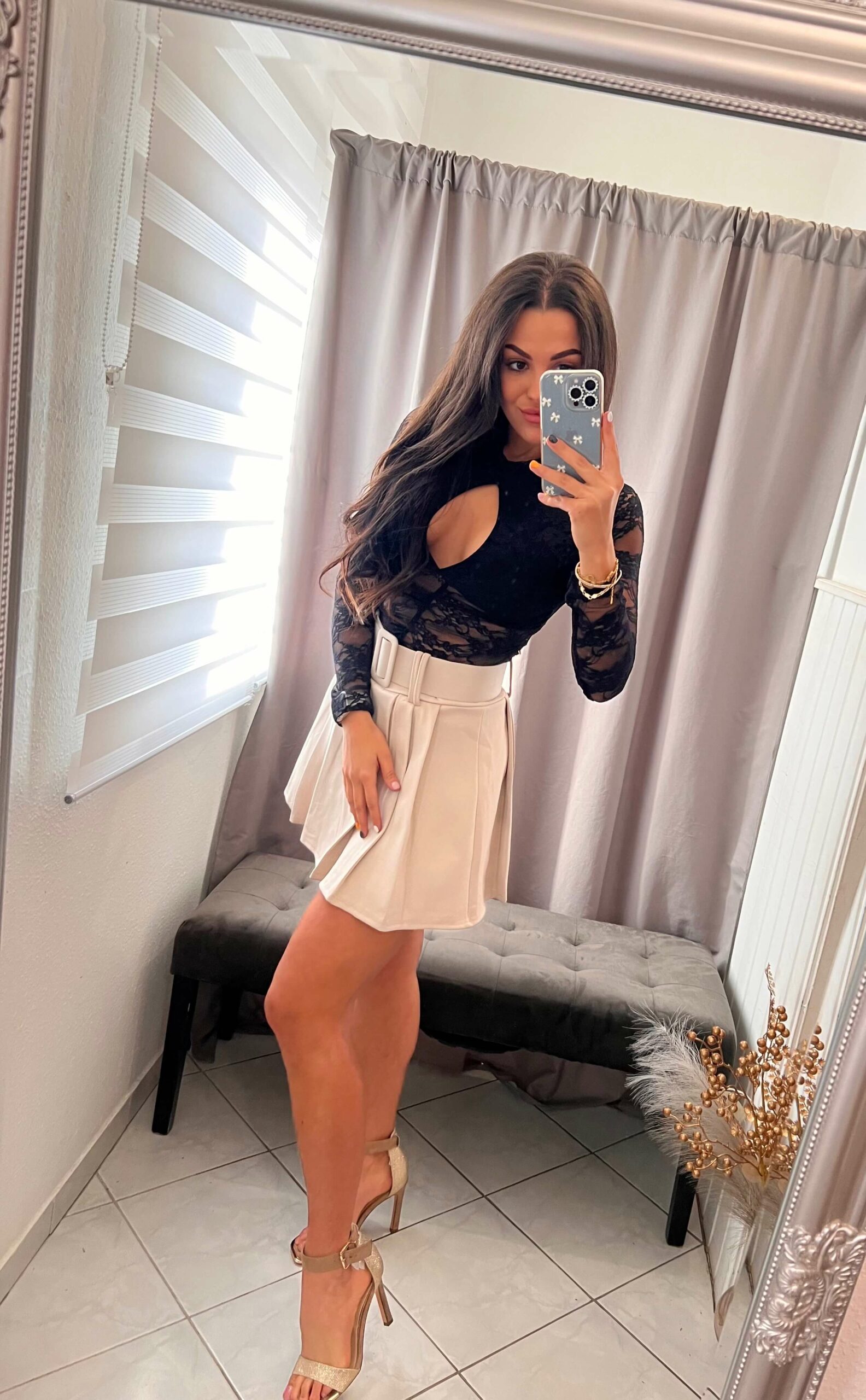 Fekete csipke hosszú ujjú mellrésznél nyitott kialakitású.