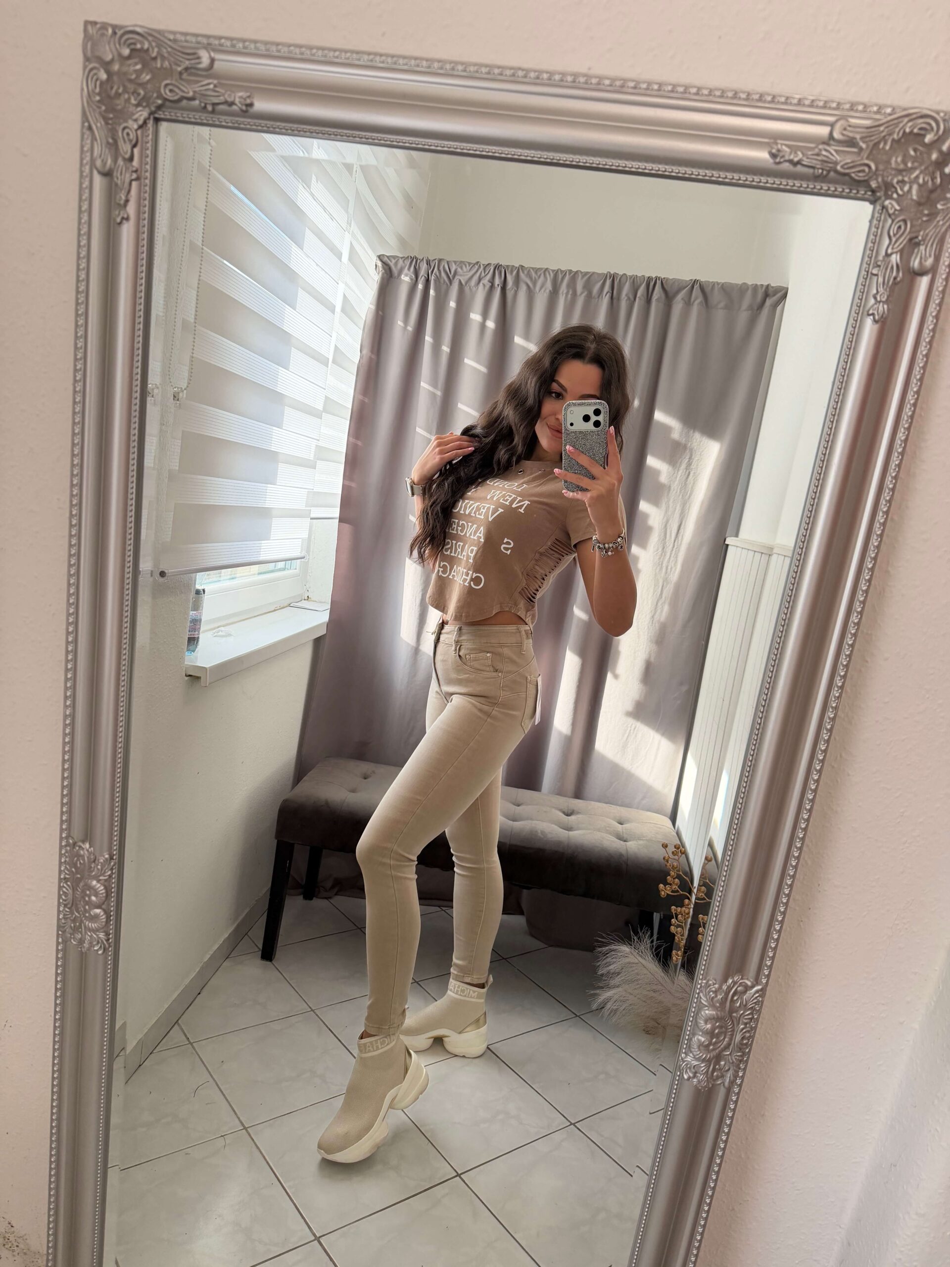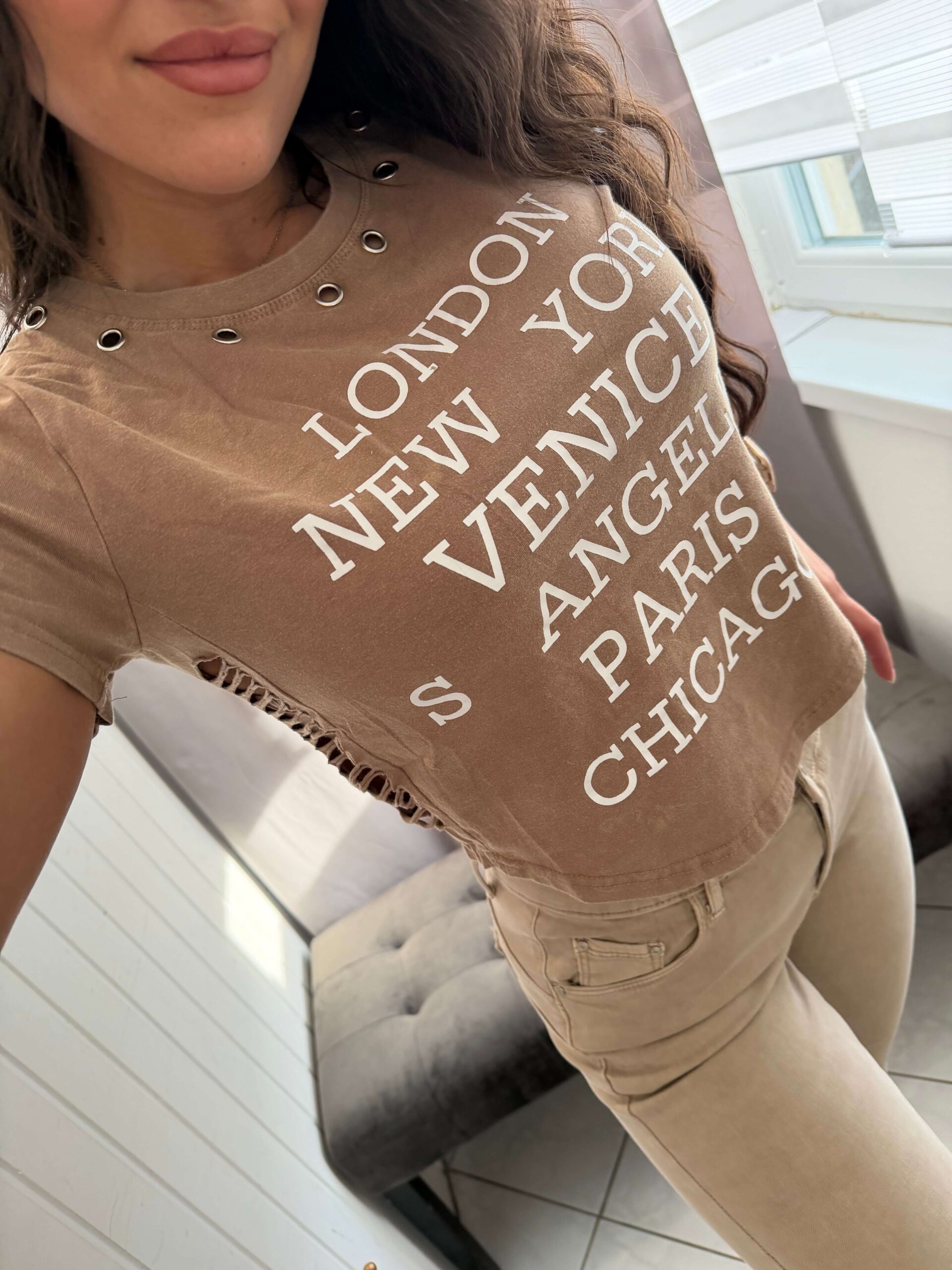 Lona feliratos oldalt nyitott rövid ujjú barna felső,