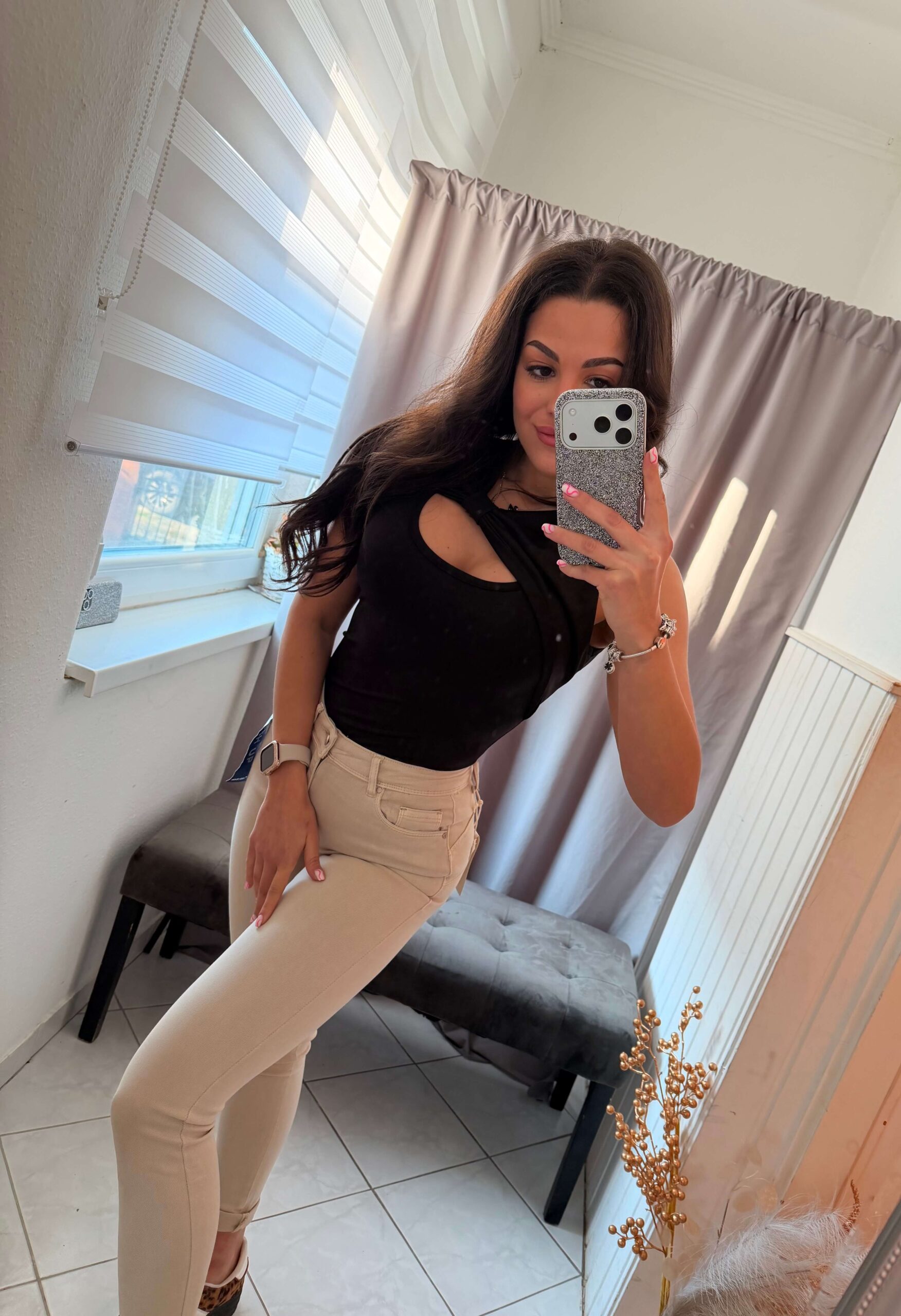Mila fekete masnival diszitett fekete felső.