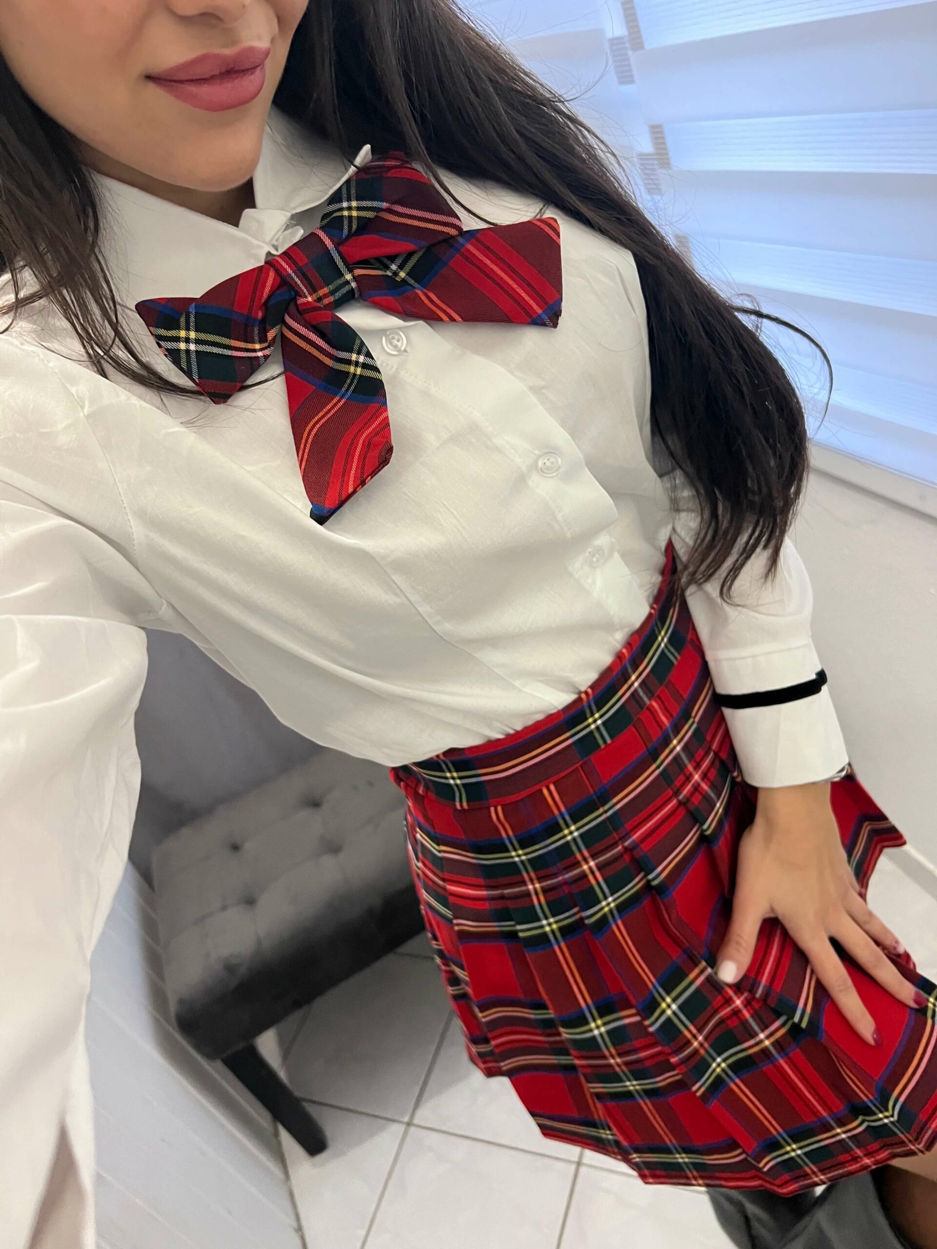 Fehér végig gombos kialakitás, skót mintás masnis diszitéssel.