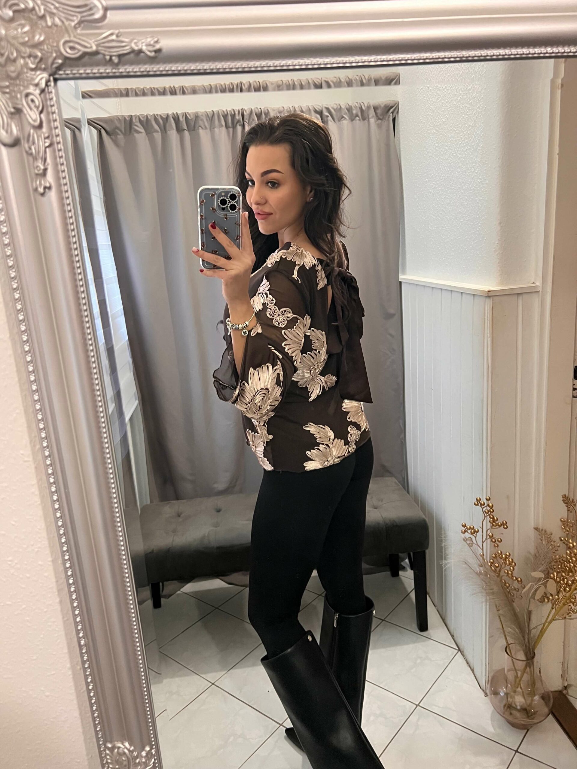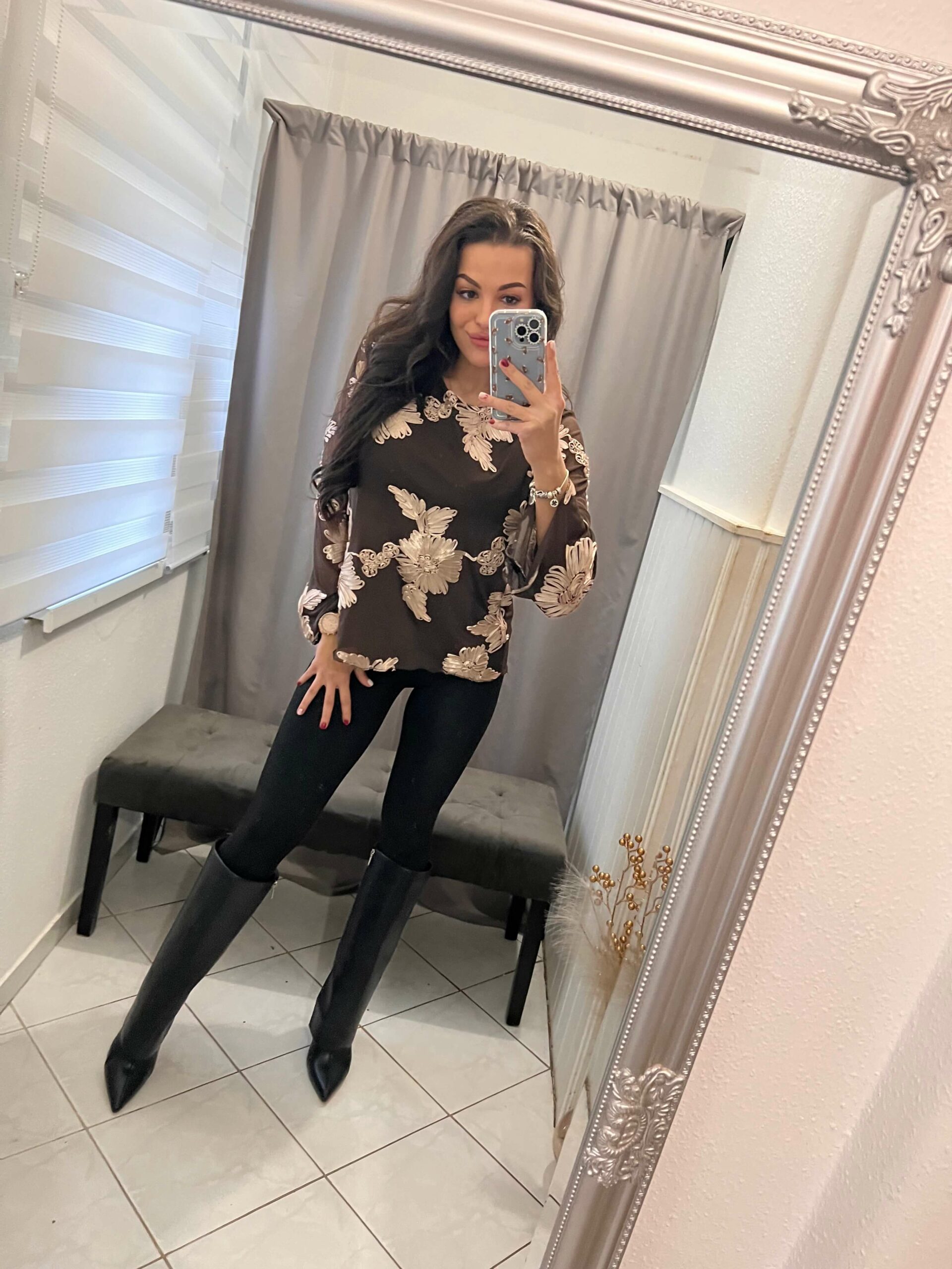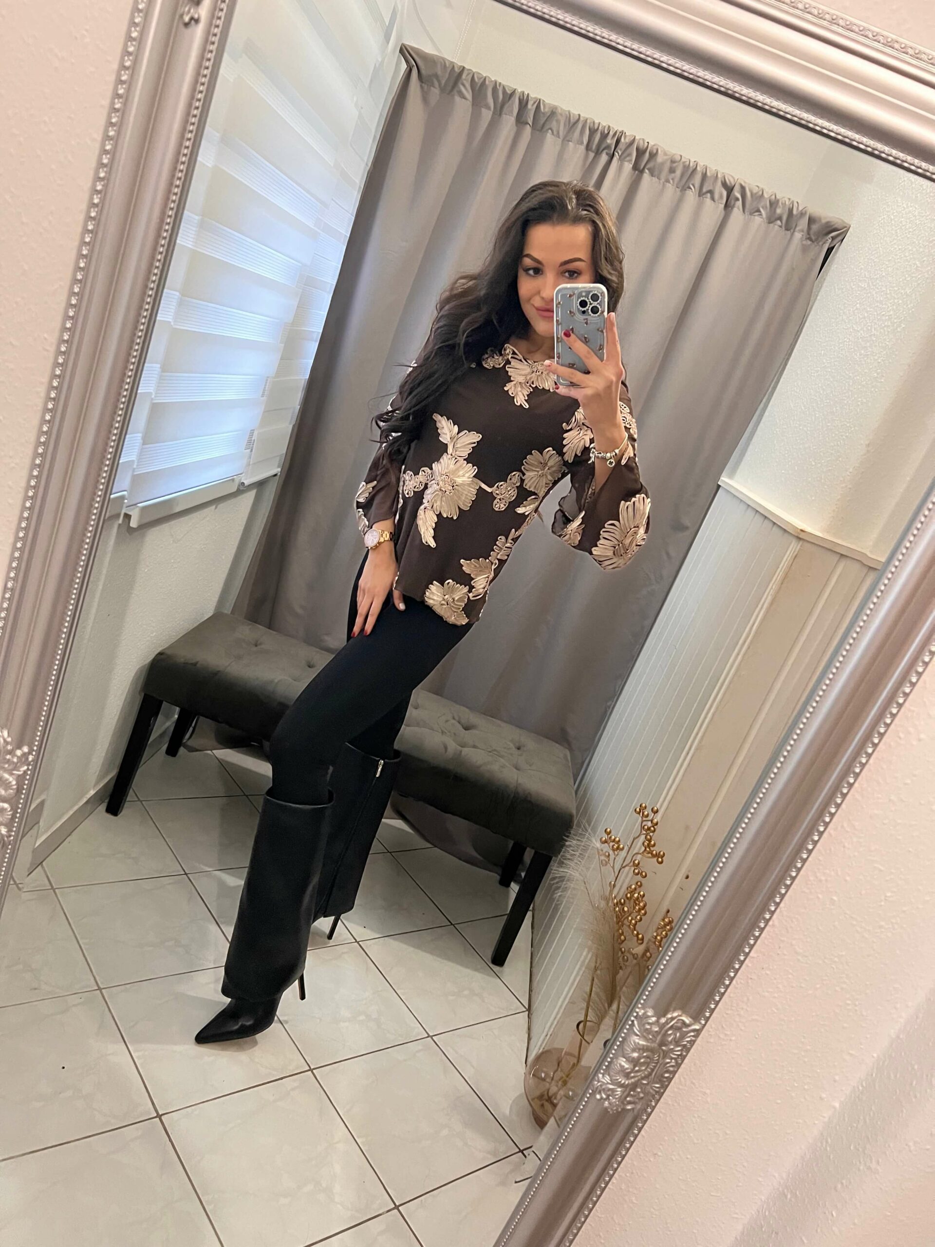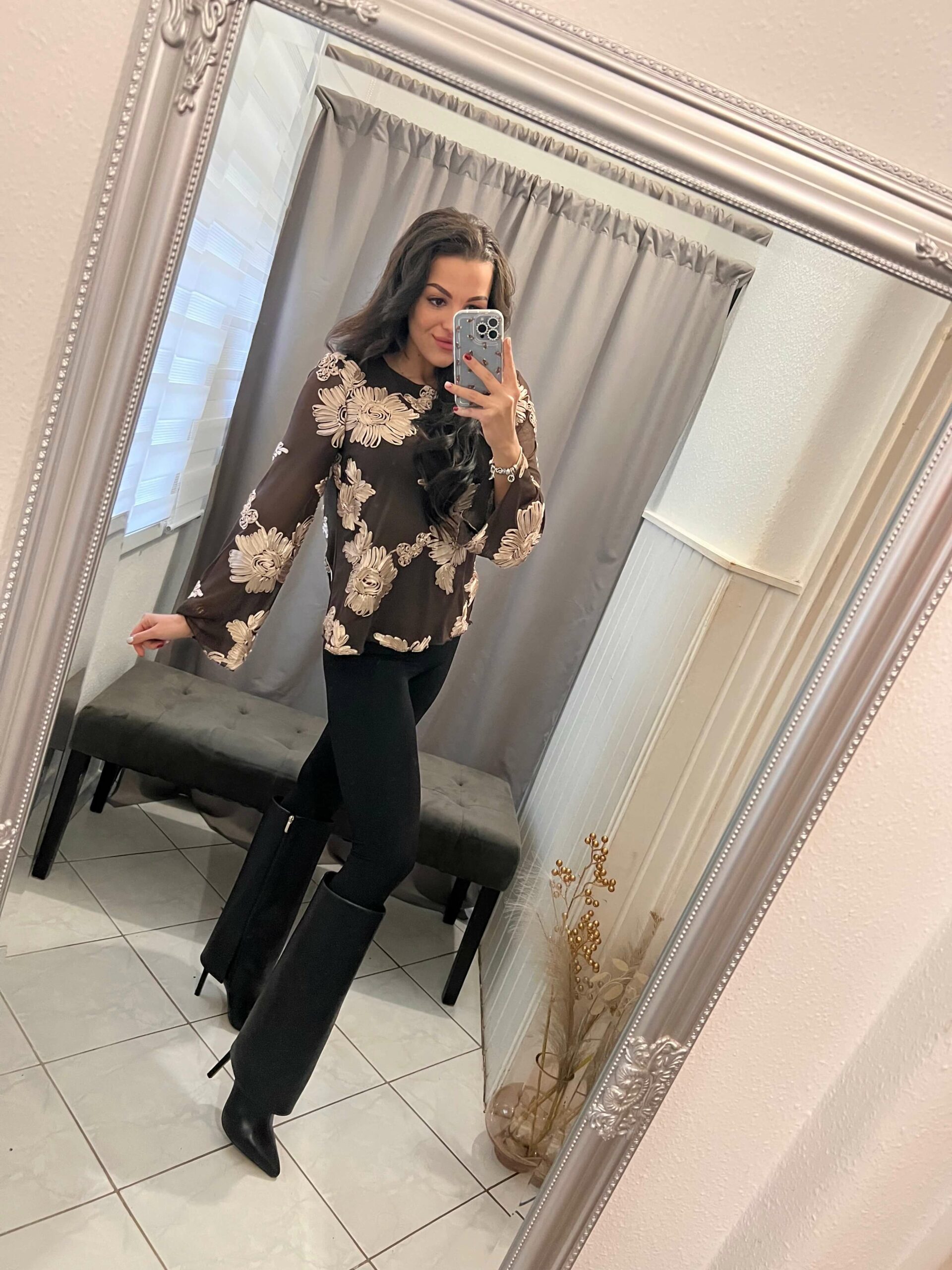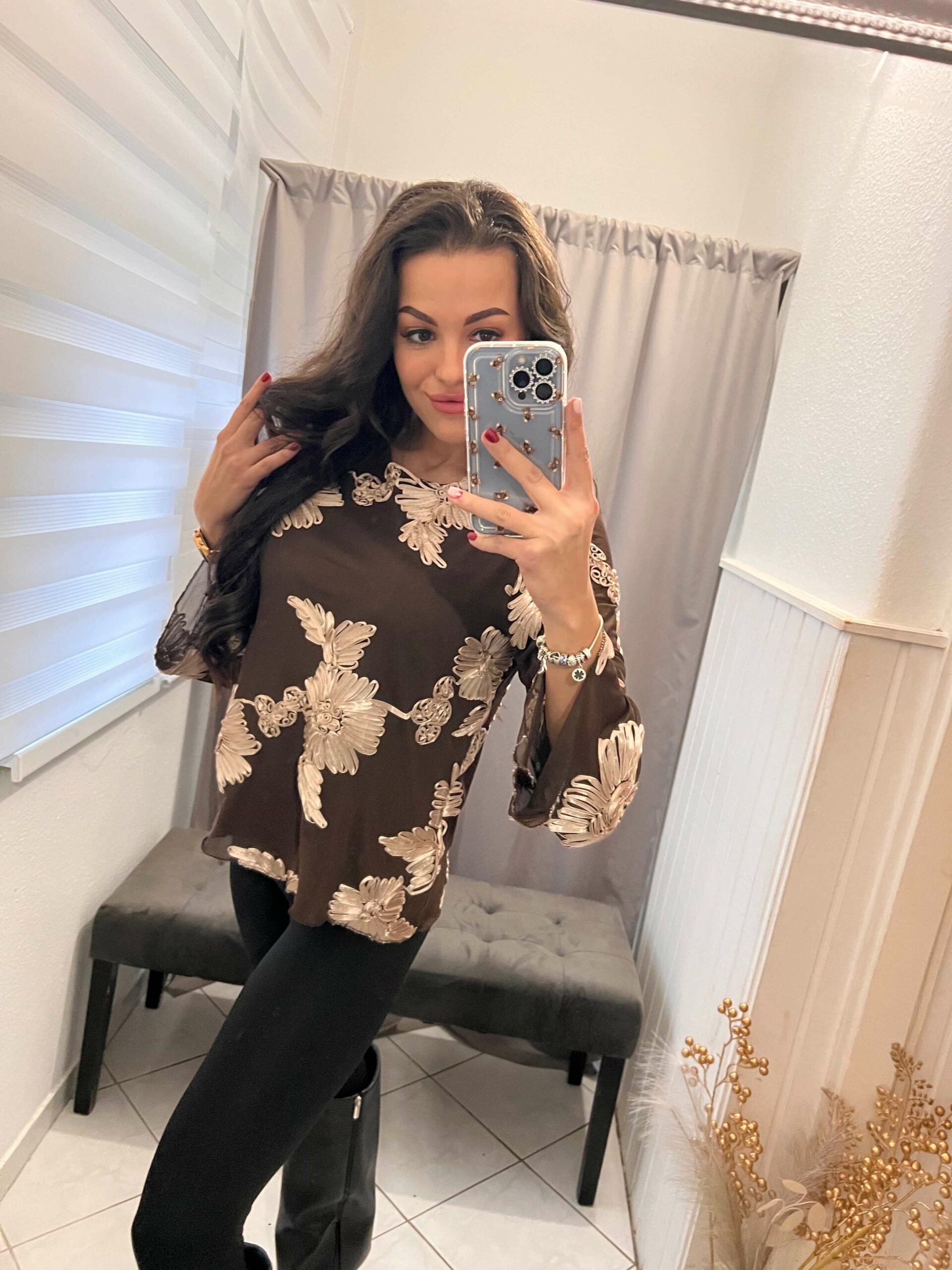 Tella tüllös virágokkal diszitett csokibarna felső.