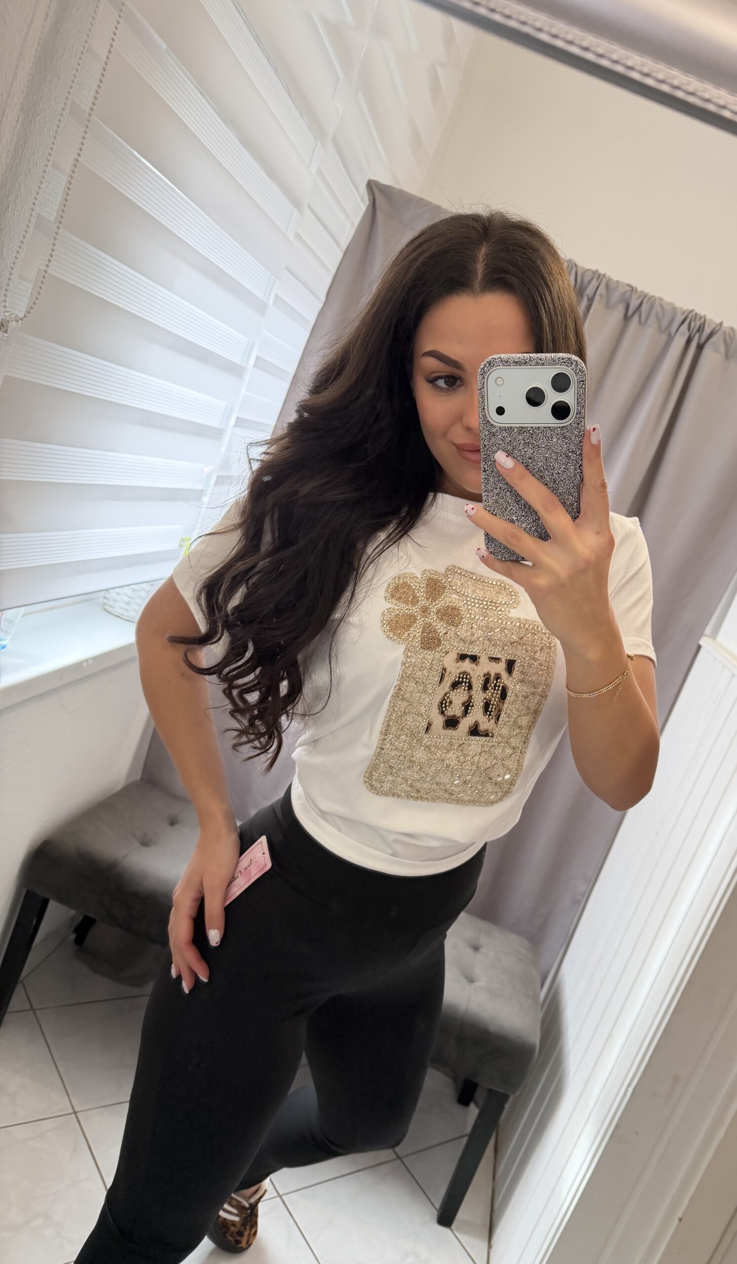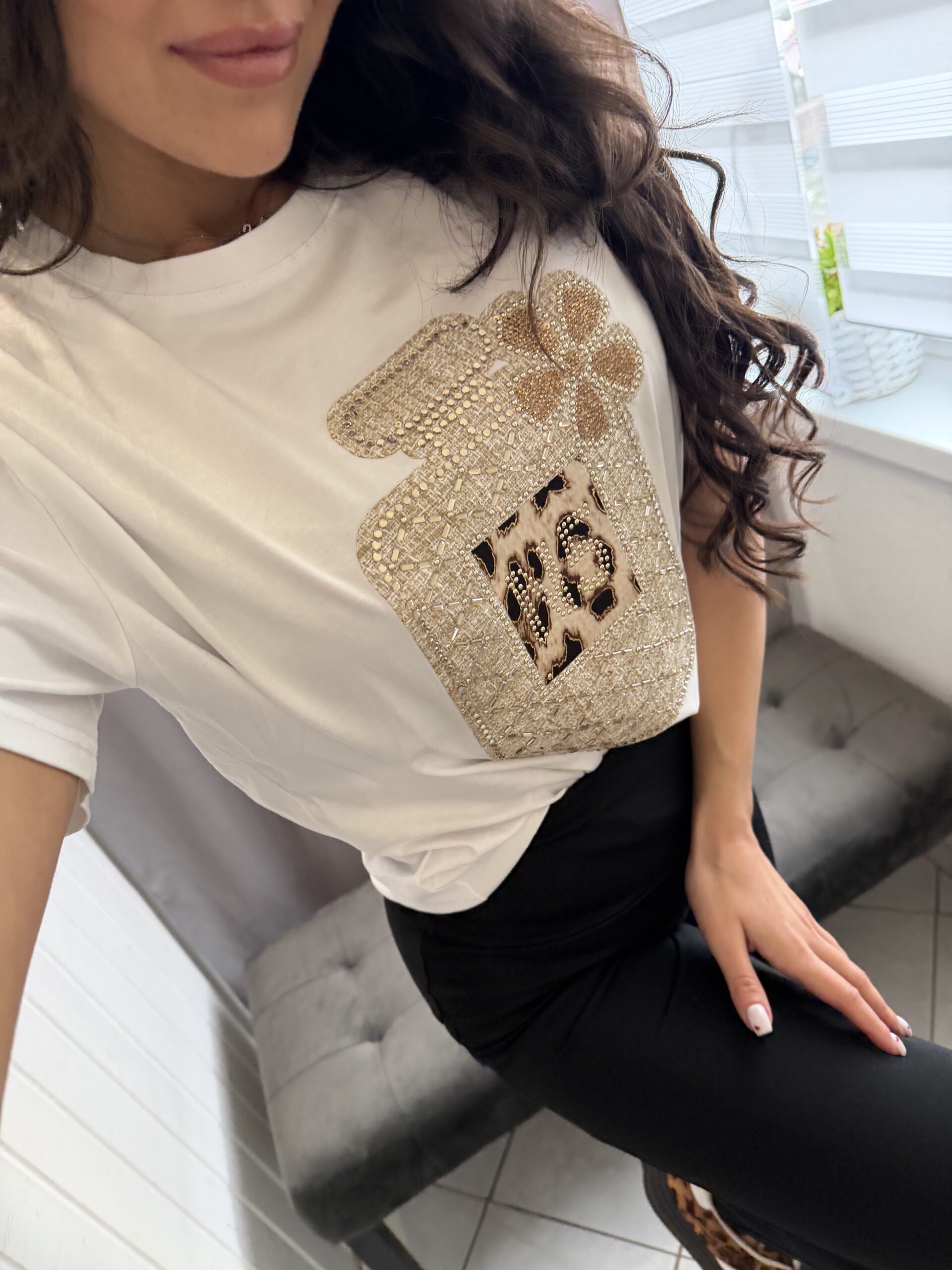 Zera rövid ujjú fehér alapon kövezett mintás felső.
