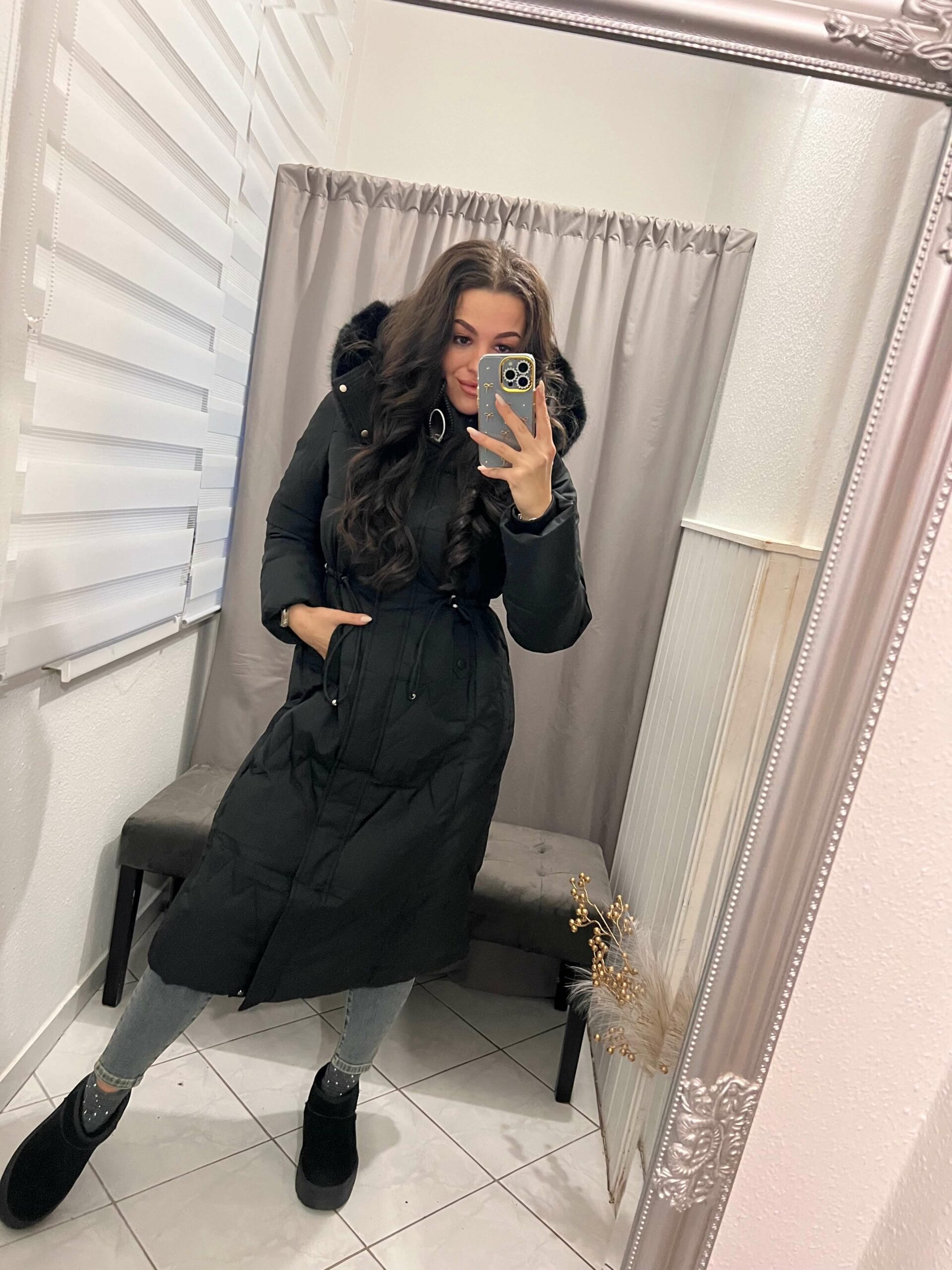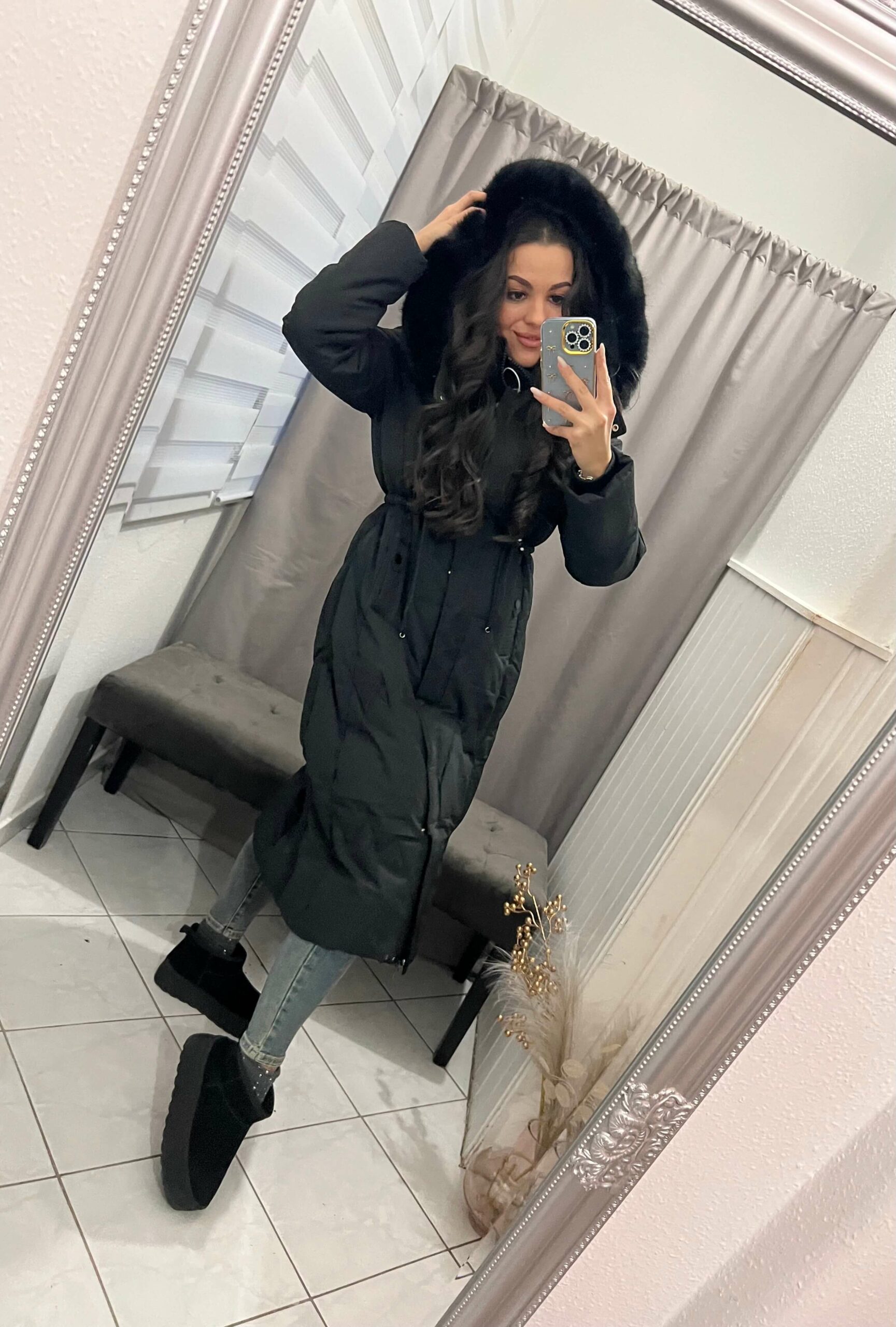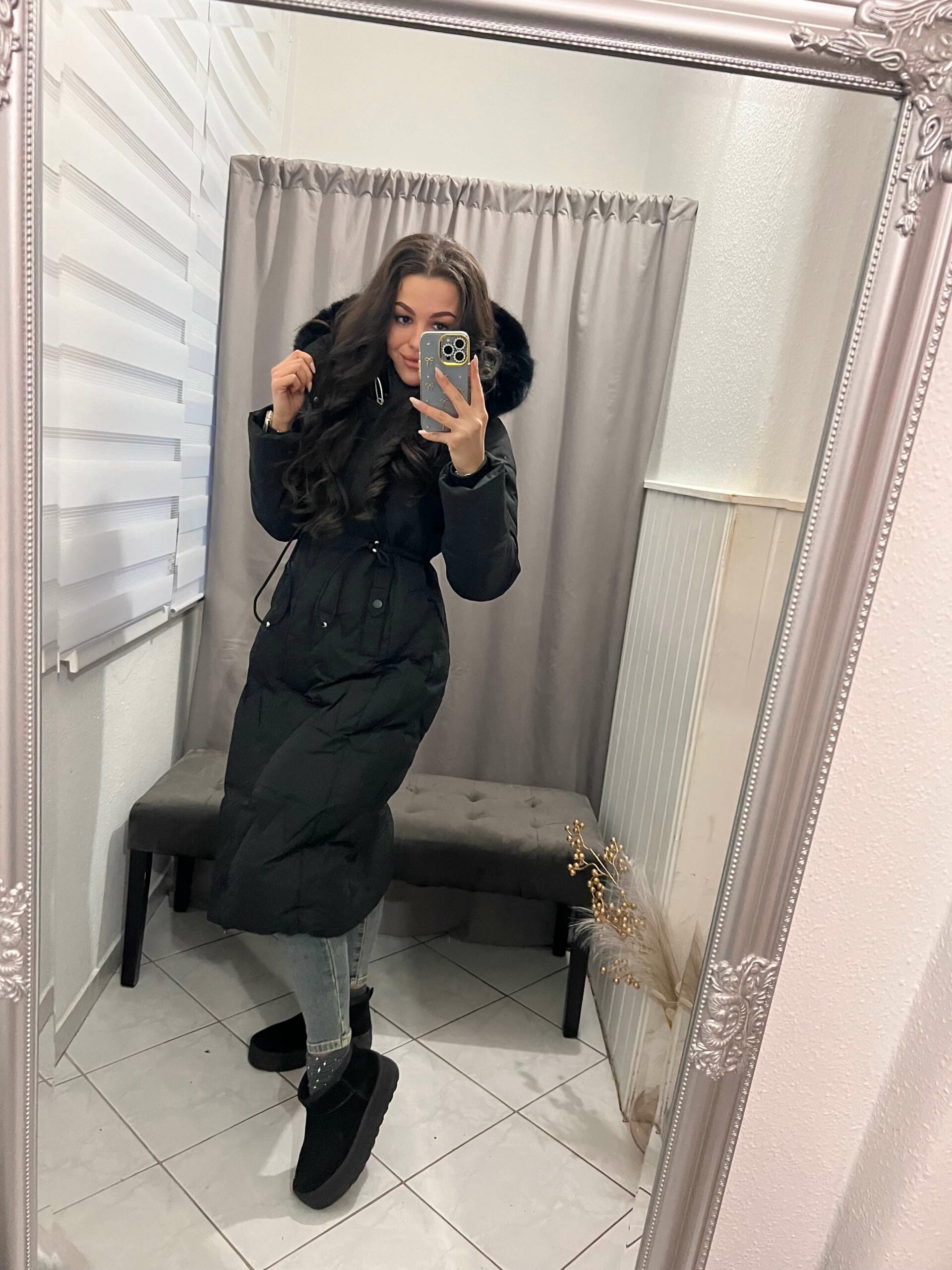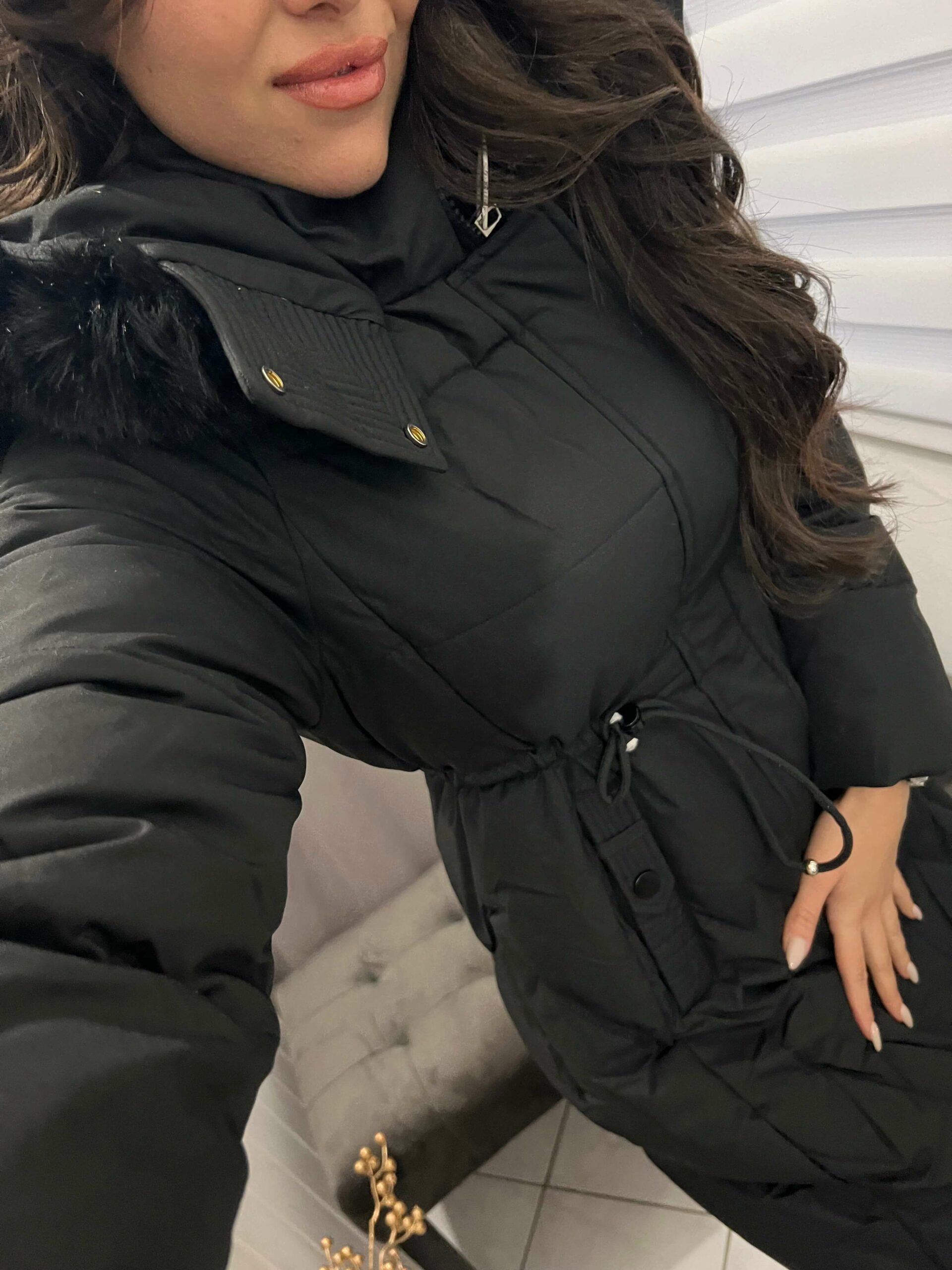 Szőrmés diszitéssel a kapucni részén amely legombolható.