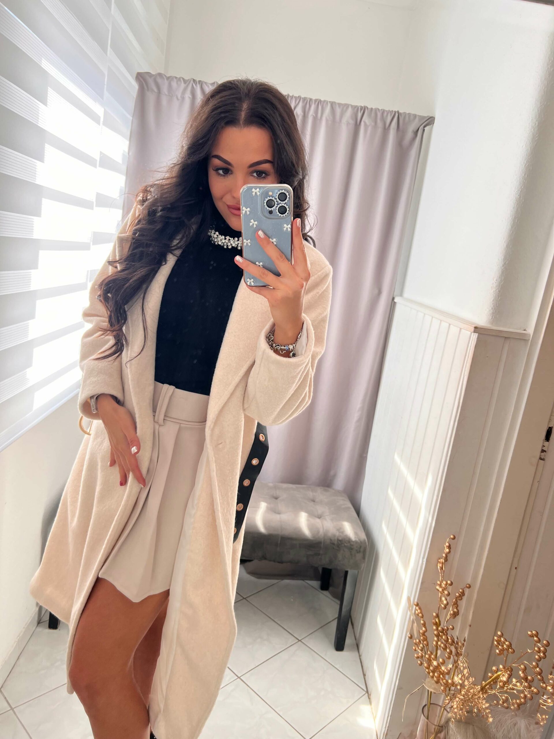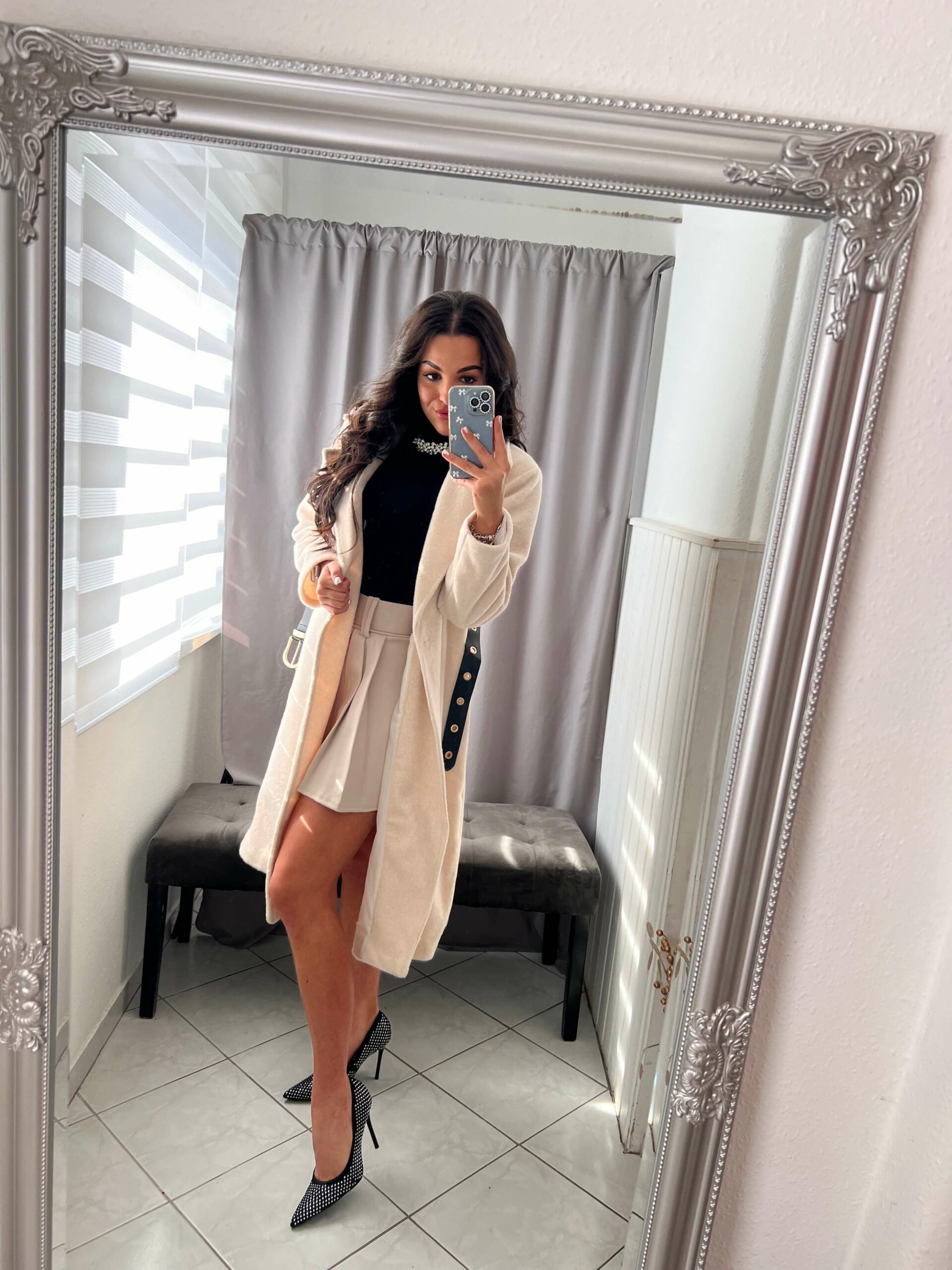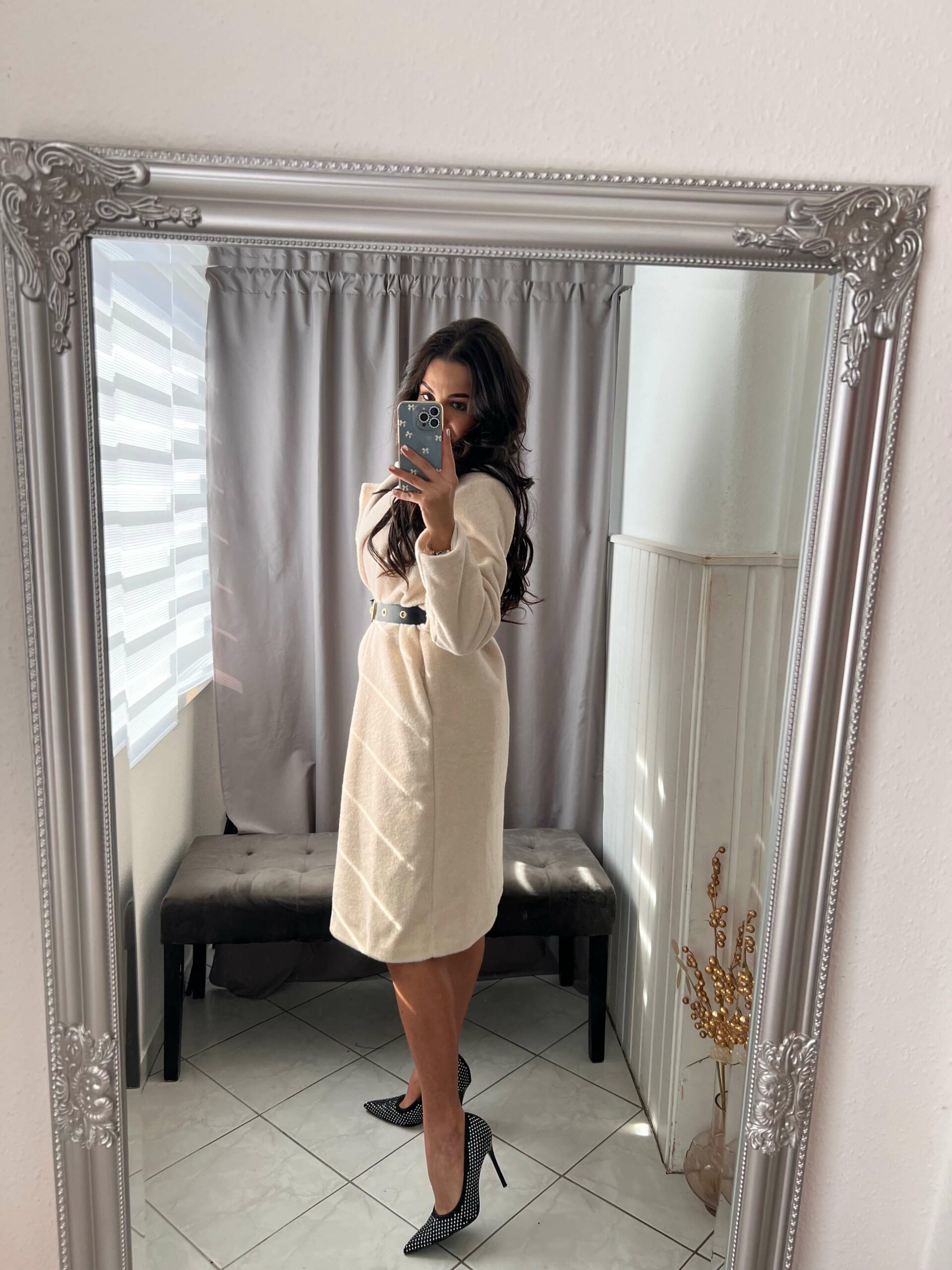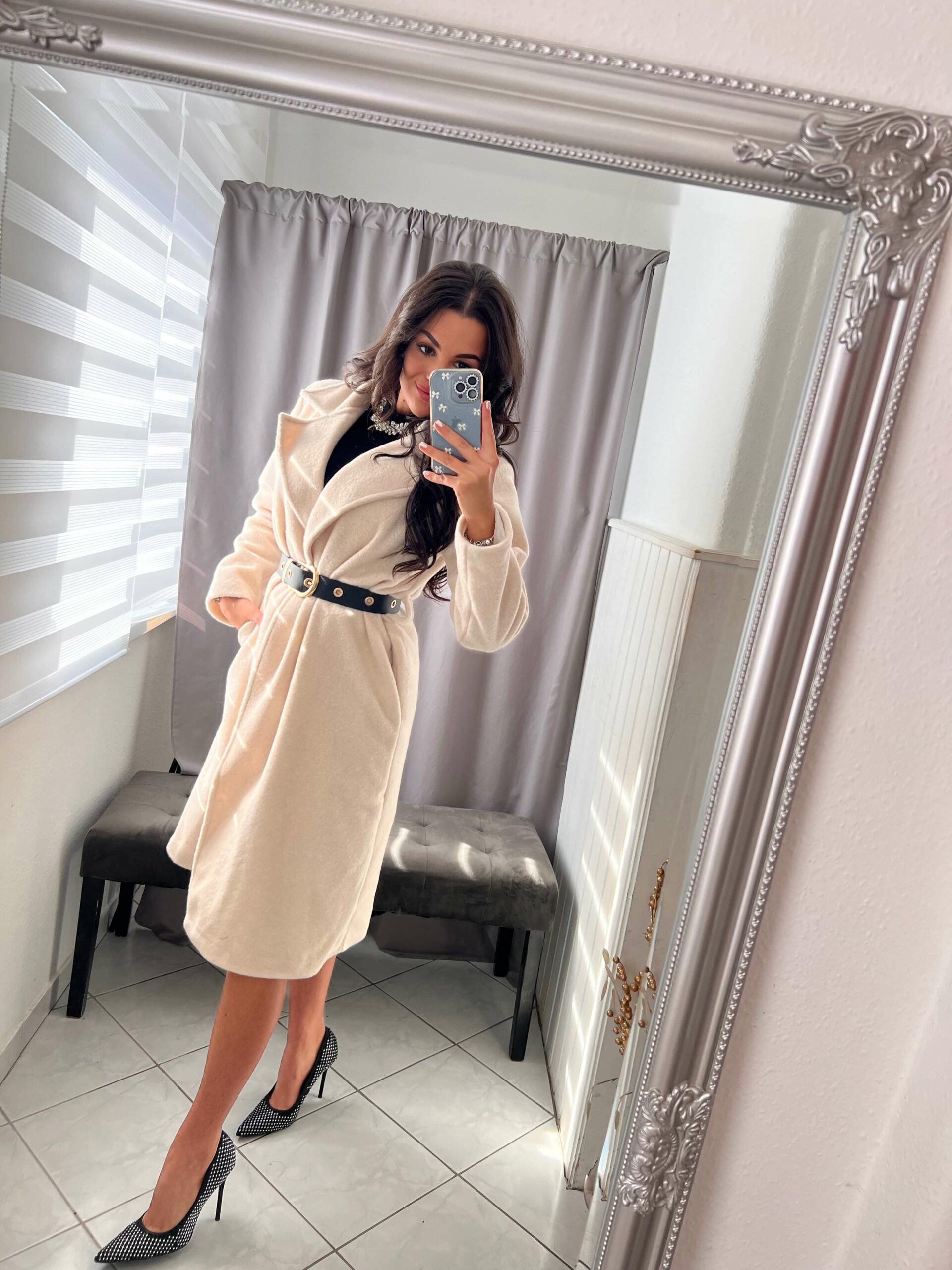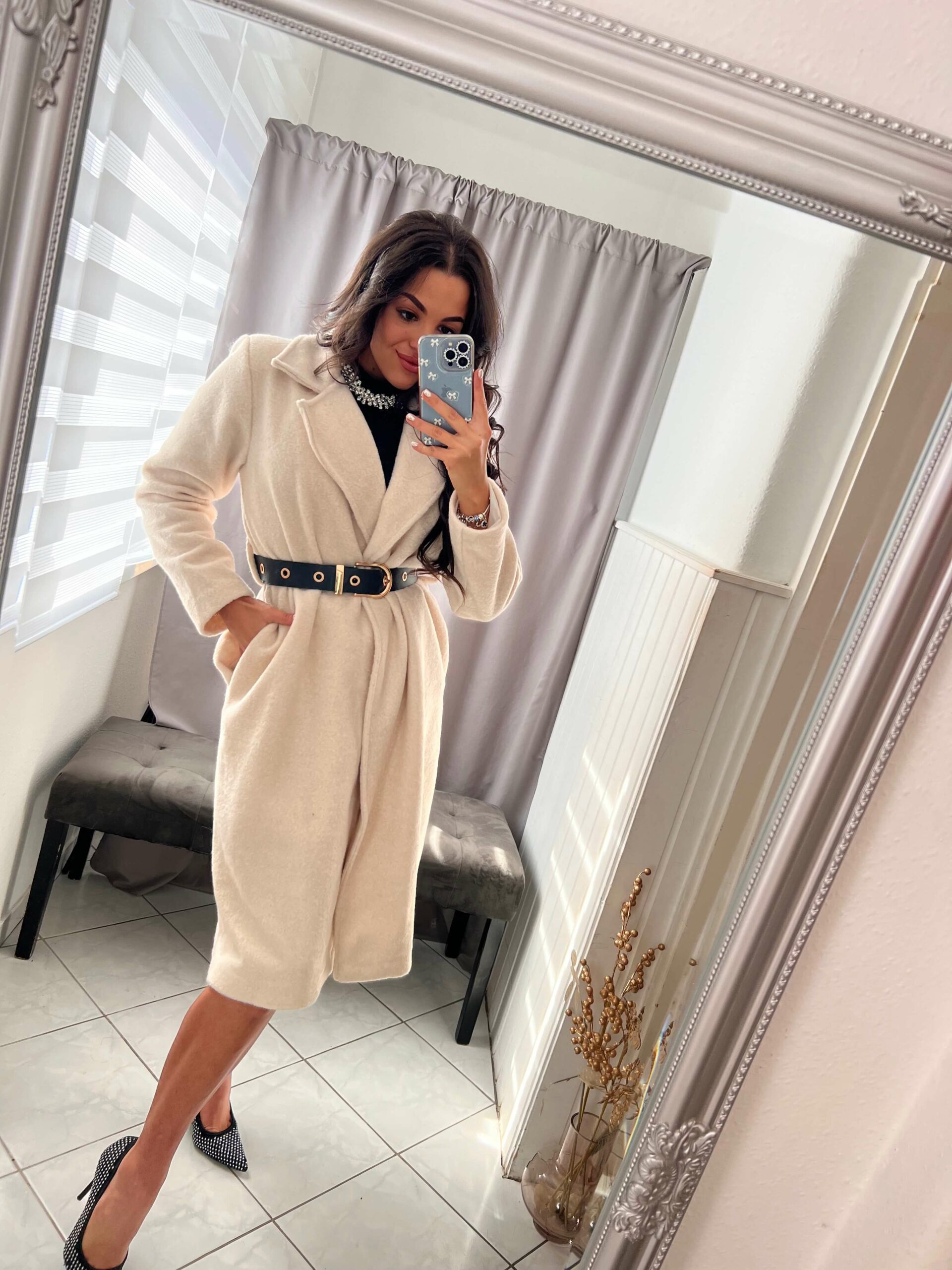 Leona szőrmés világos bézs hosszitott kabát övvel.