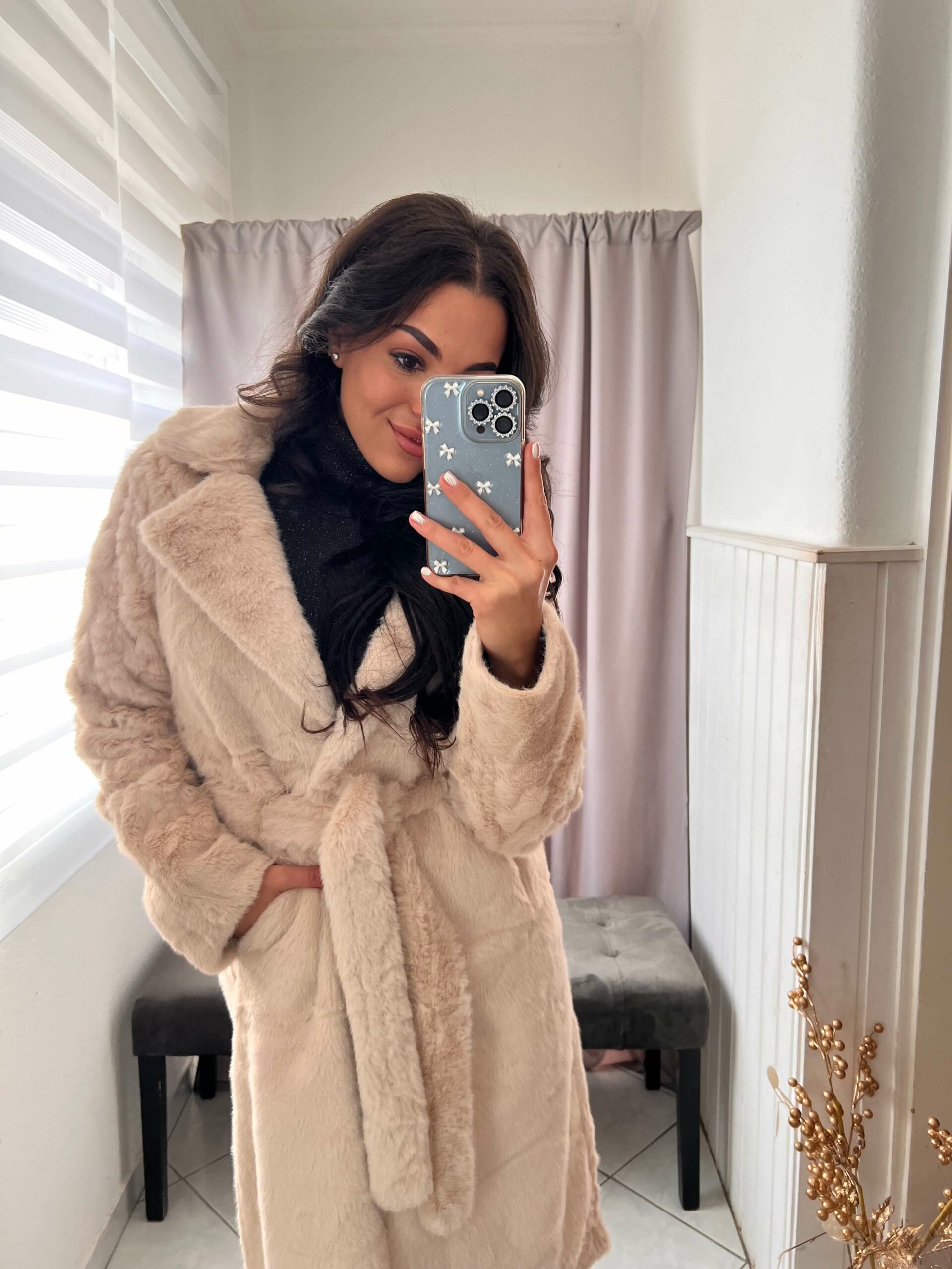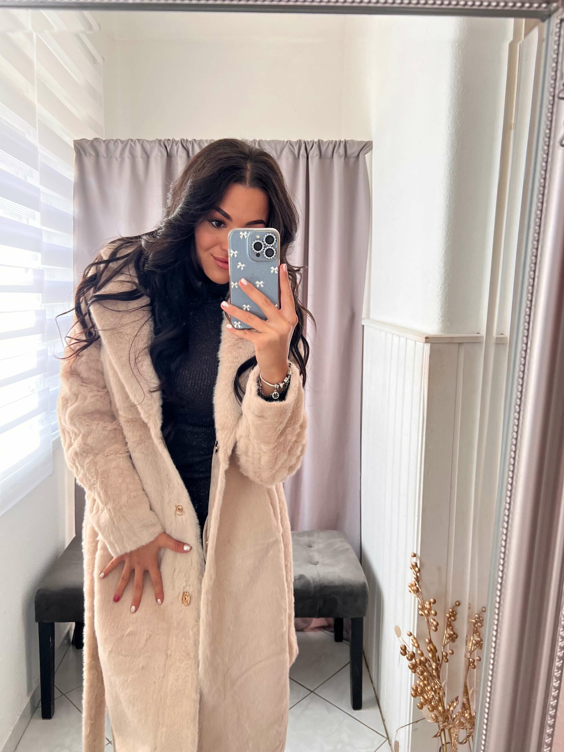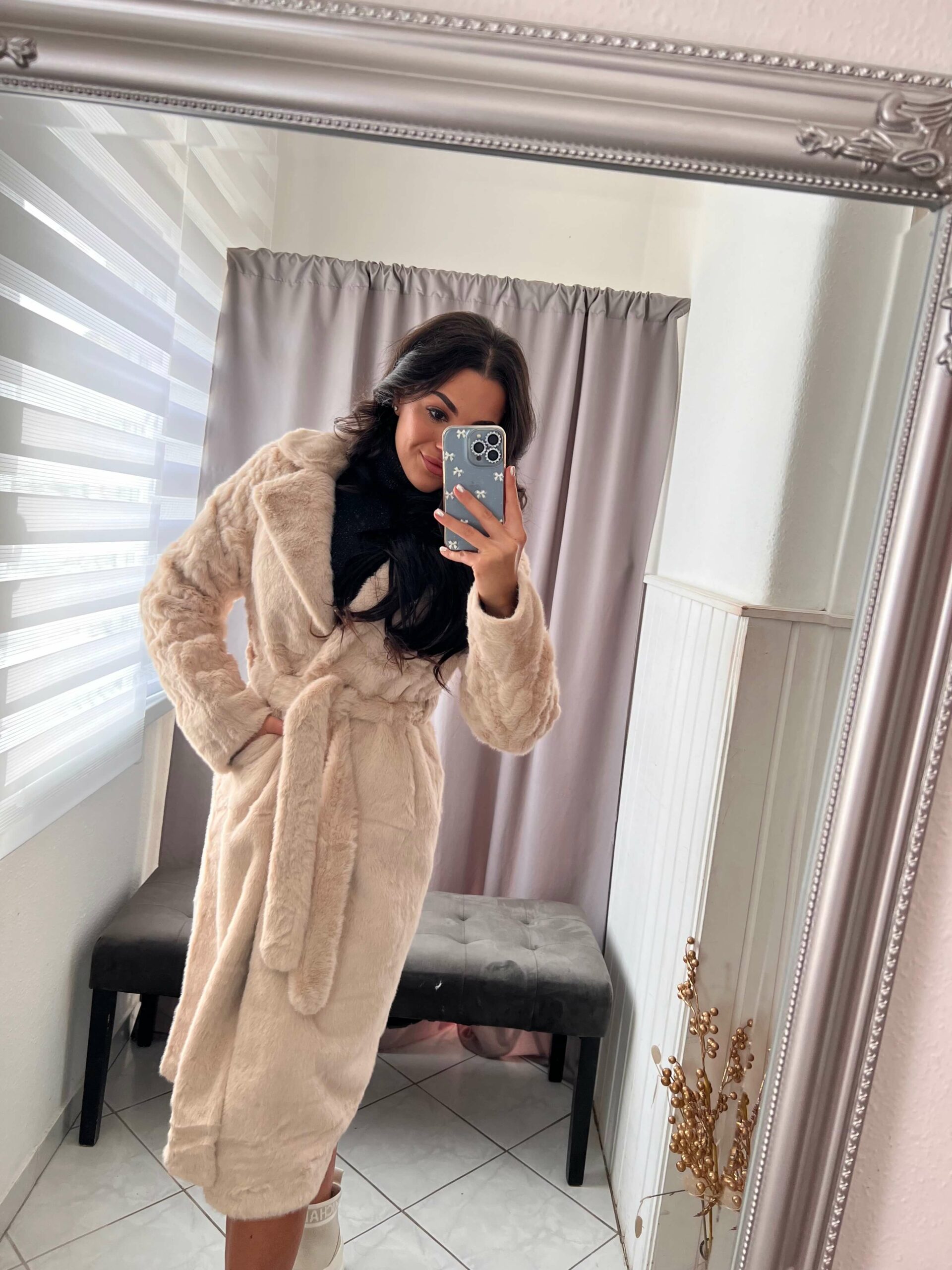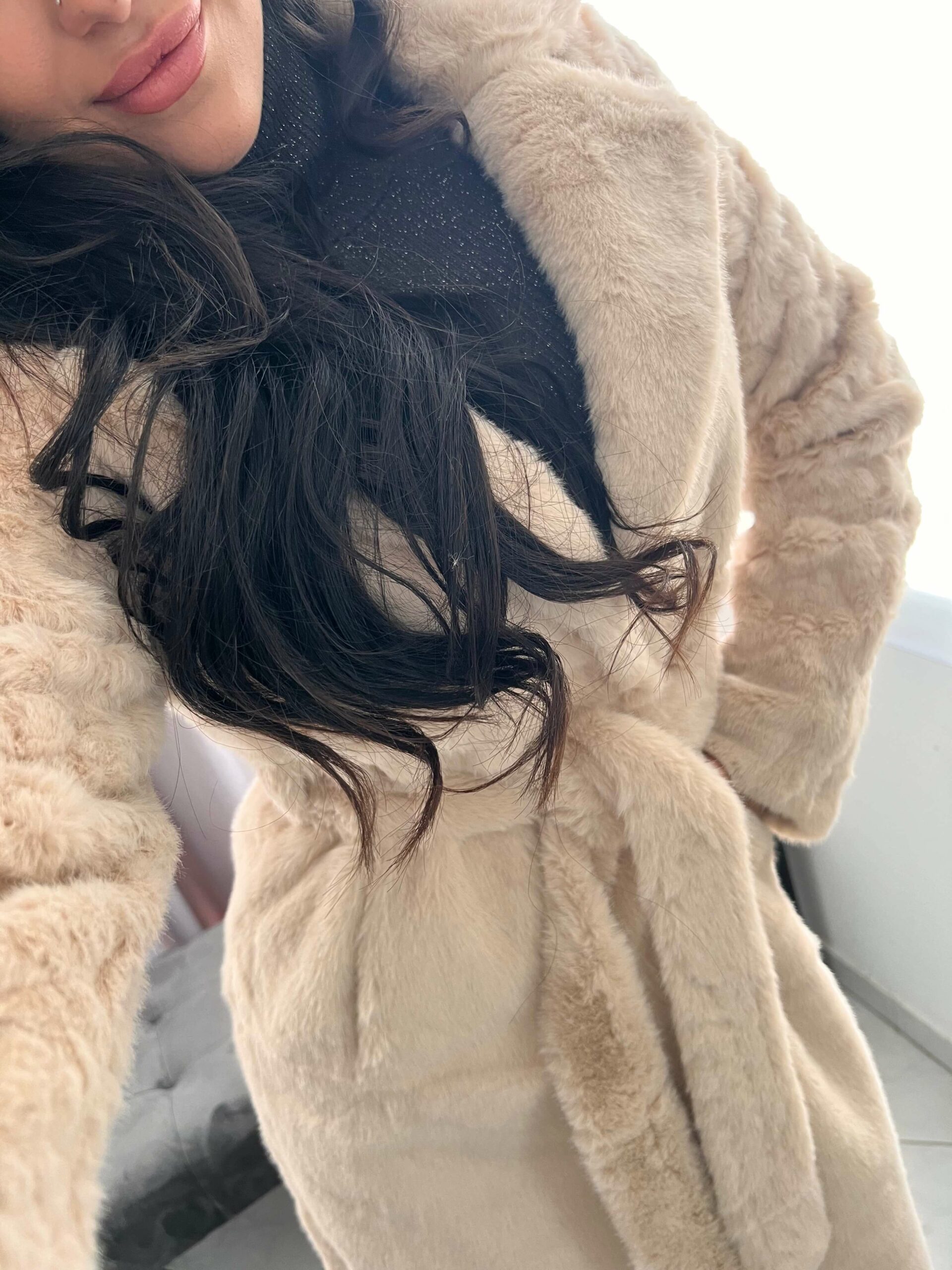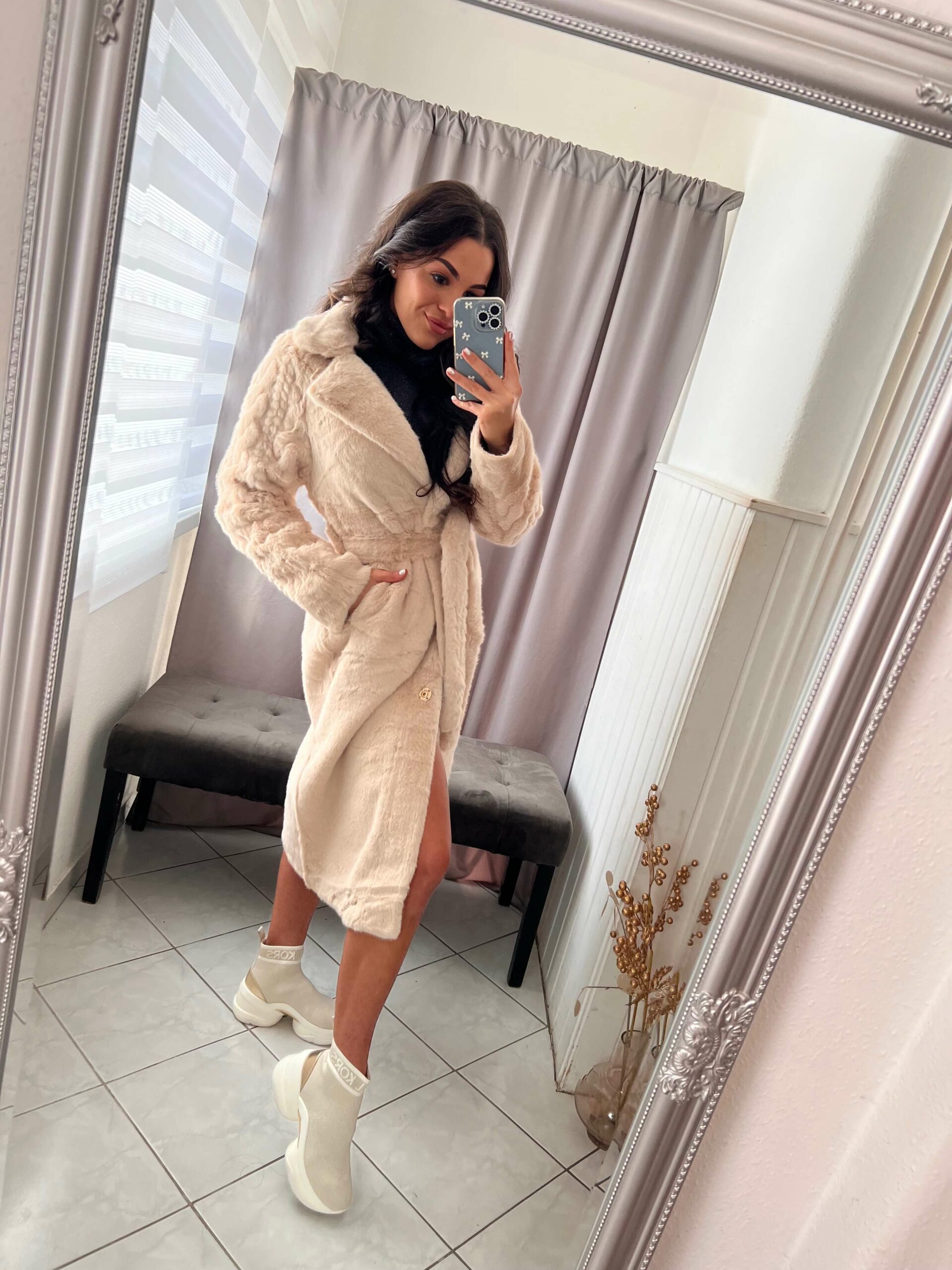 Star szőrmés maxi fazonú kötős bézs kabát.