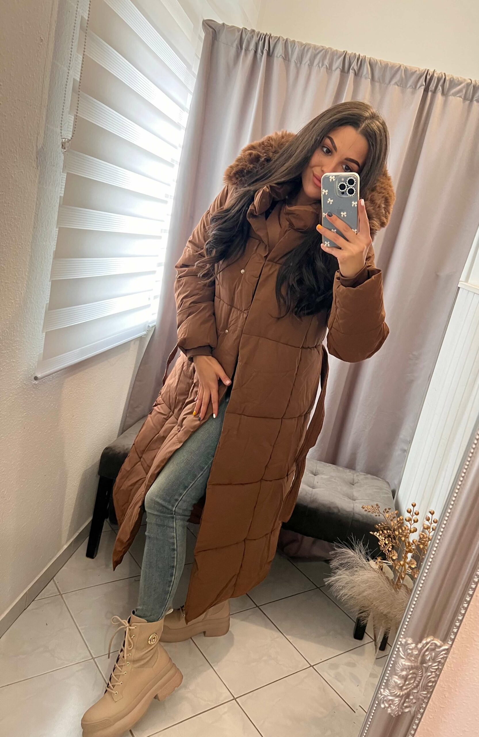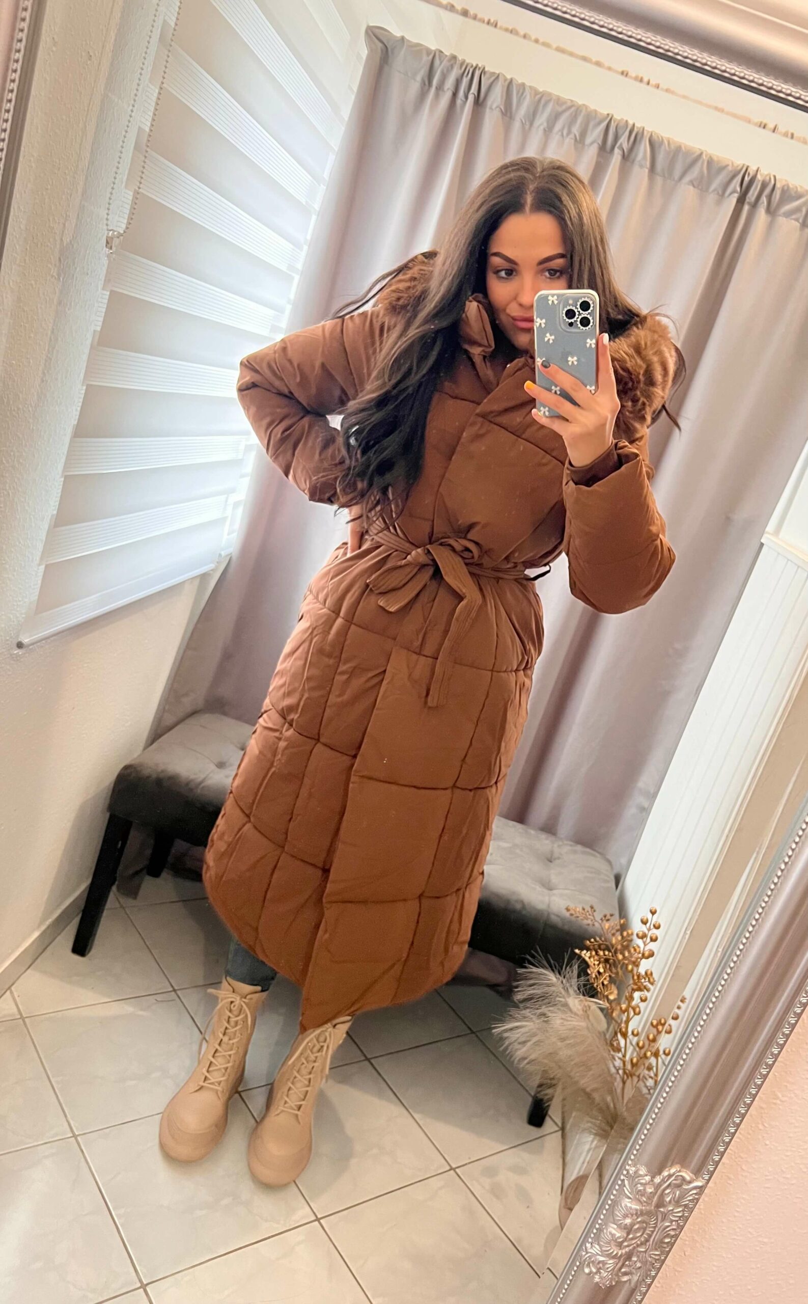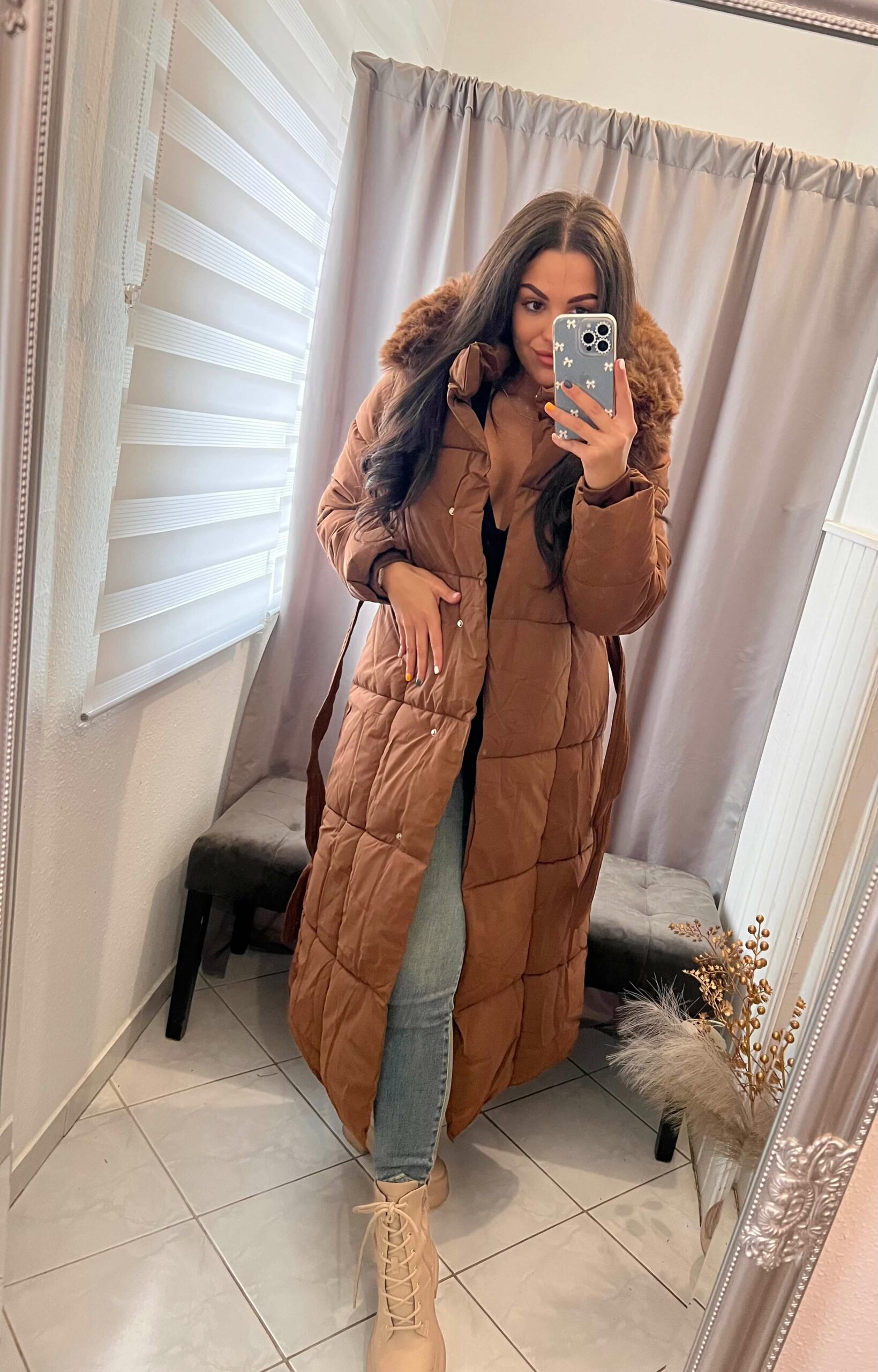 Welli barna szőrmés kapucnis steppelt téli kabát.