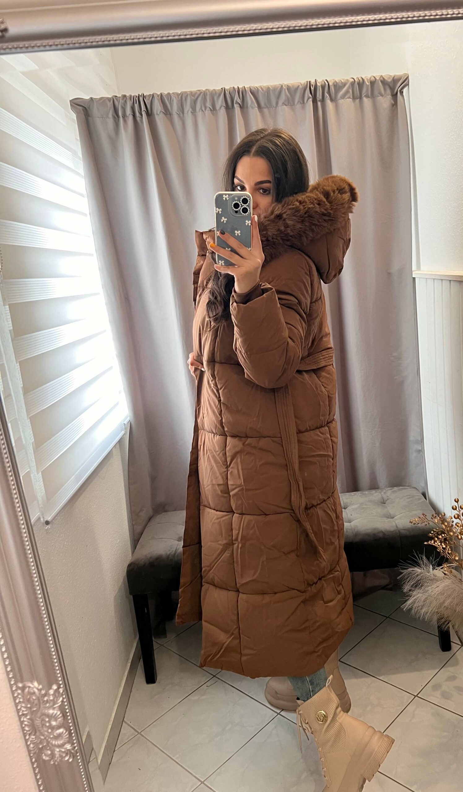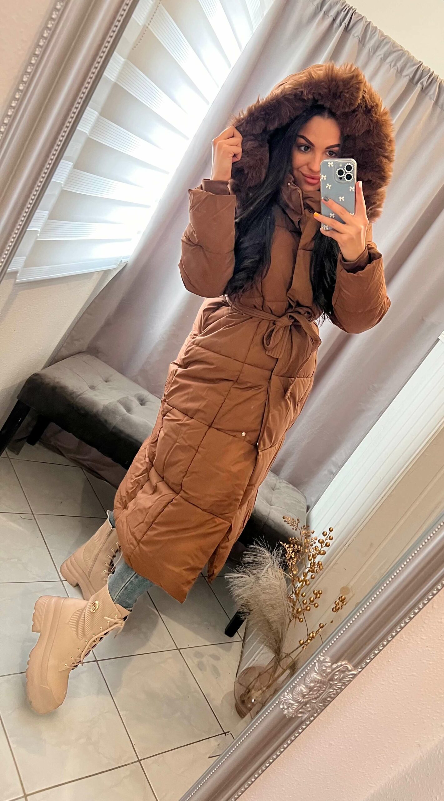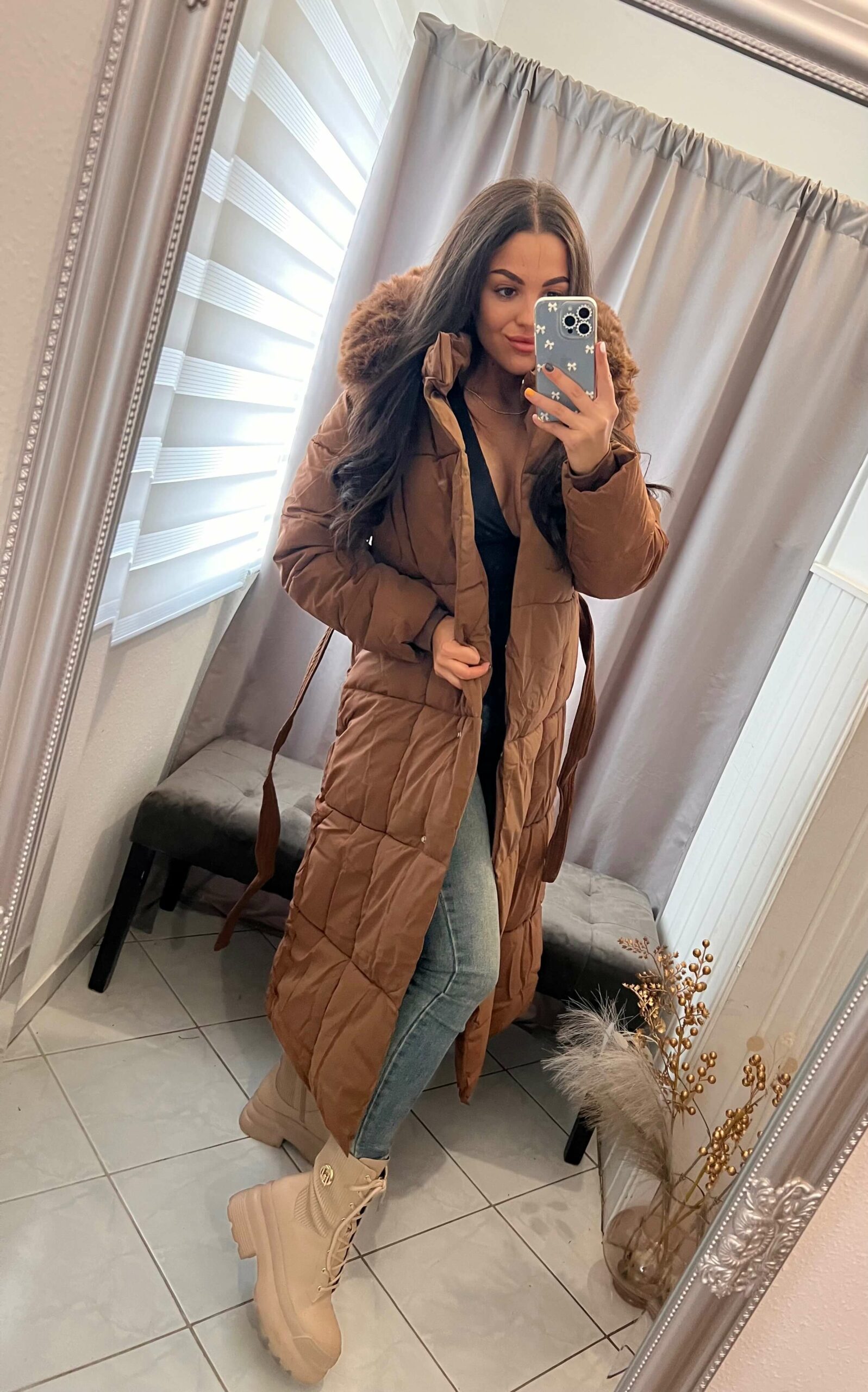Welli barna szőrmés kapucnis steppelt téli kabát.