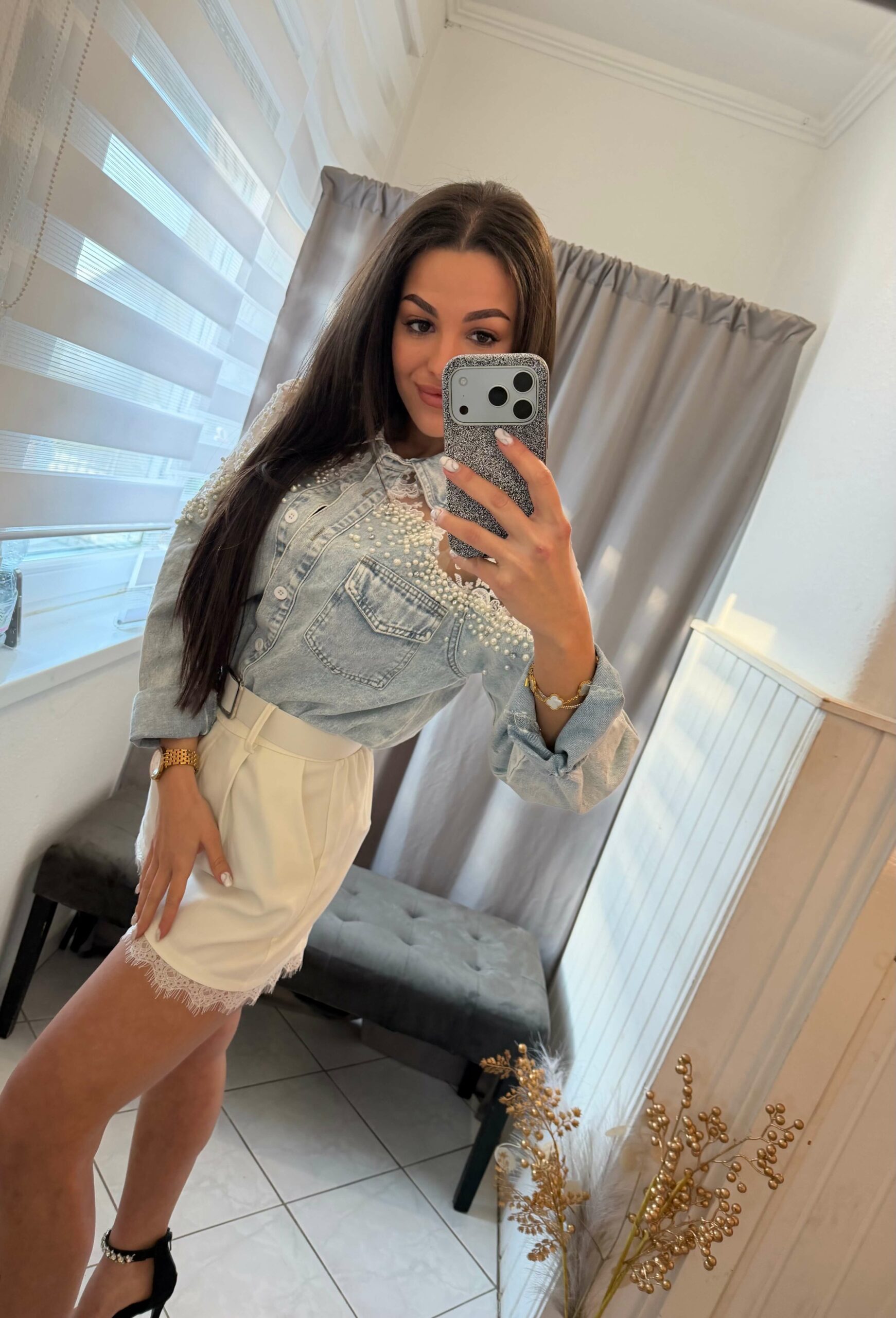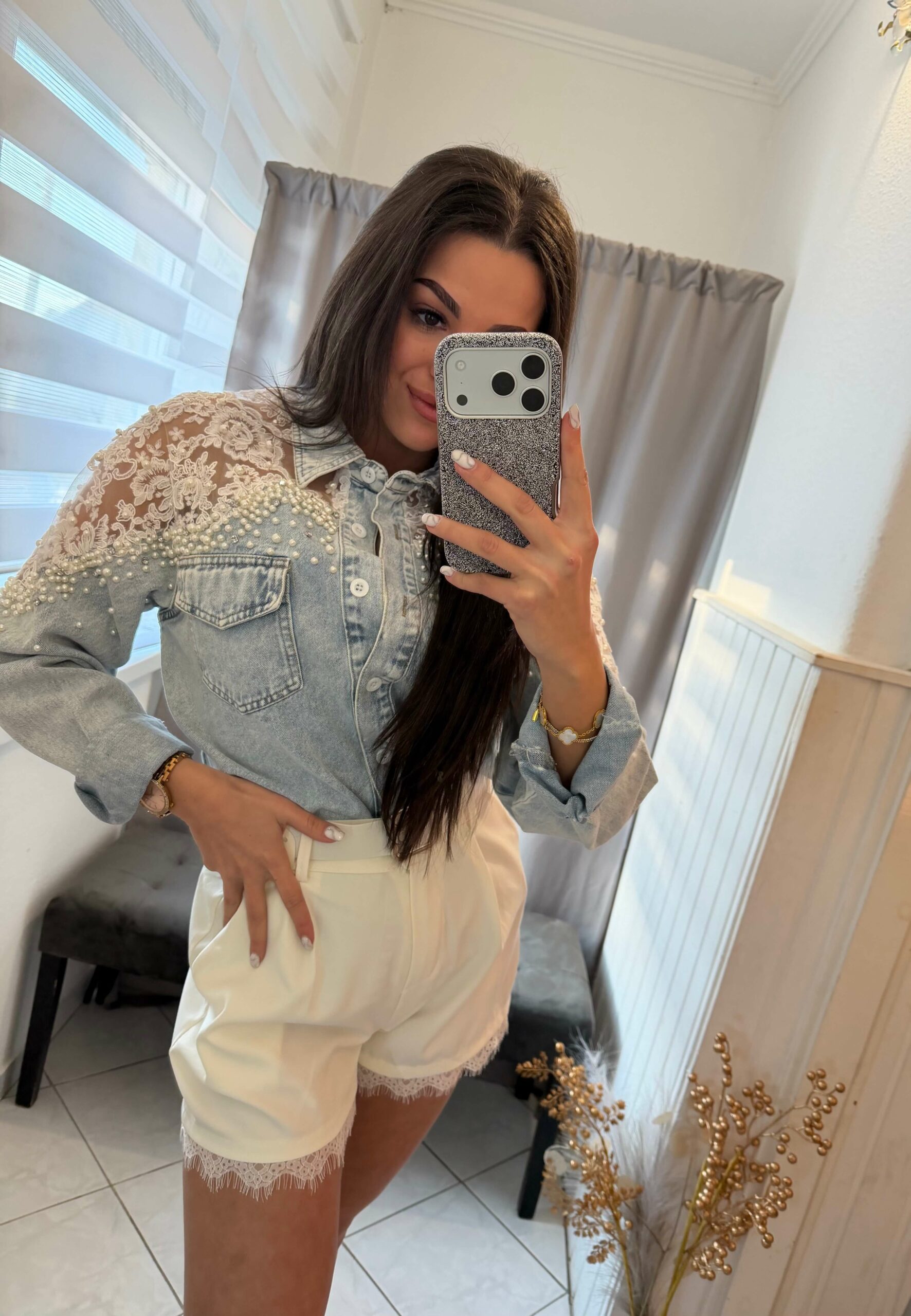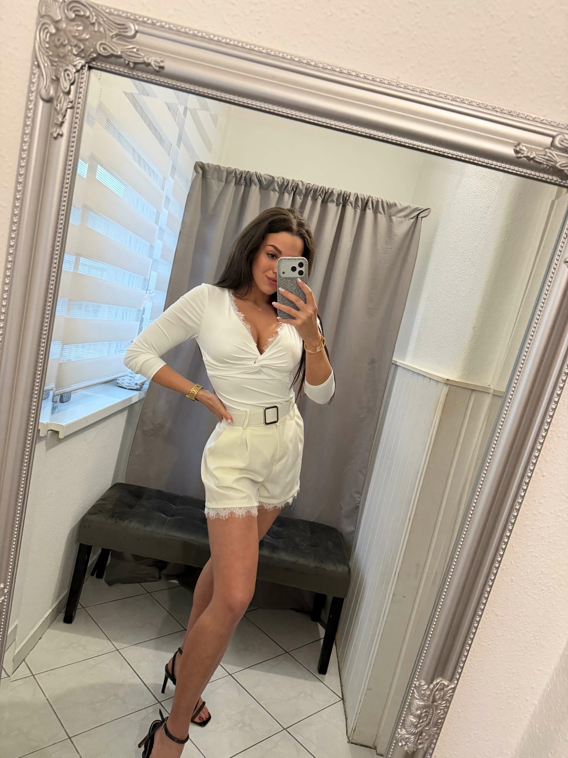 Dolen csipkével diszitett bézs rövid nadrág.