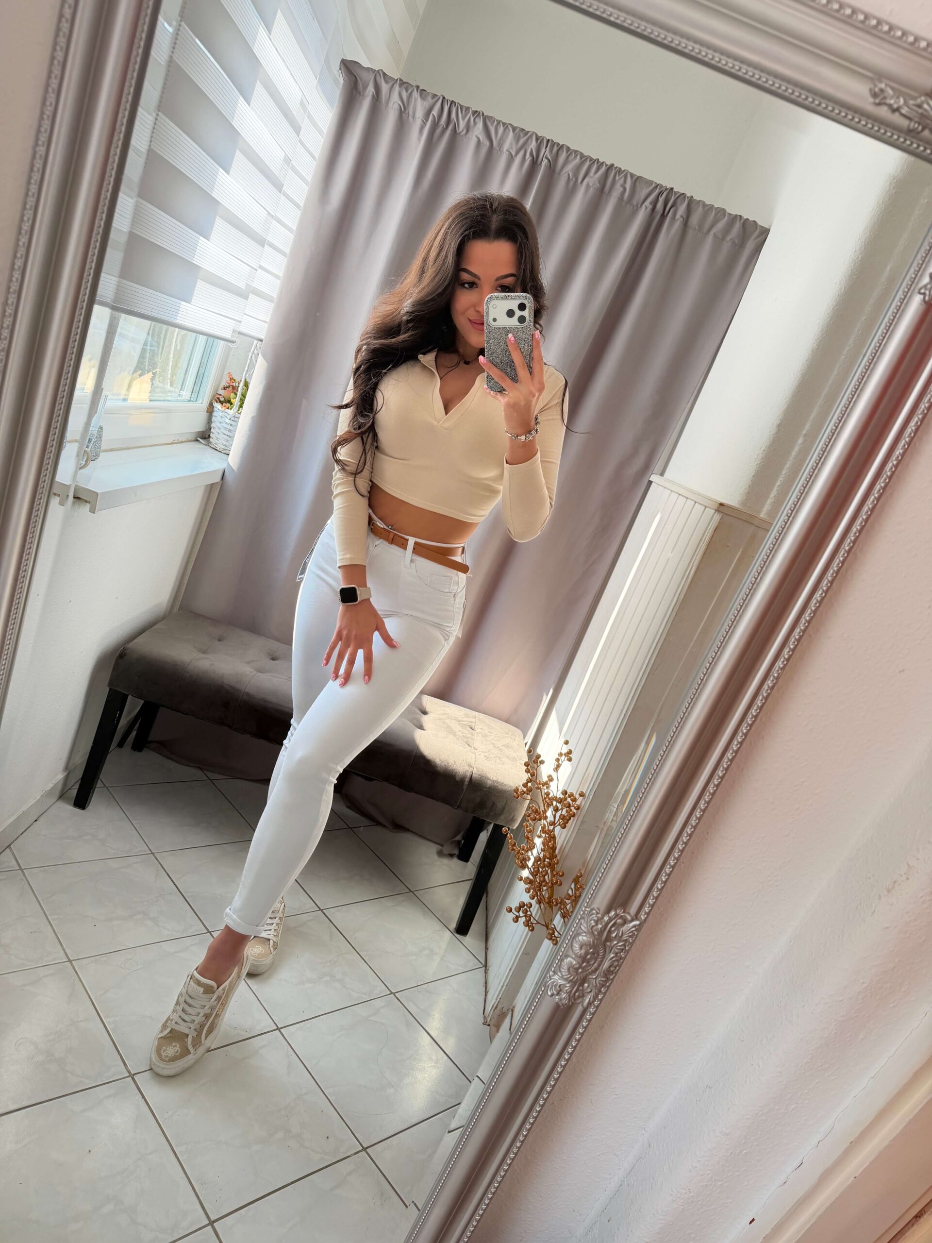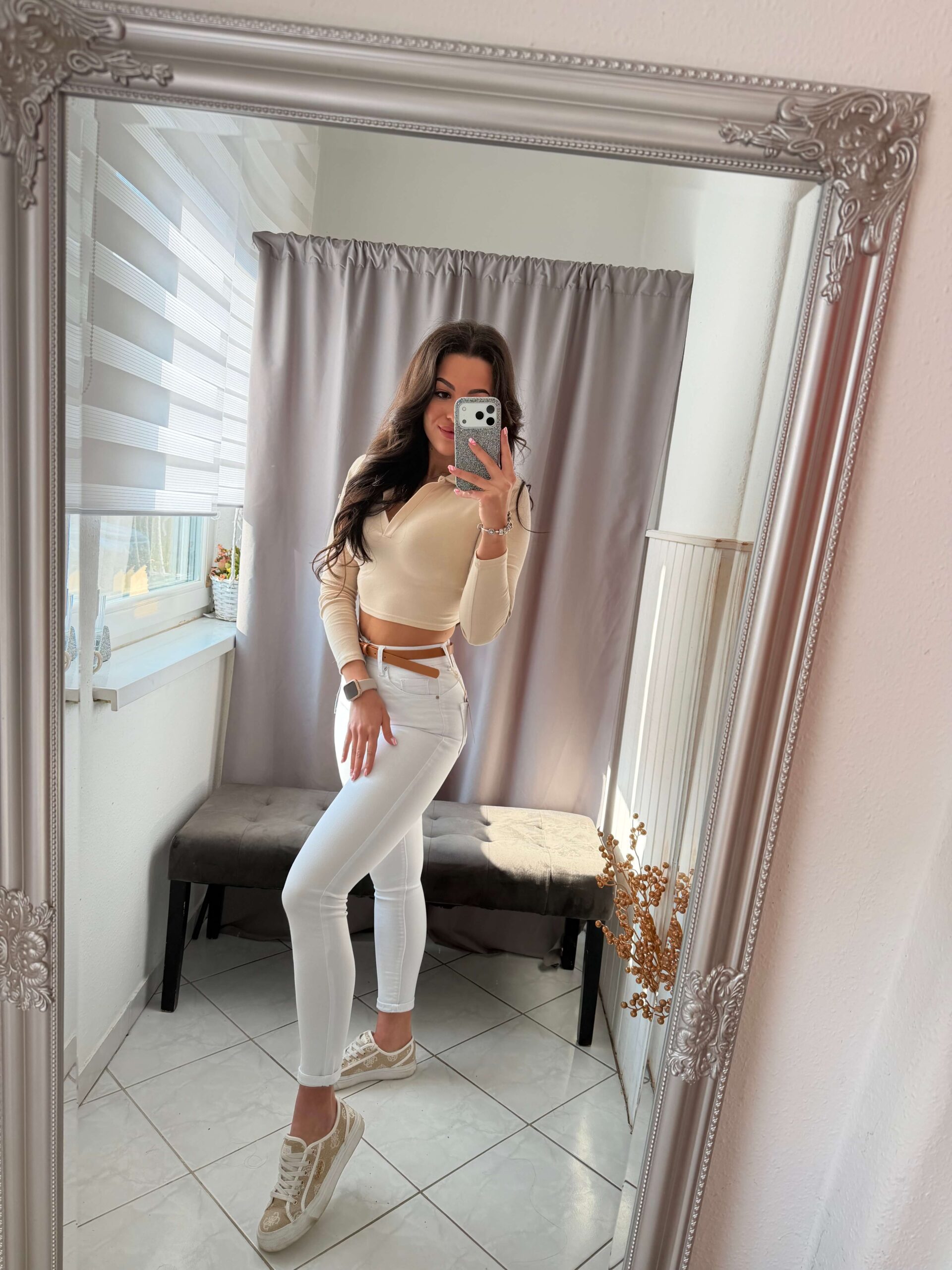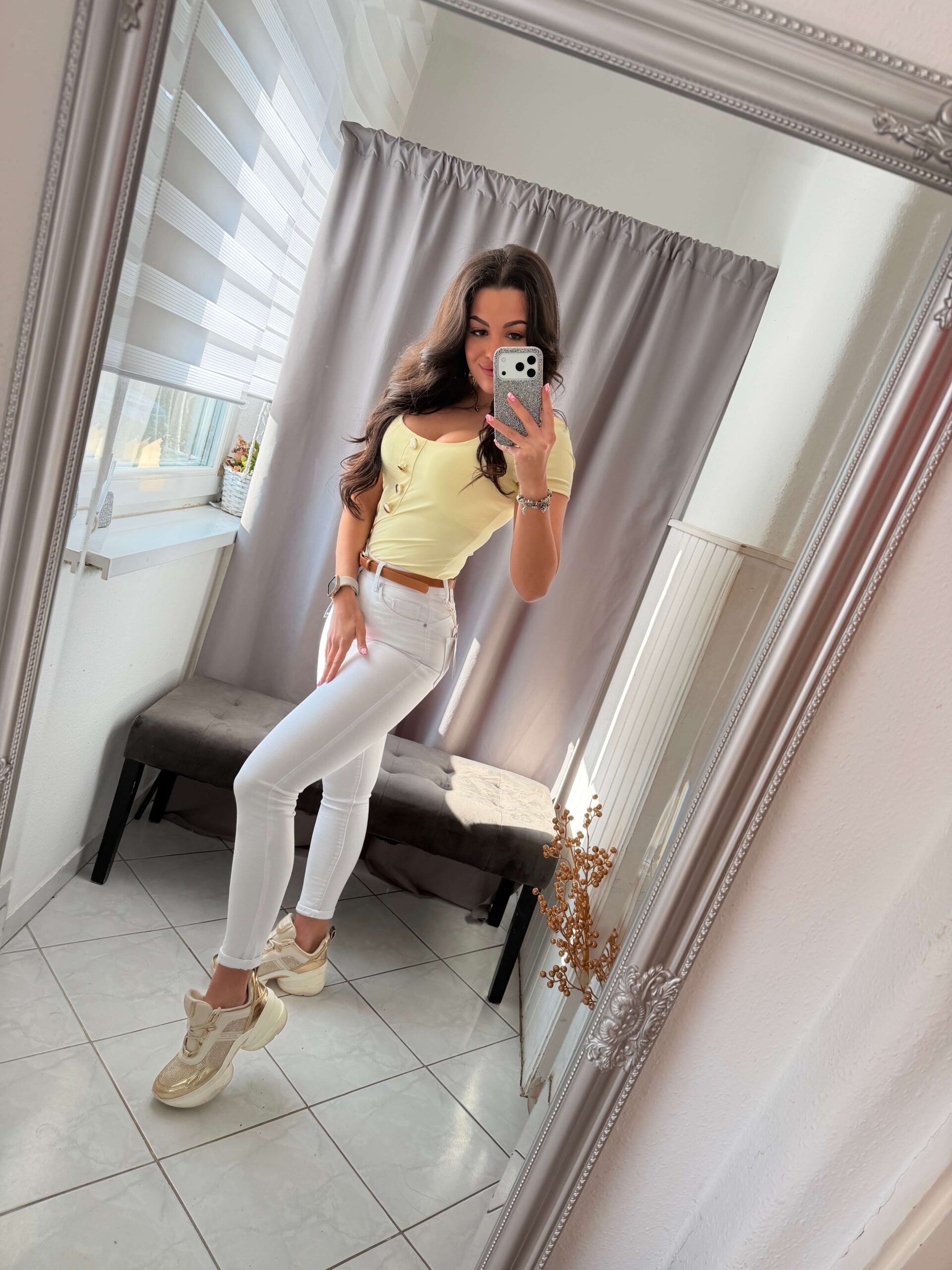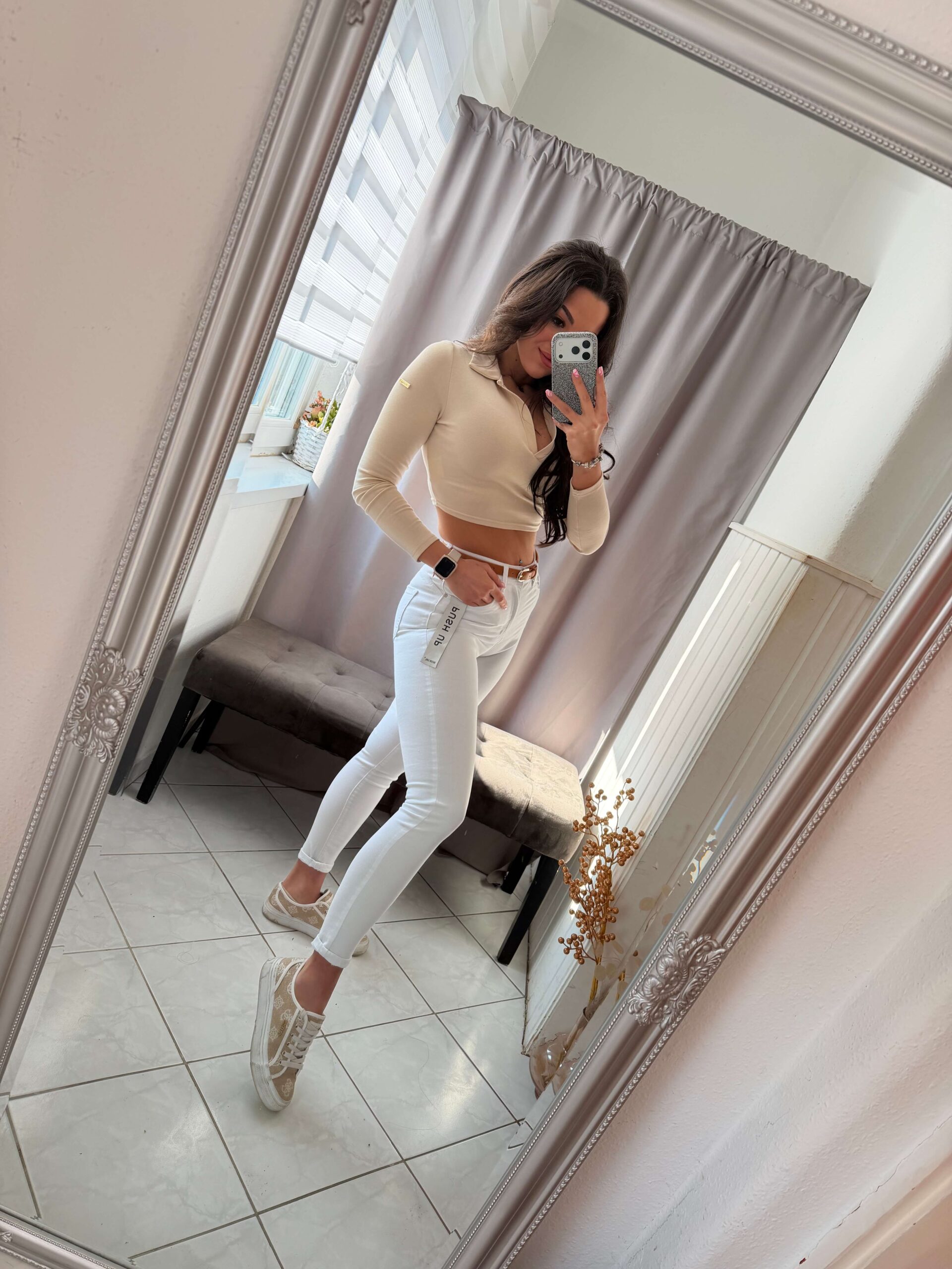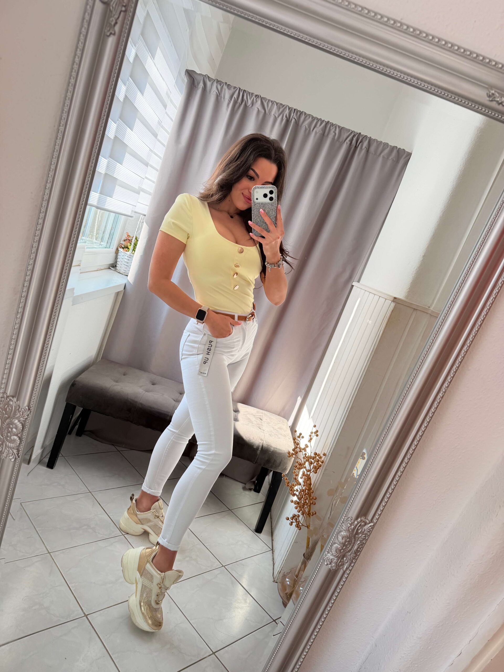 Rien fehér elasztikus anyagú fehér push-up fazonú nadrág.