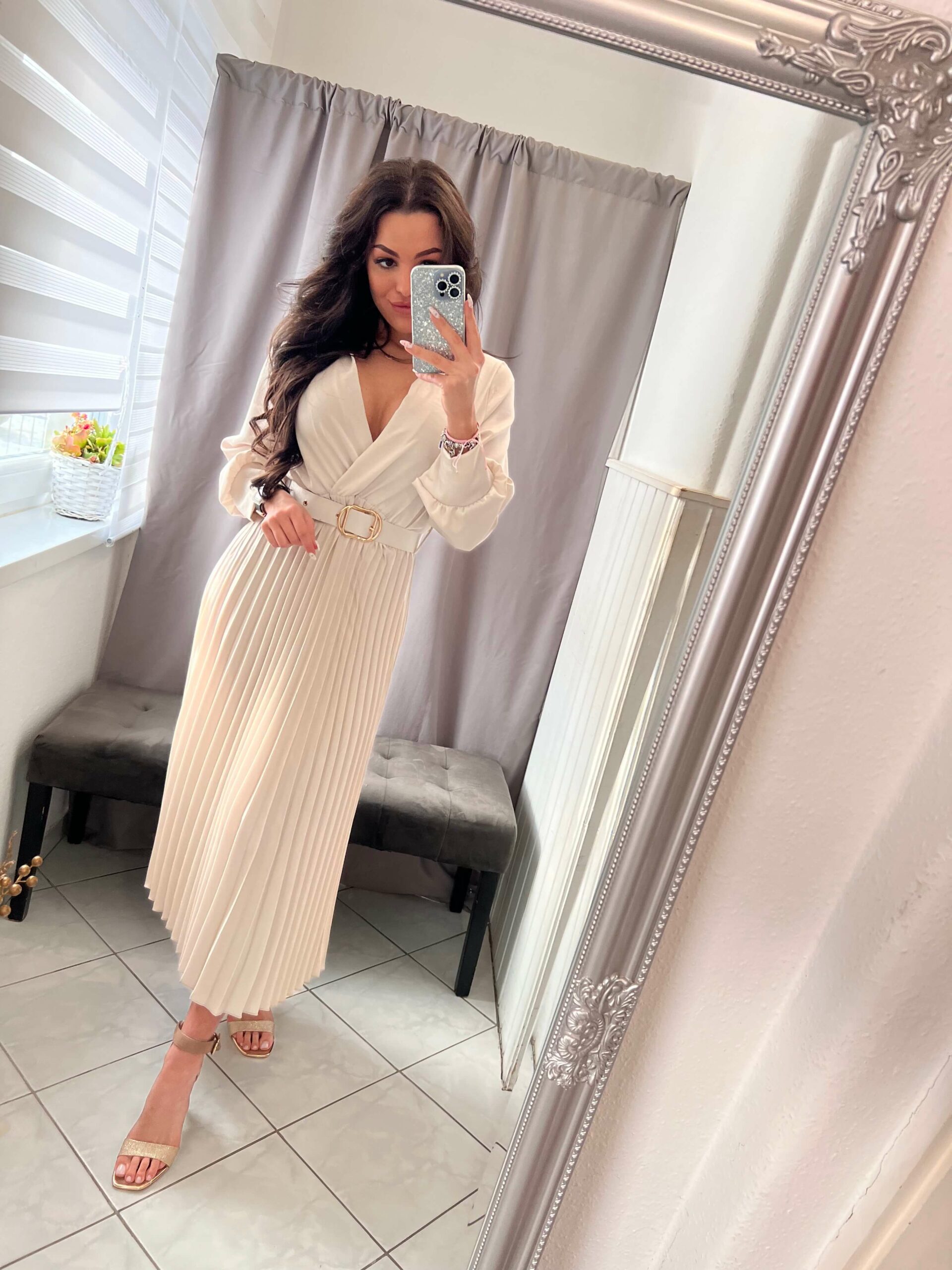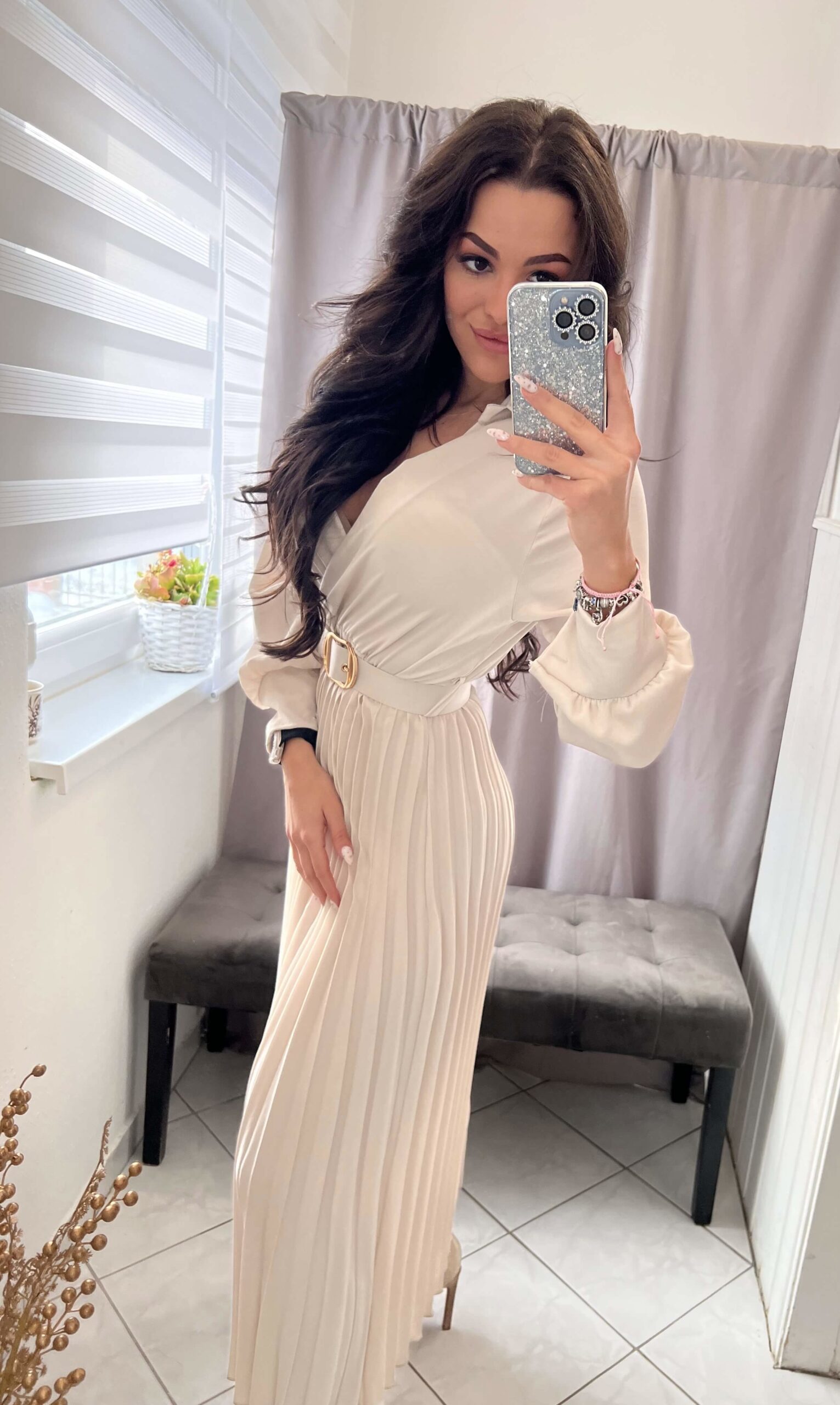 Bella bézs maxi pliszirozott ruha