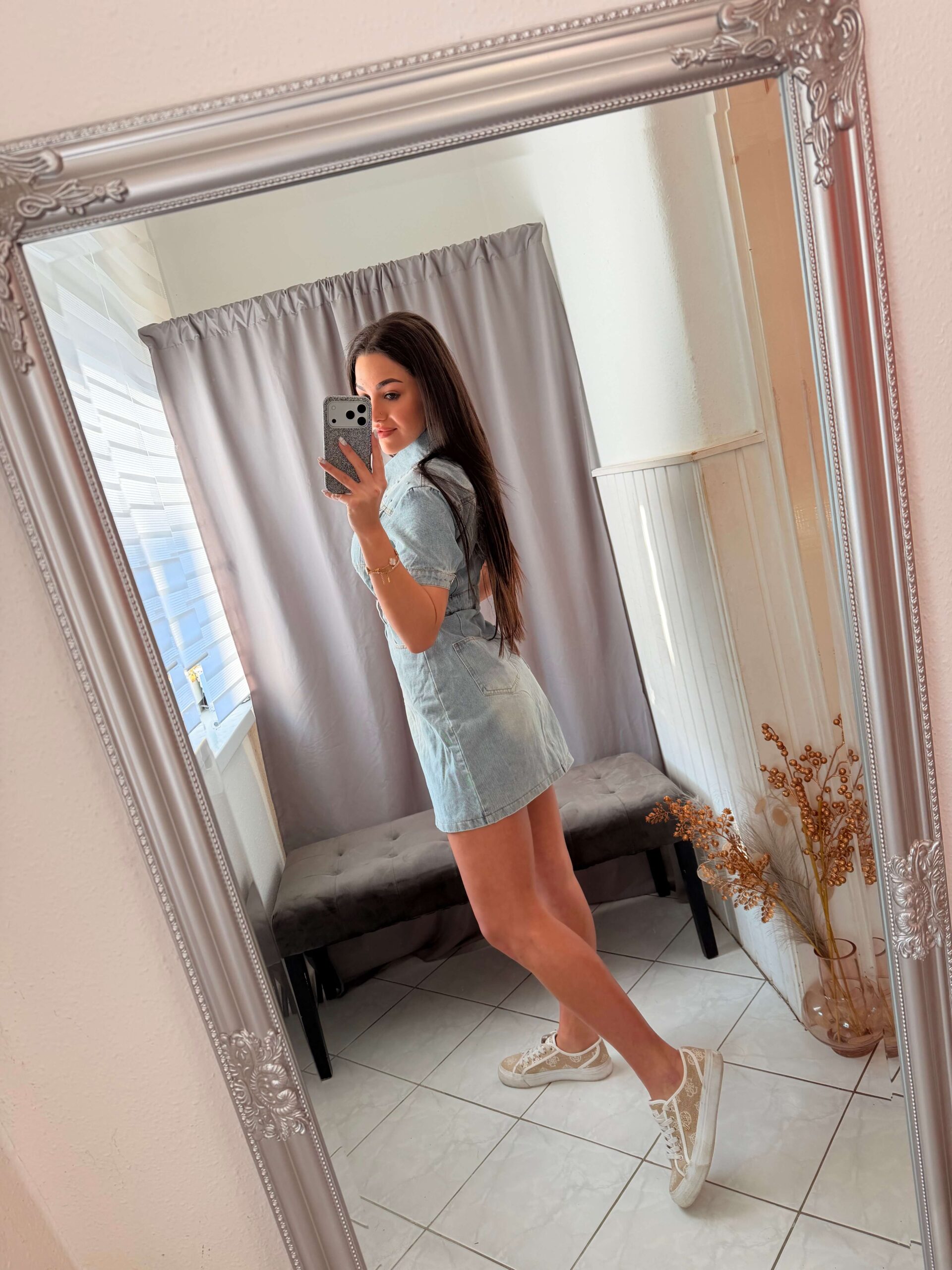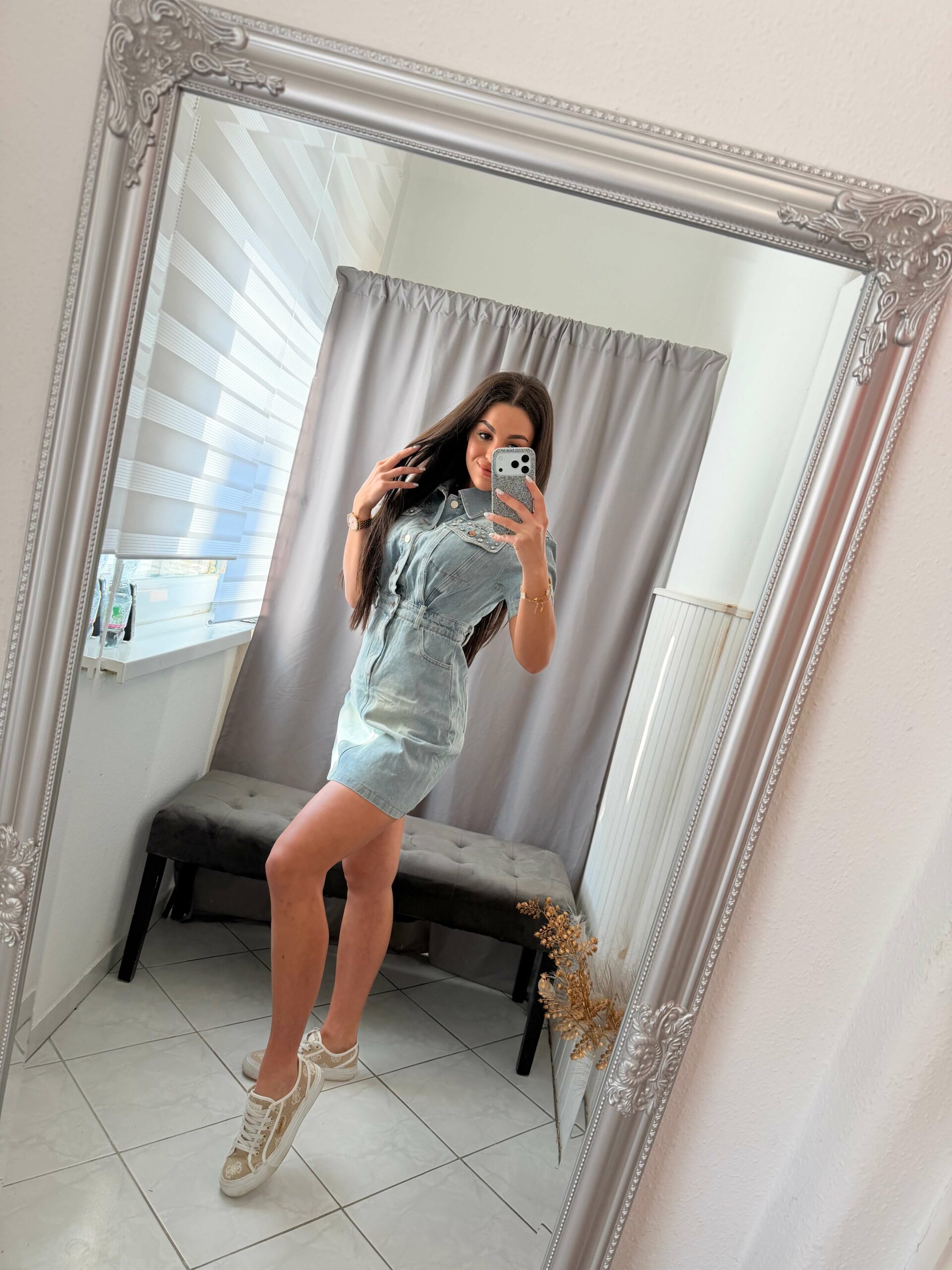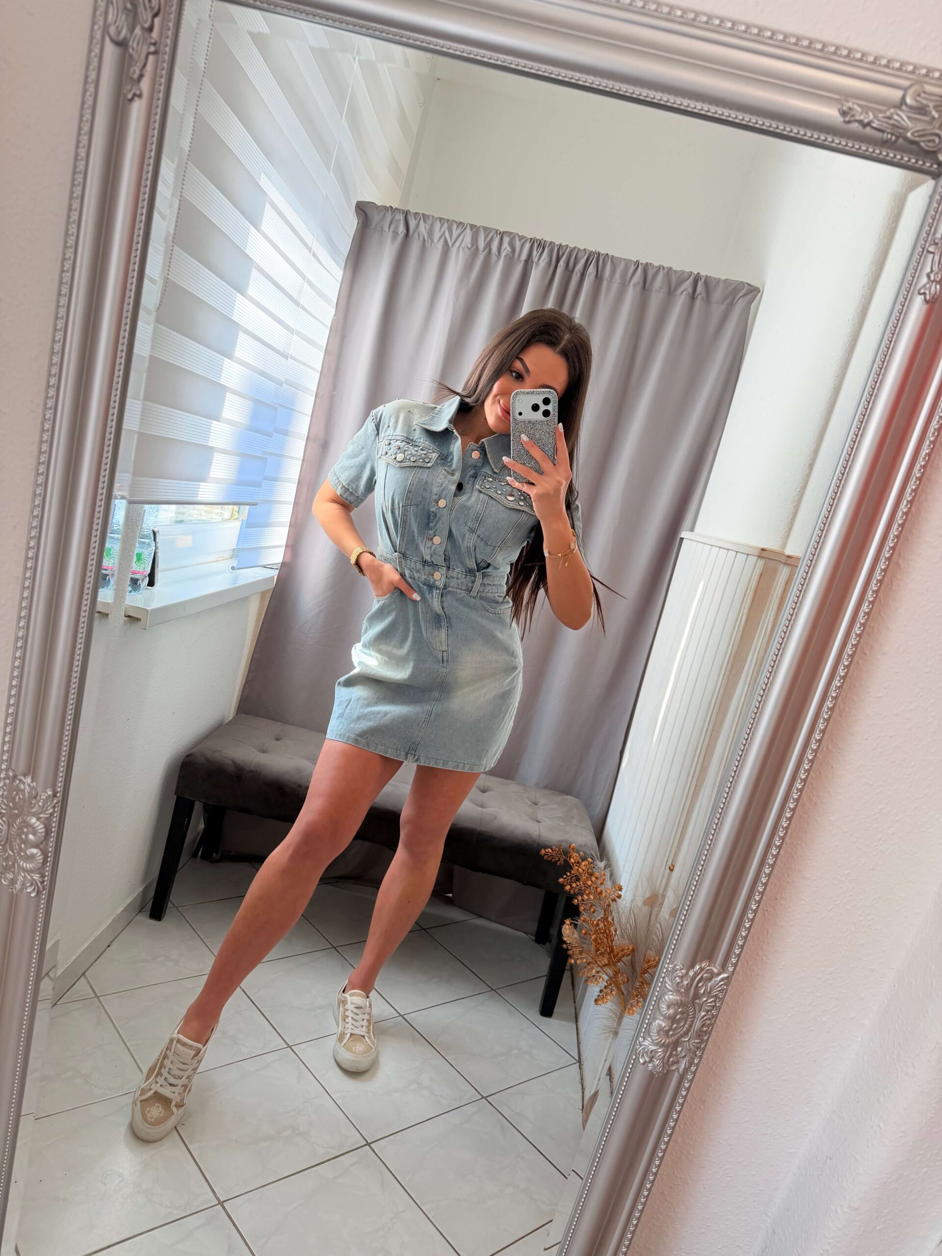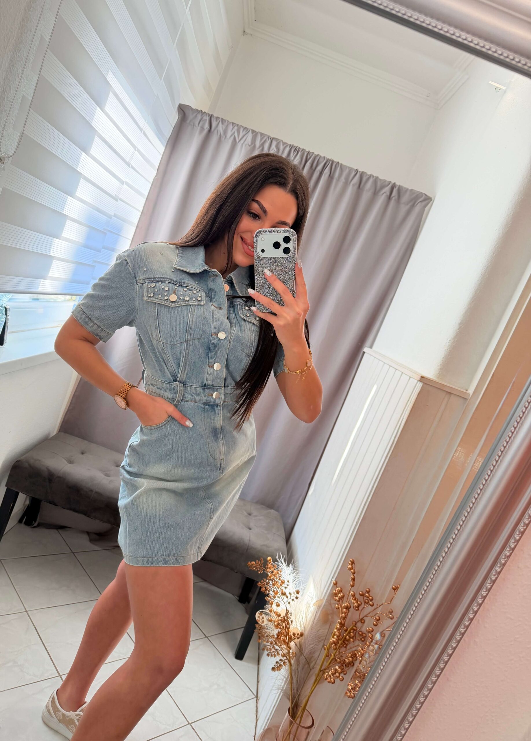 Dema kövekkel diszitett világoskék farmer ruha.