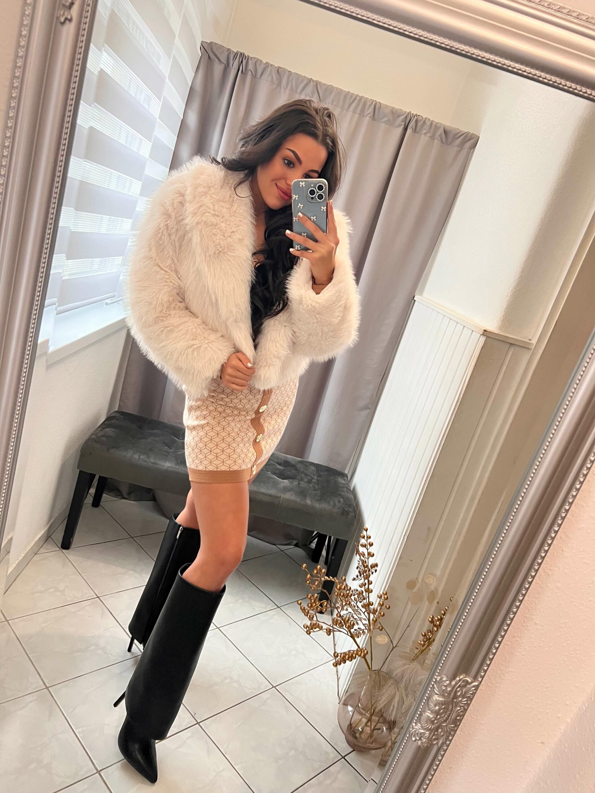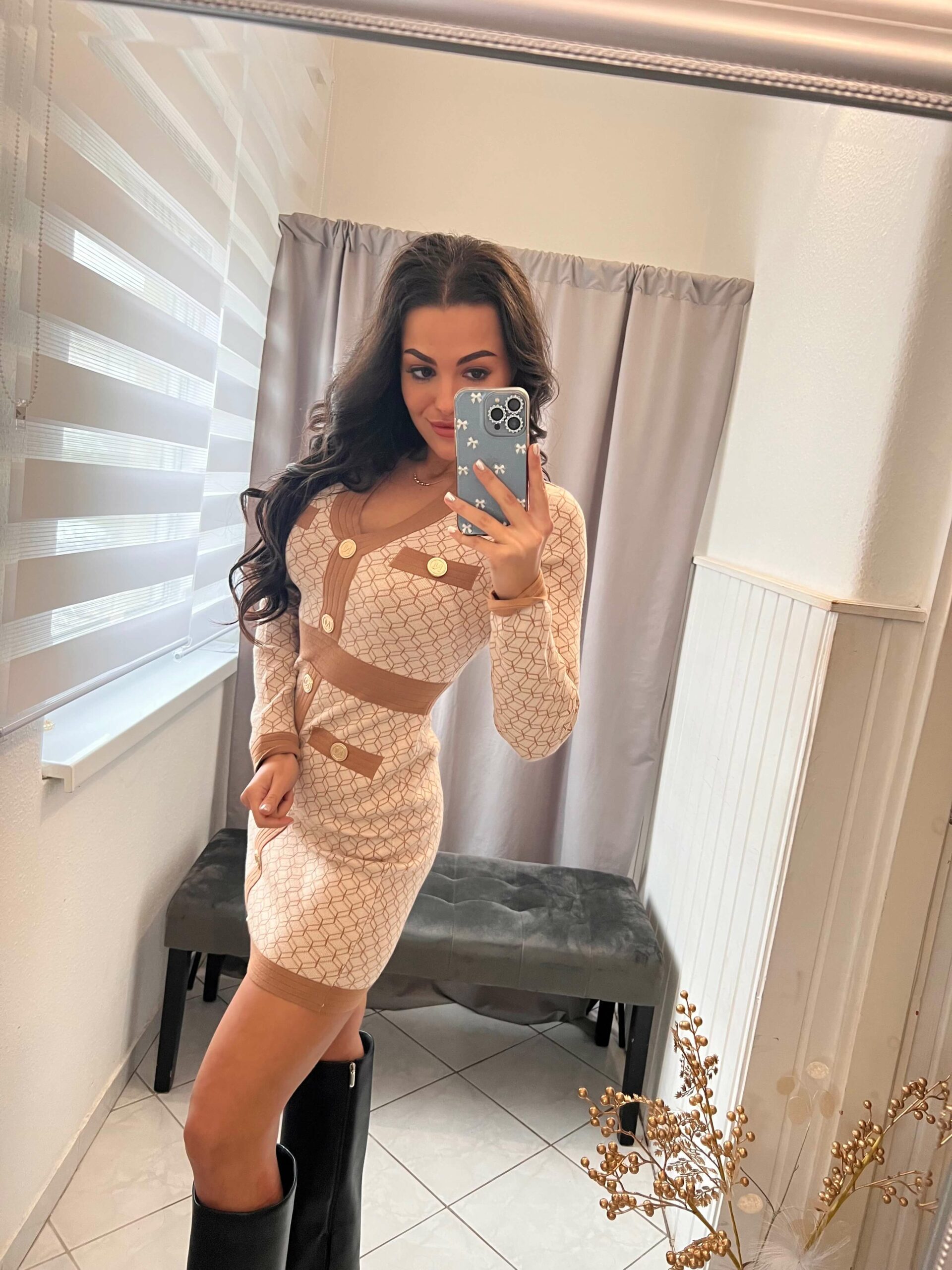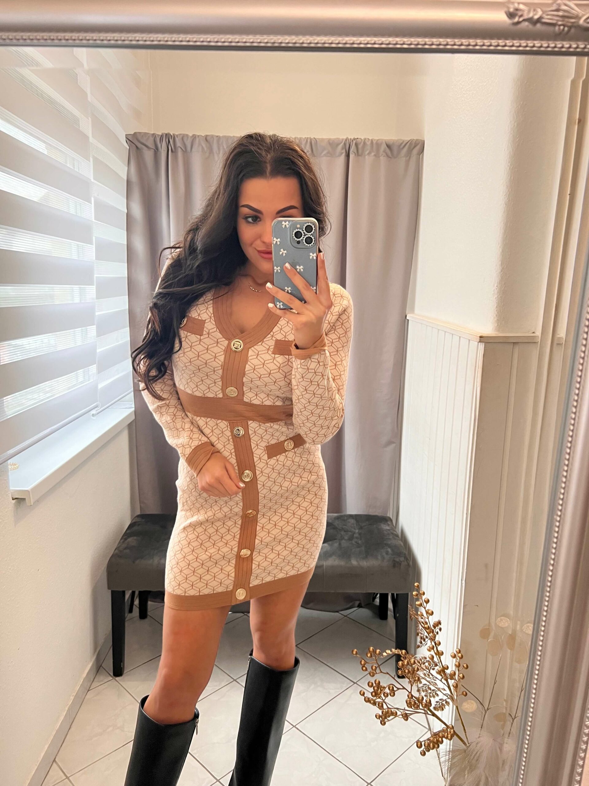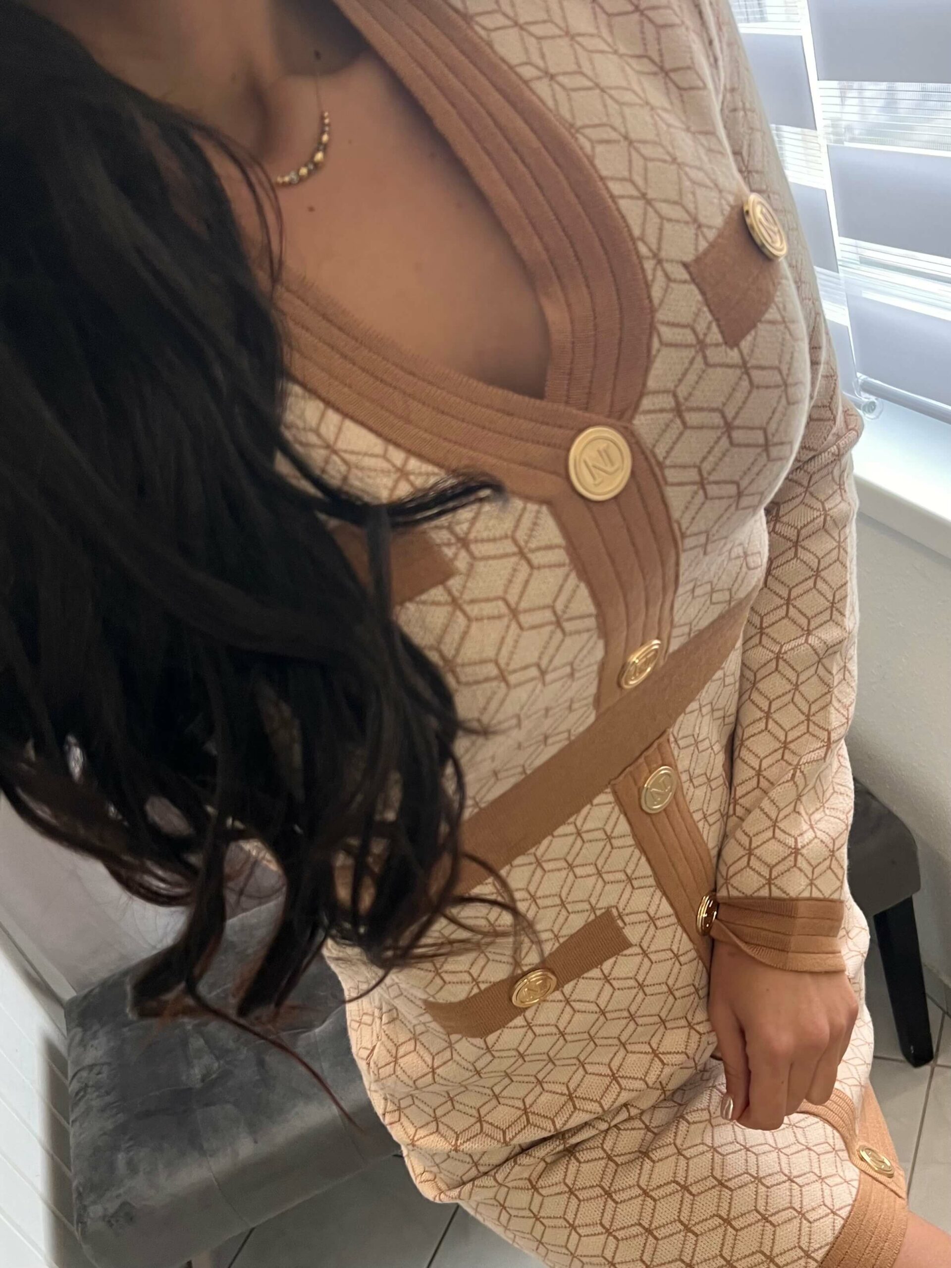 Doren barna-fehér mintás kötött ruha, arany gombokkal diszitve.