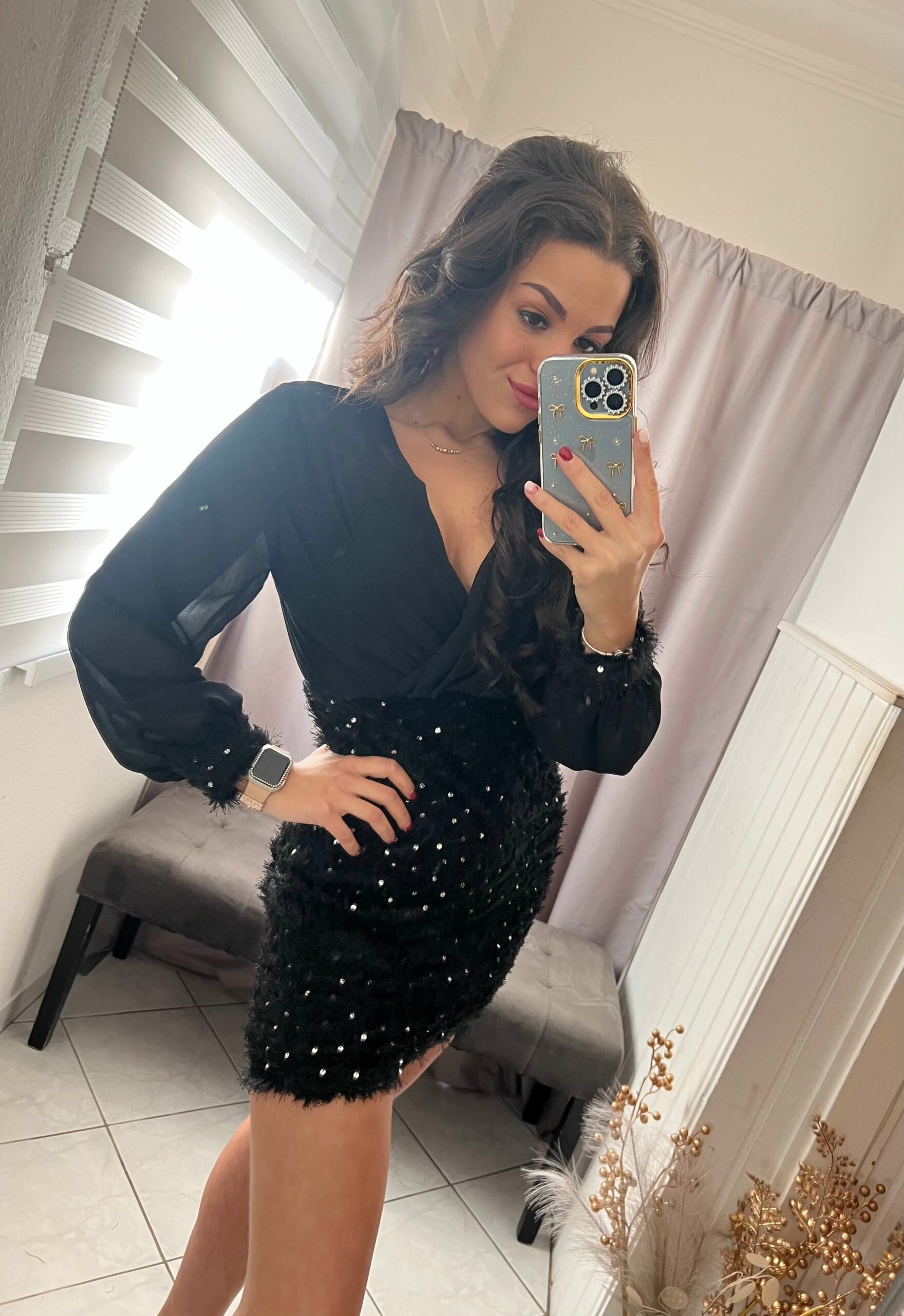 Elen fekete flitteres felső részén szatén kialakitású ruha.