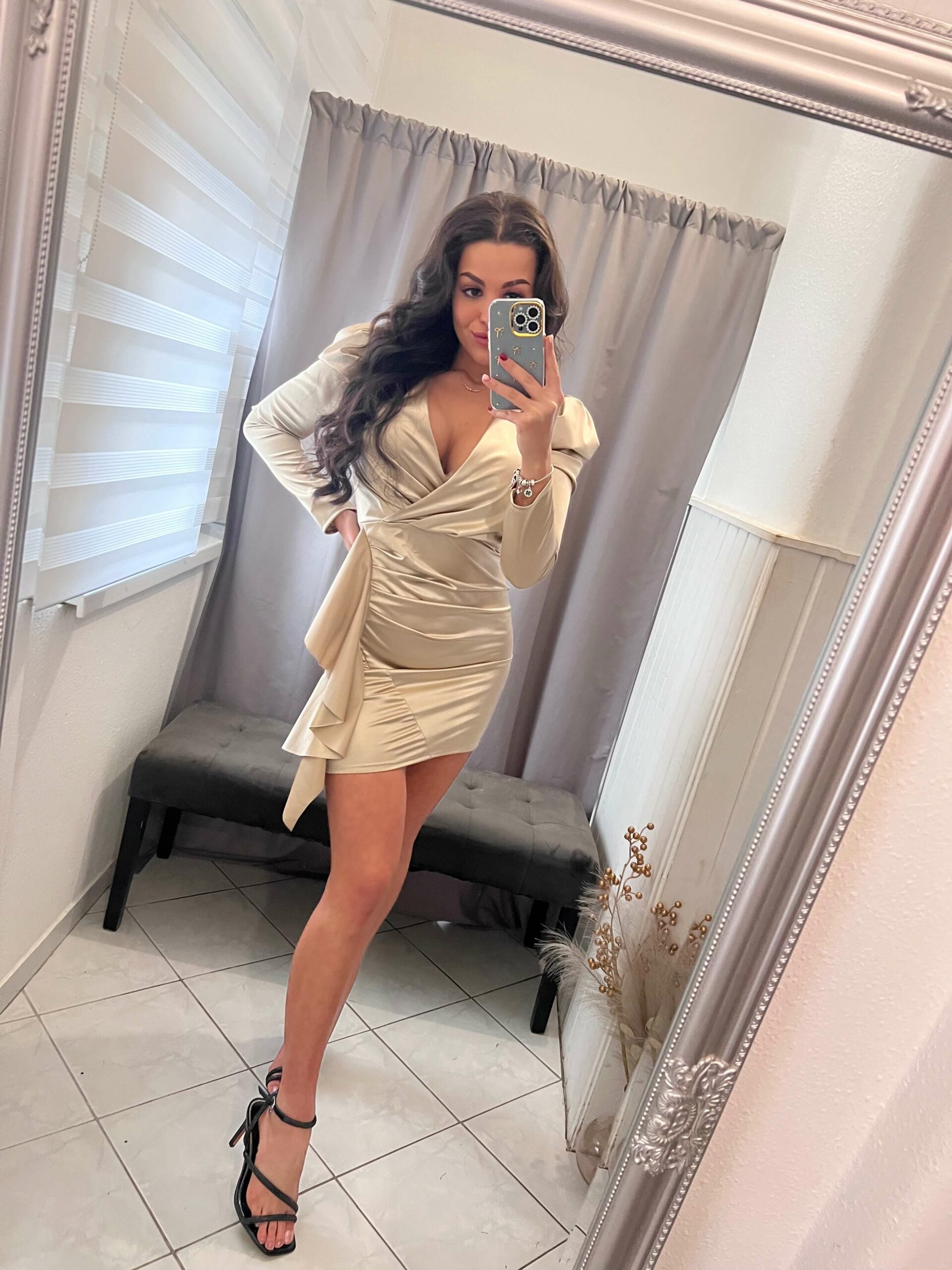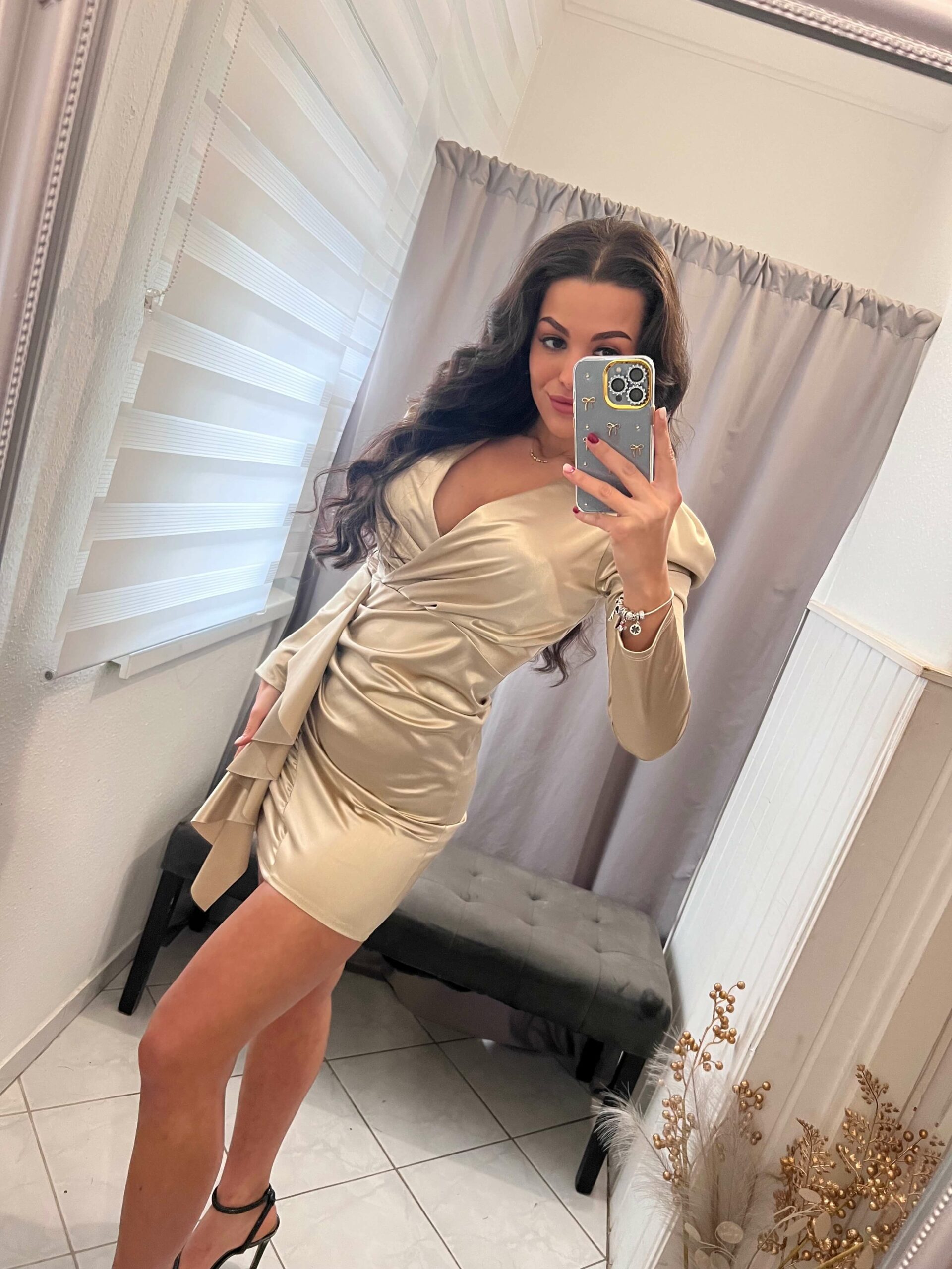 Ella arany oldalt fodros diszitéses mini fazonú ruha.