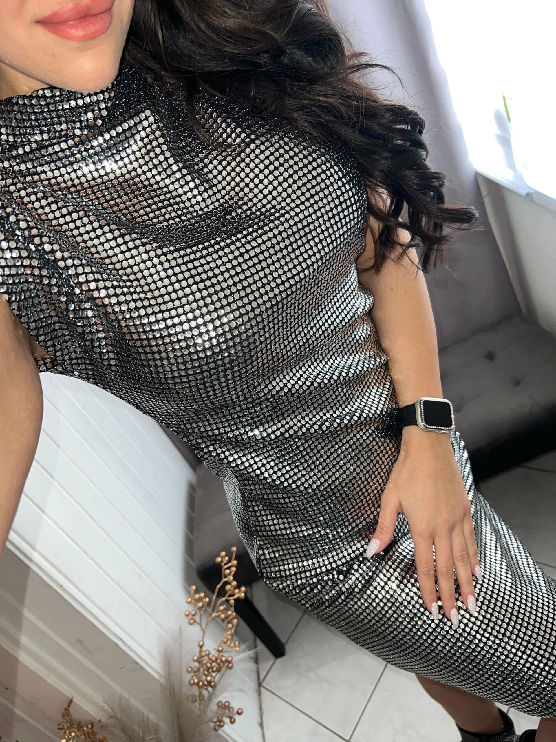Erin ujjatlan húzott ezüst flitterekkel diszitett ruha.