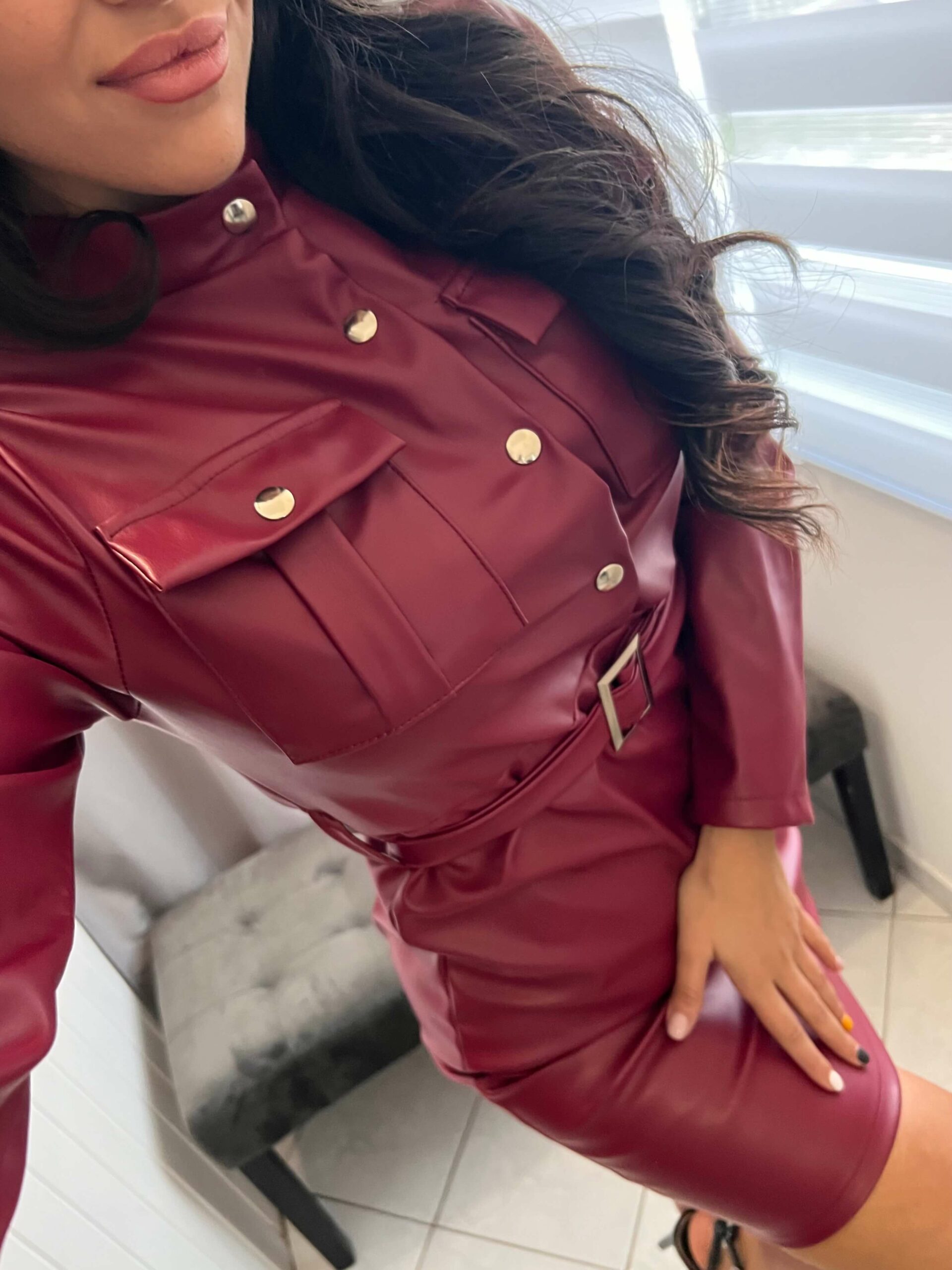 Fren bőr hatású burgundi ruha.