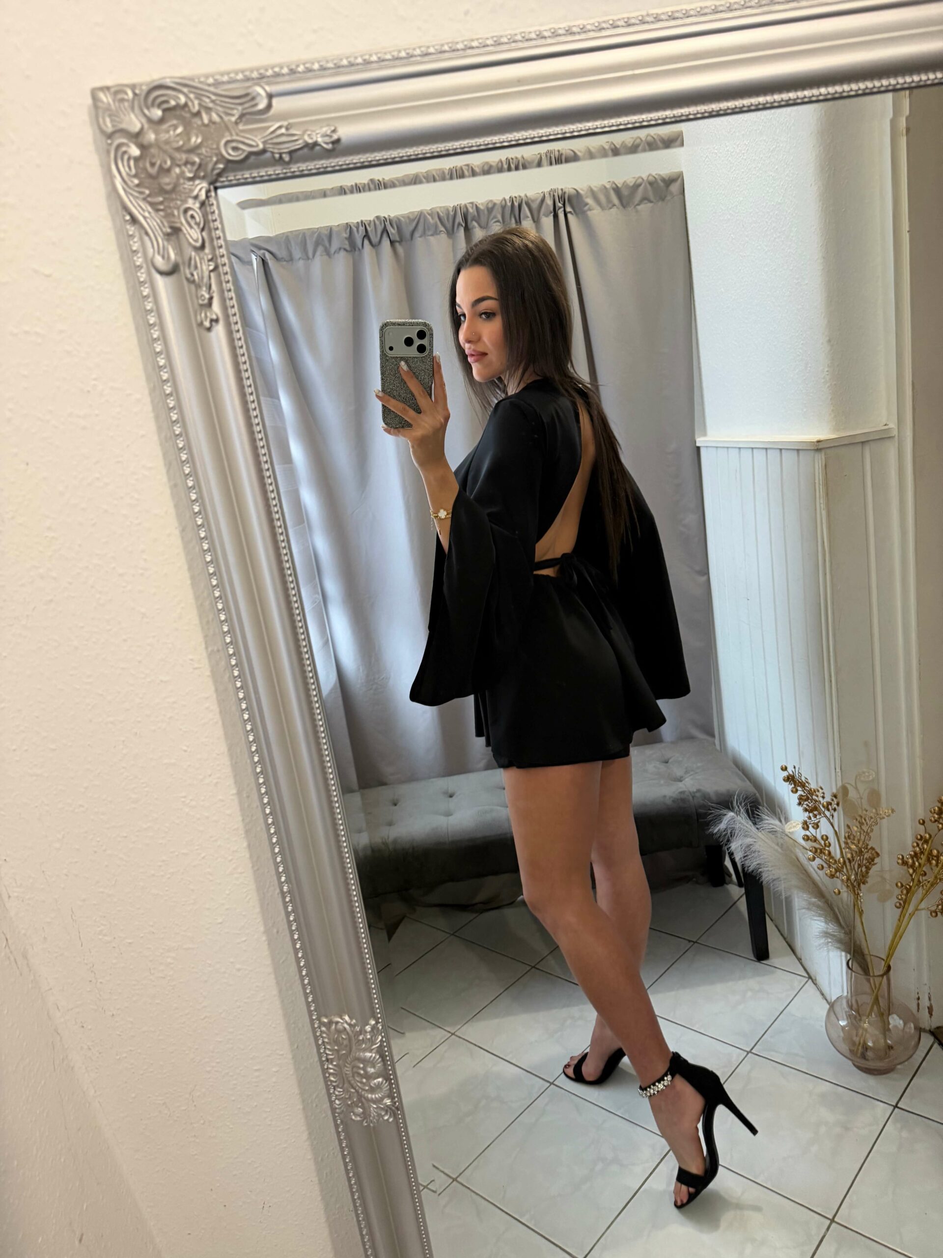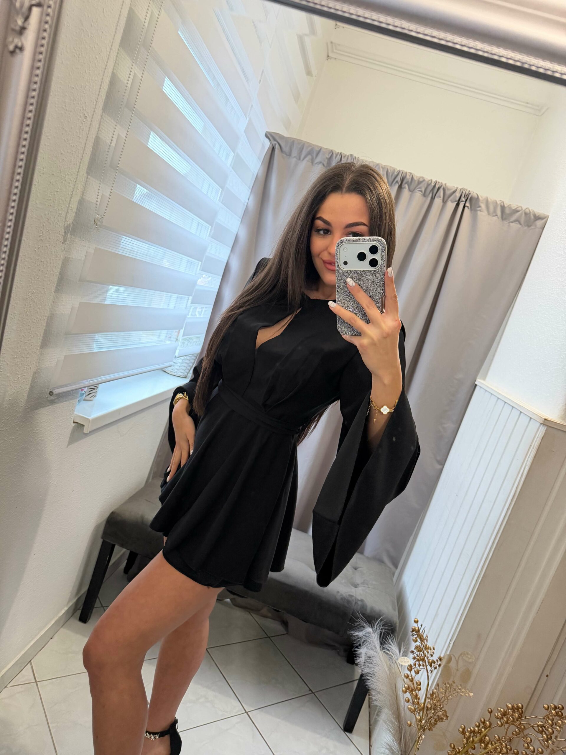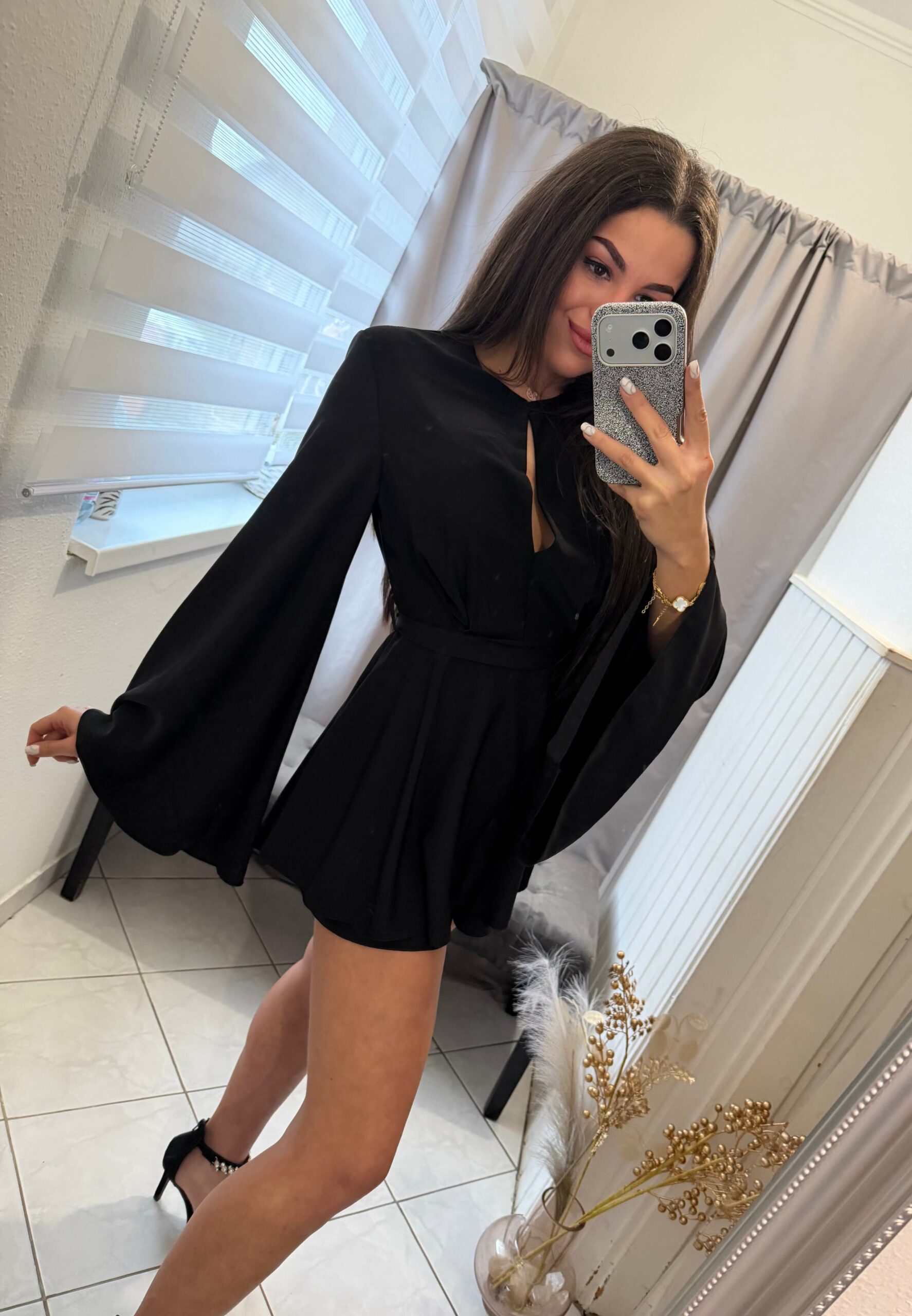Ilan trapéz ujjú szoknya nadrágos fekete overál.