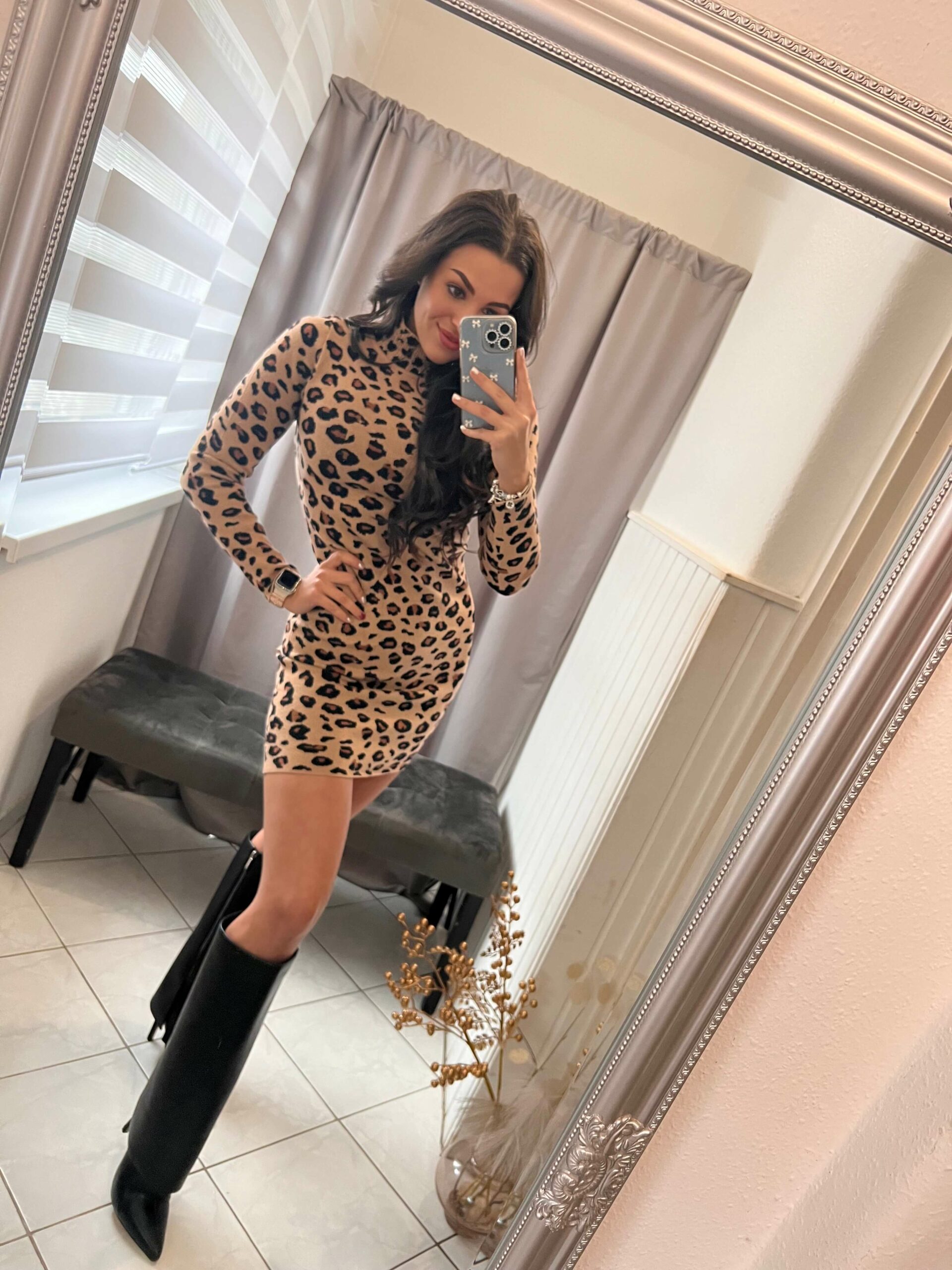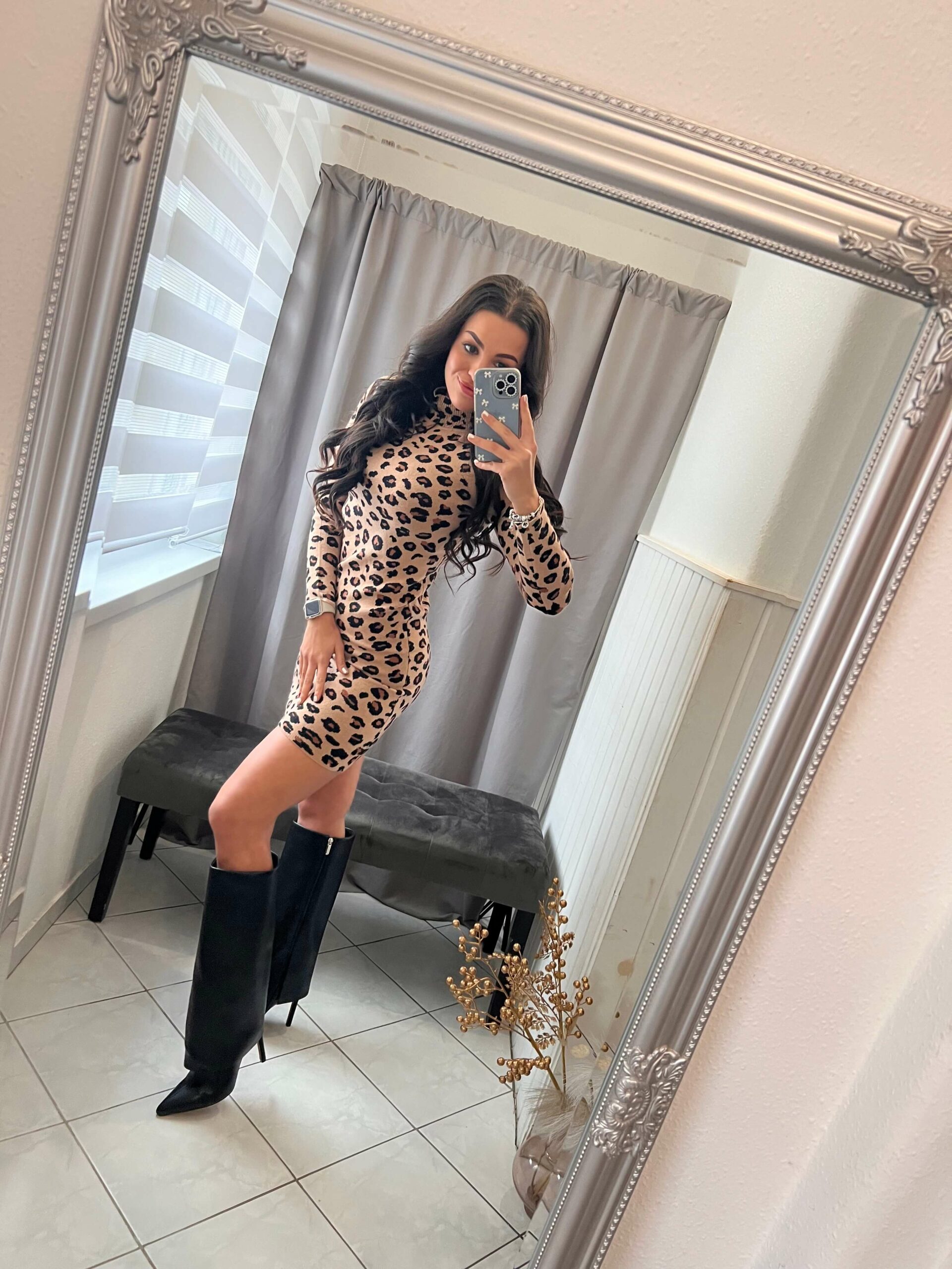Leor ocelot mintás garbós kötött fazonú ruha.