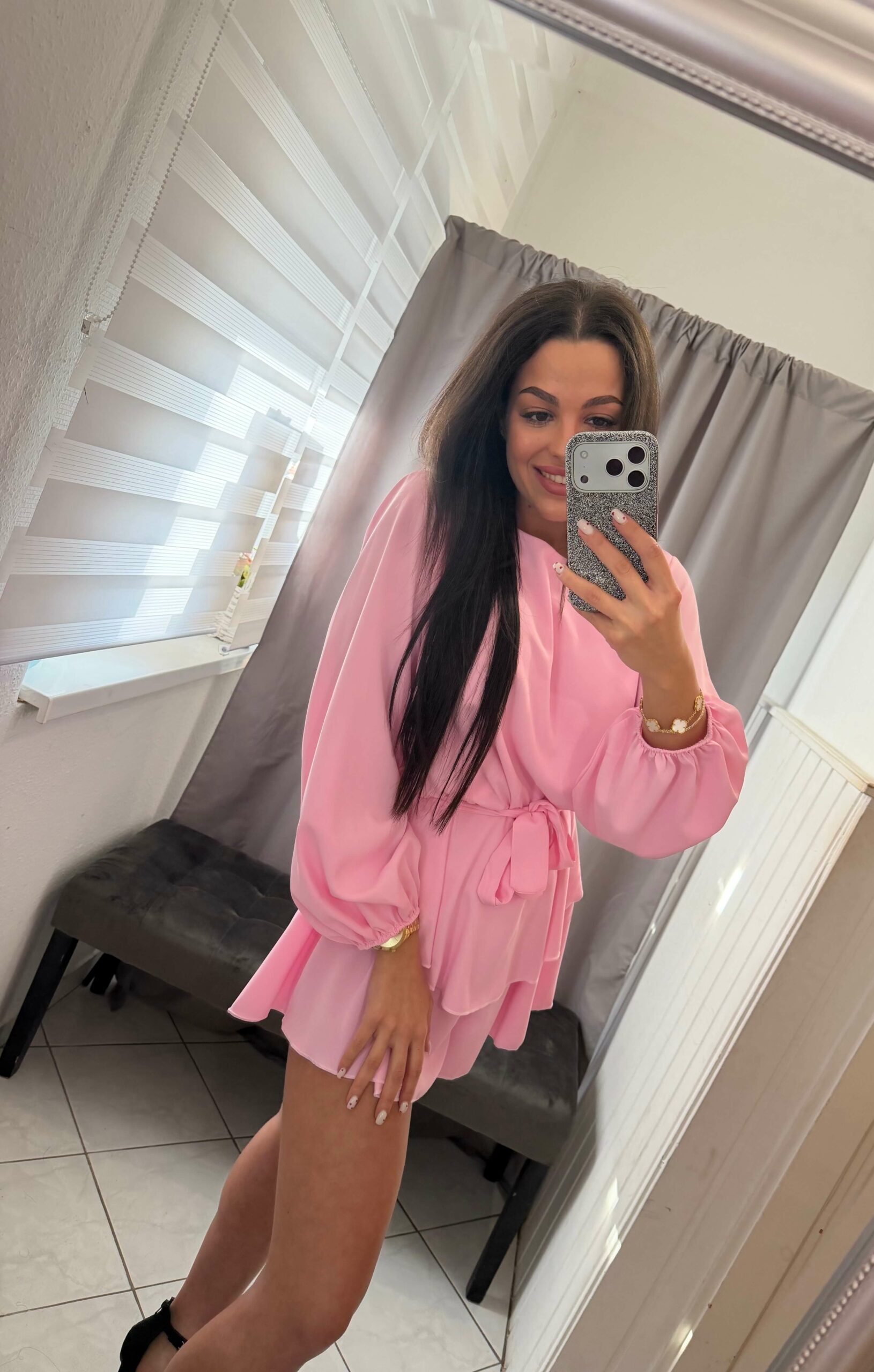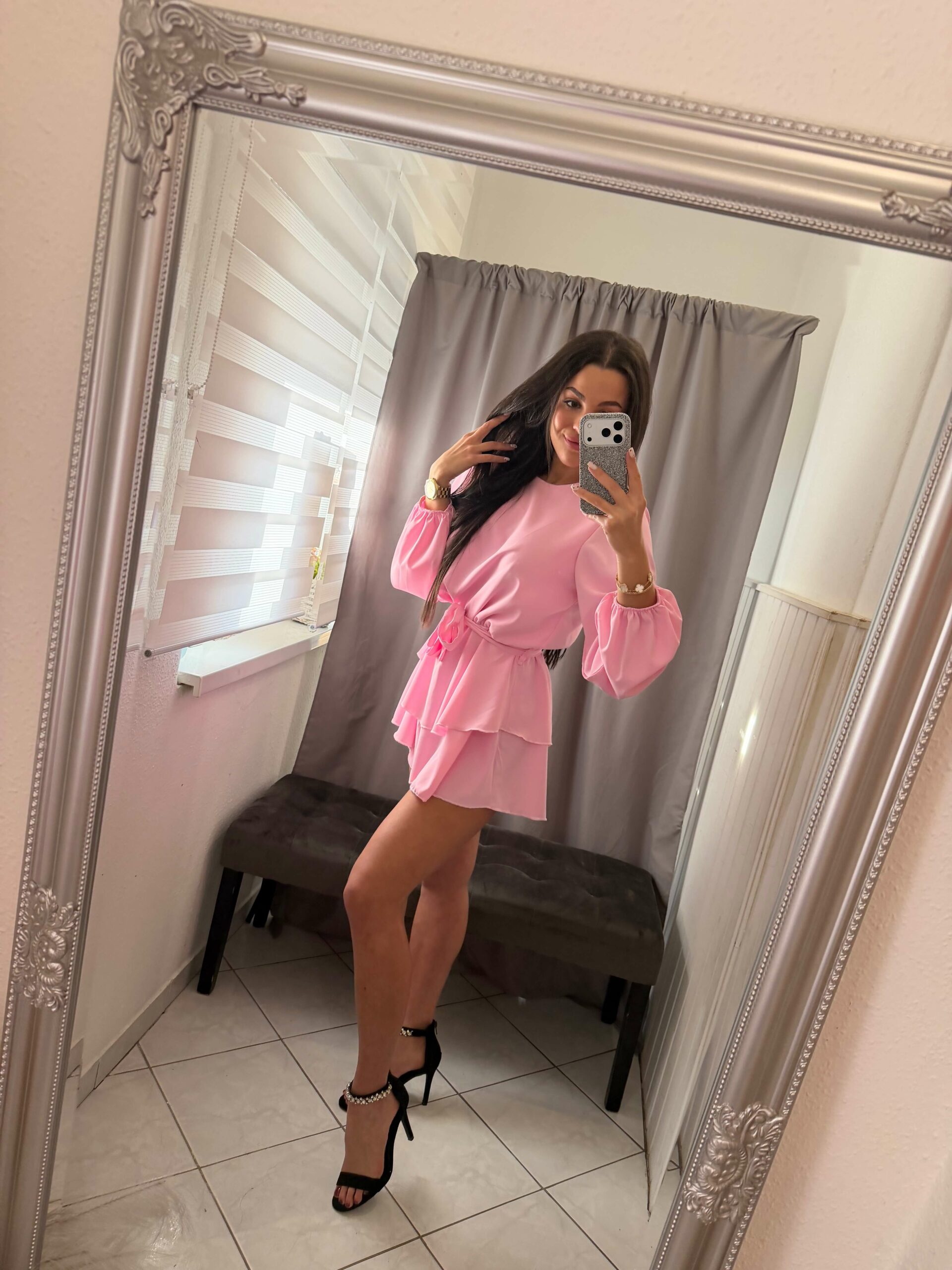 Nera szatén derekán kötős , bő ujjú szoknya nadrágos overál.