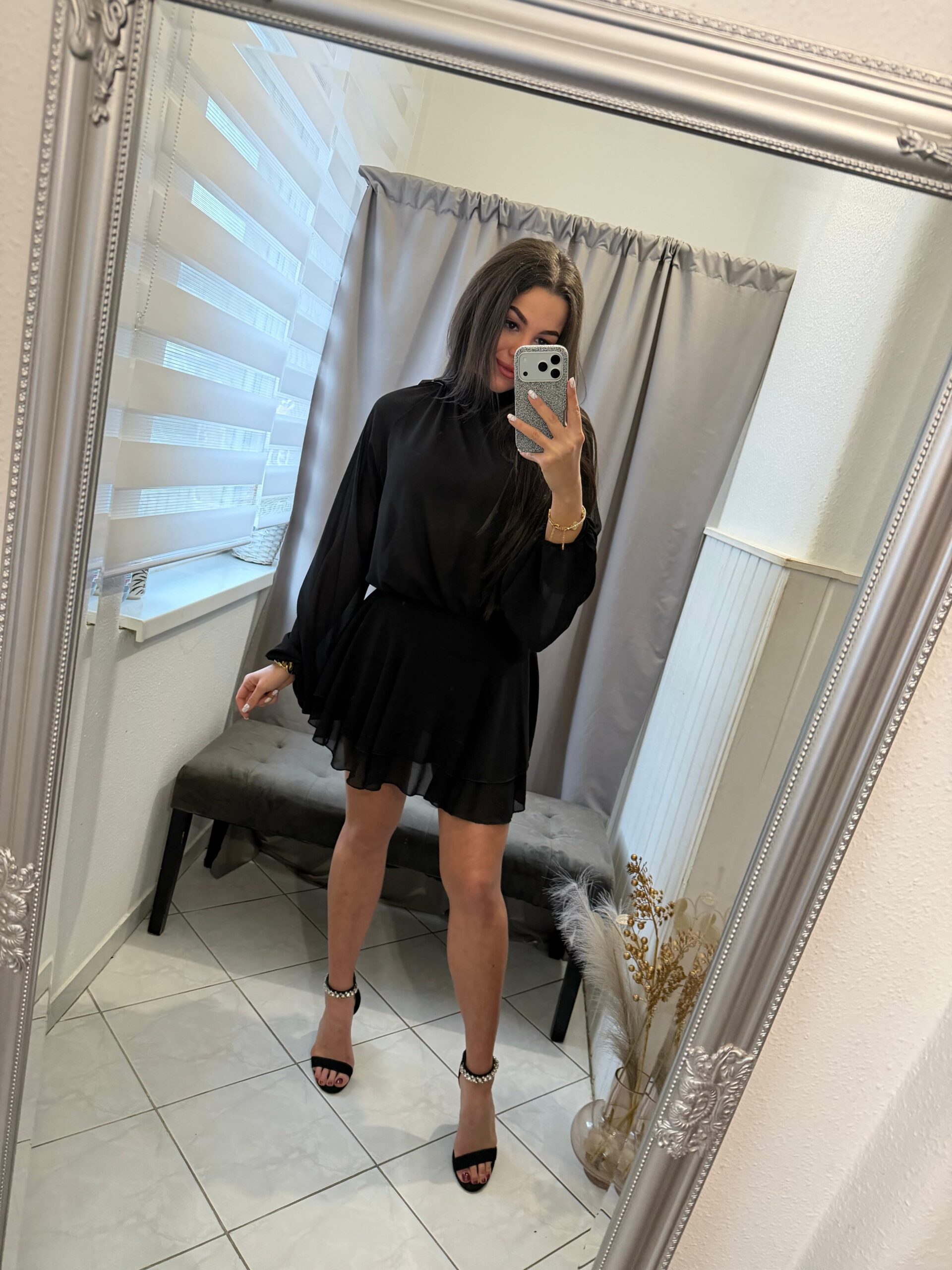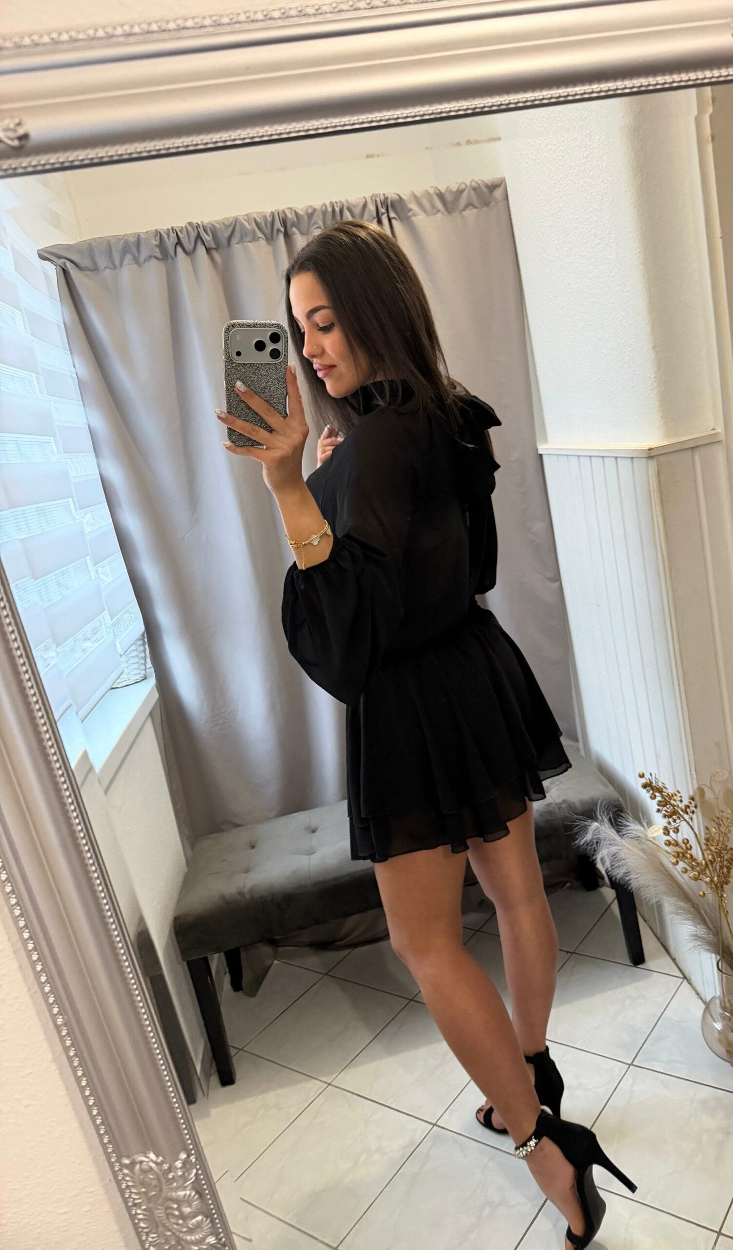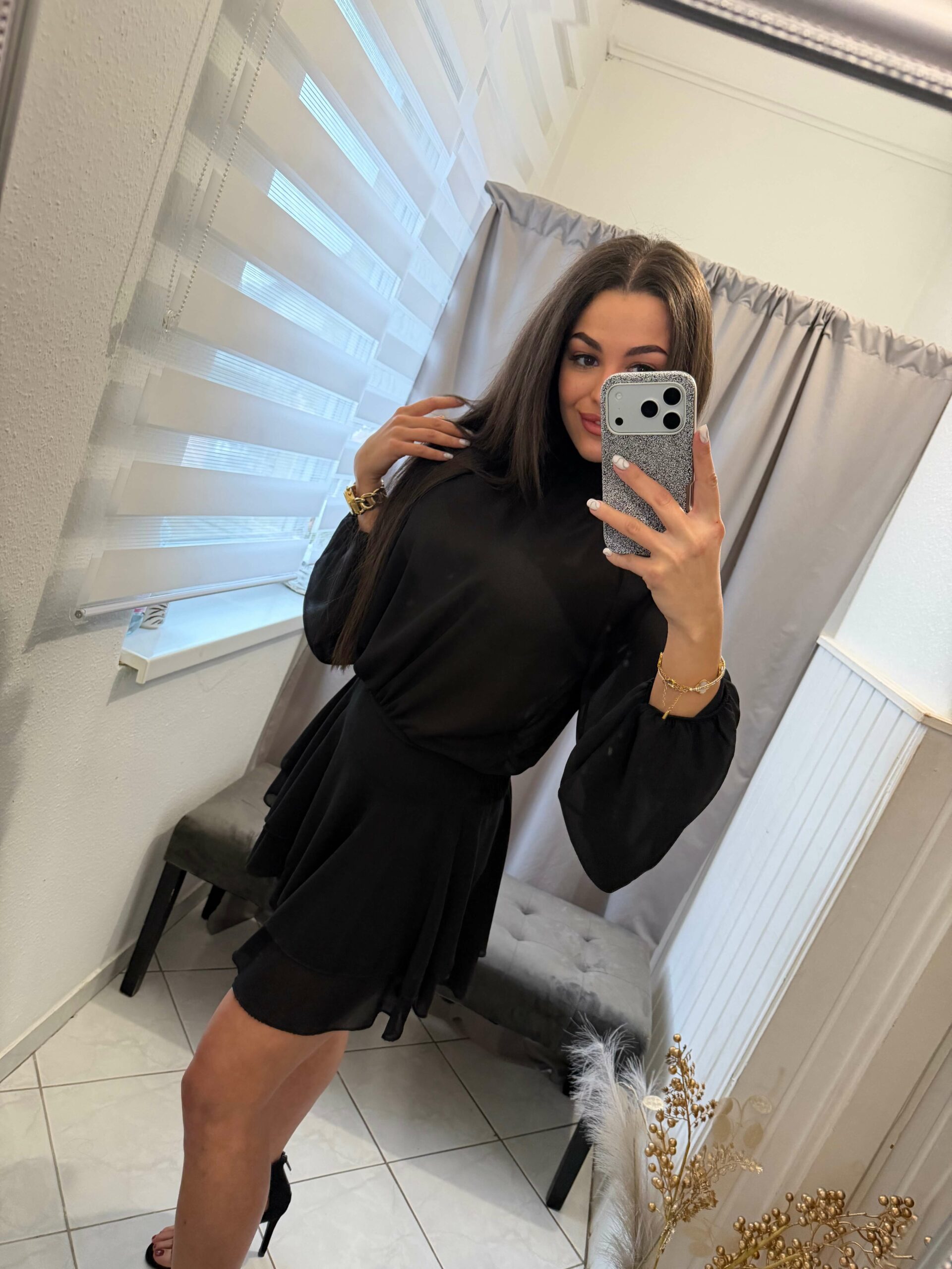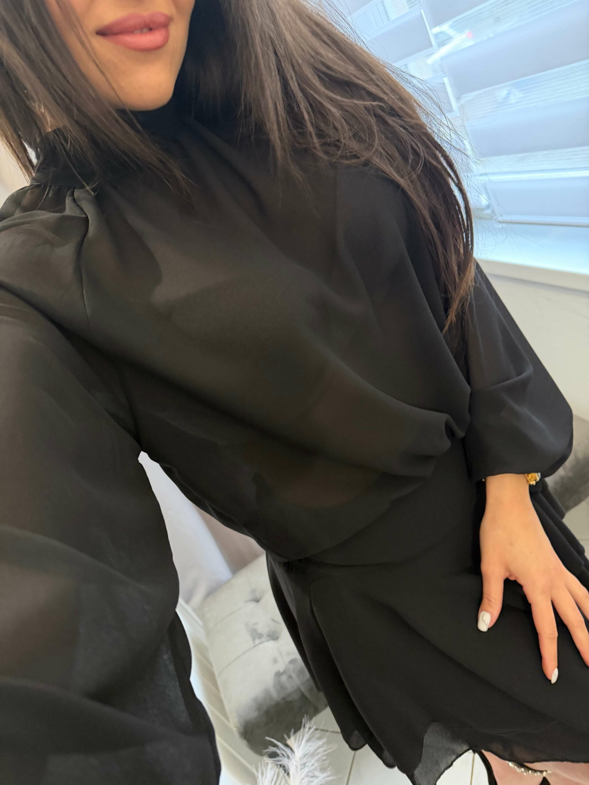 Neri szatén derekán kötős , bő ujjú szoknya nadrágos overál.