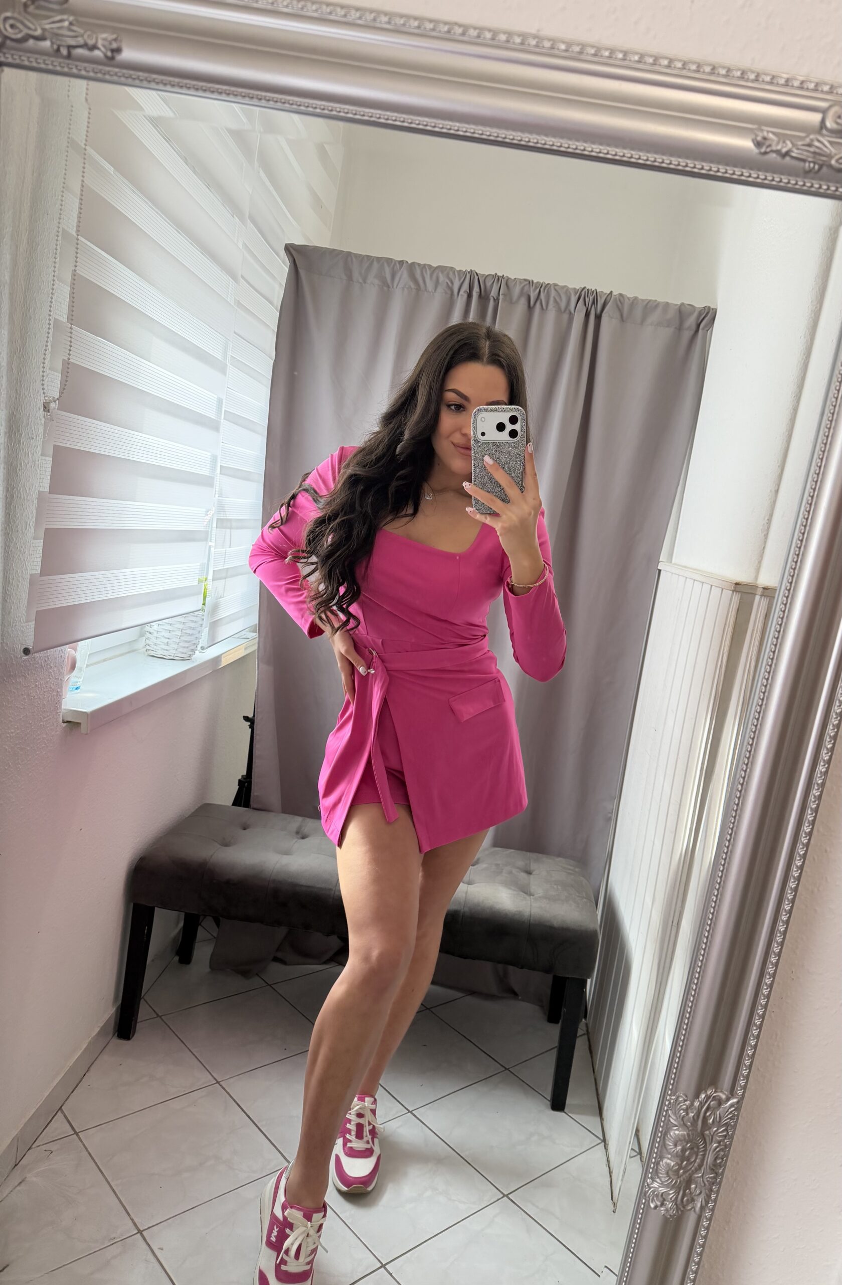 Szoknya részénél átlapolt fazon. Hátúl rövid nadrágos kialakitás.
