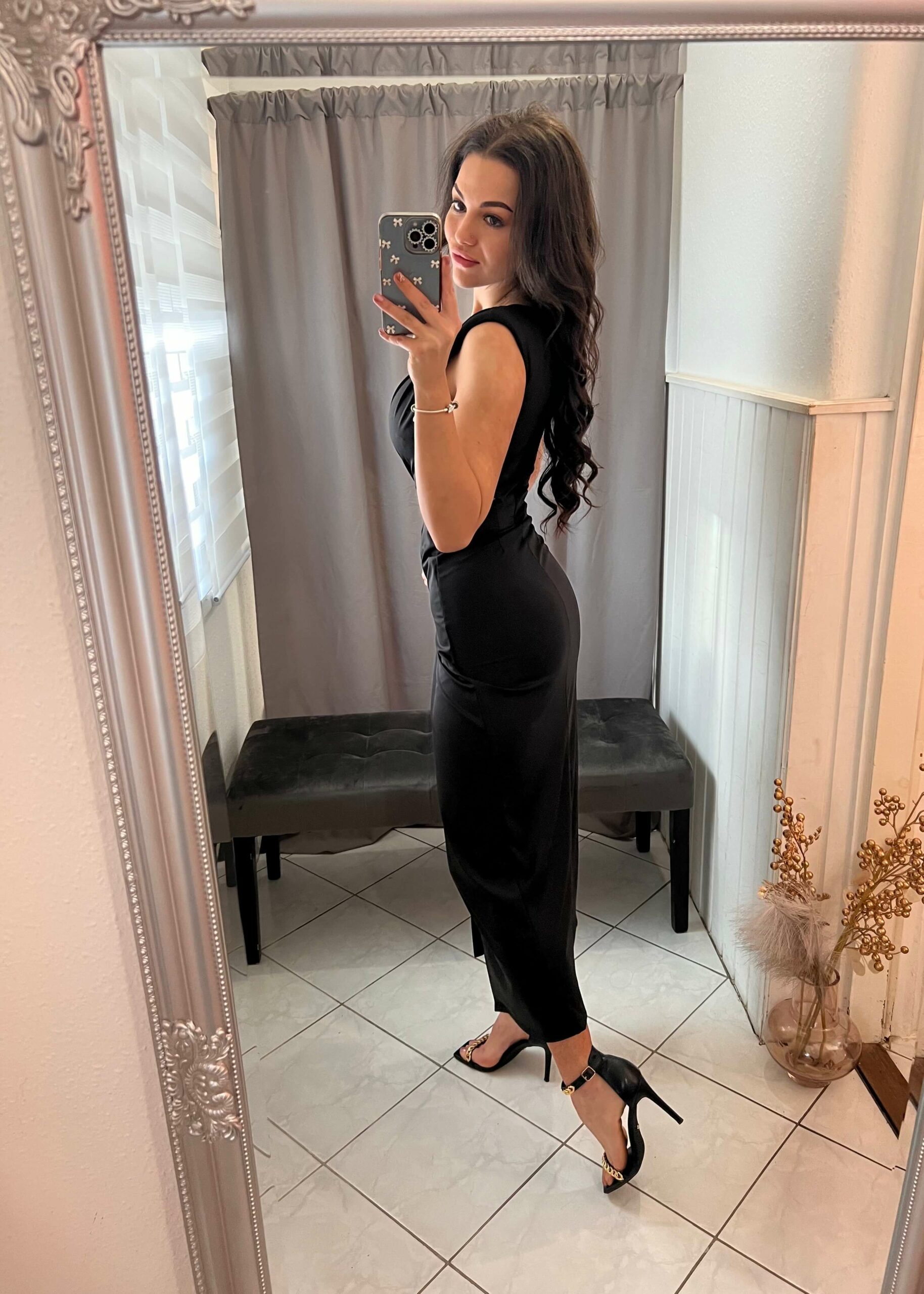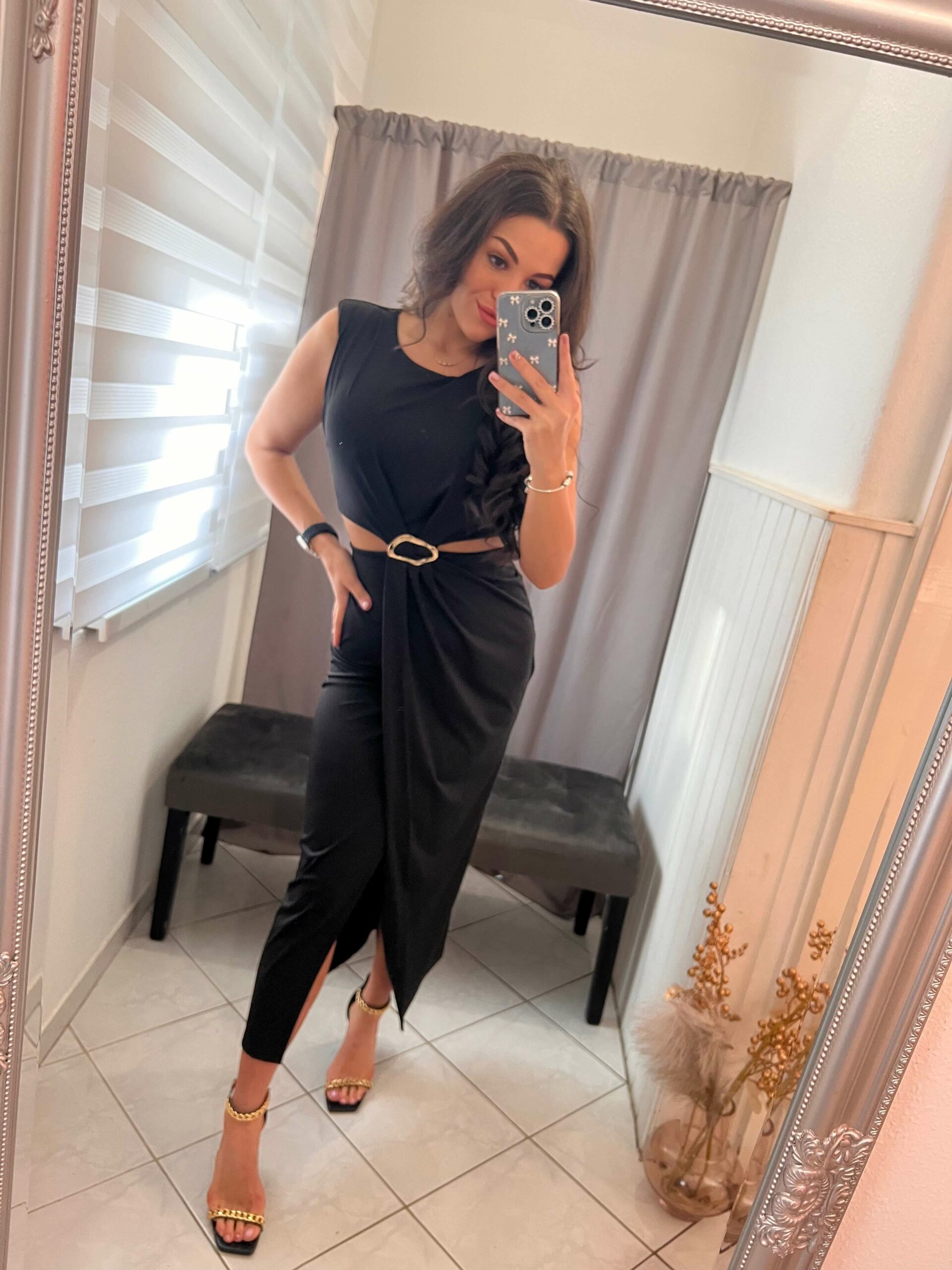 Rosen fekete oldalt nyitott maxi ruha.