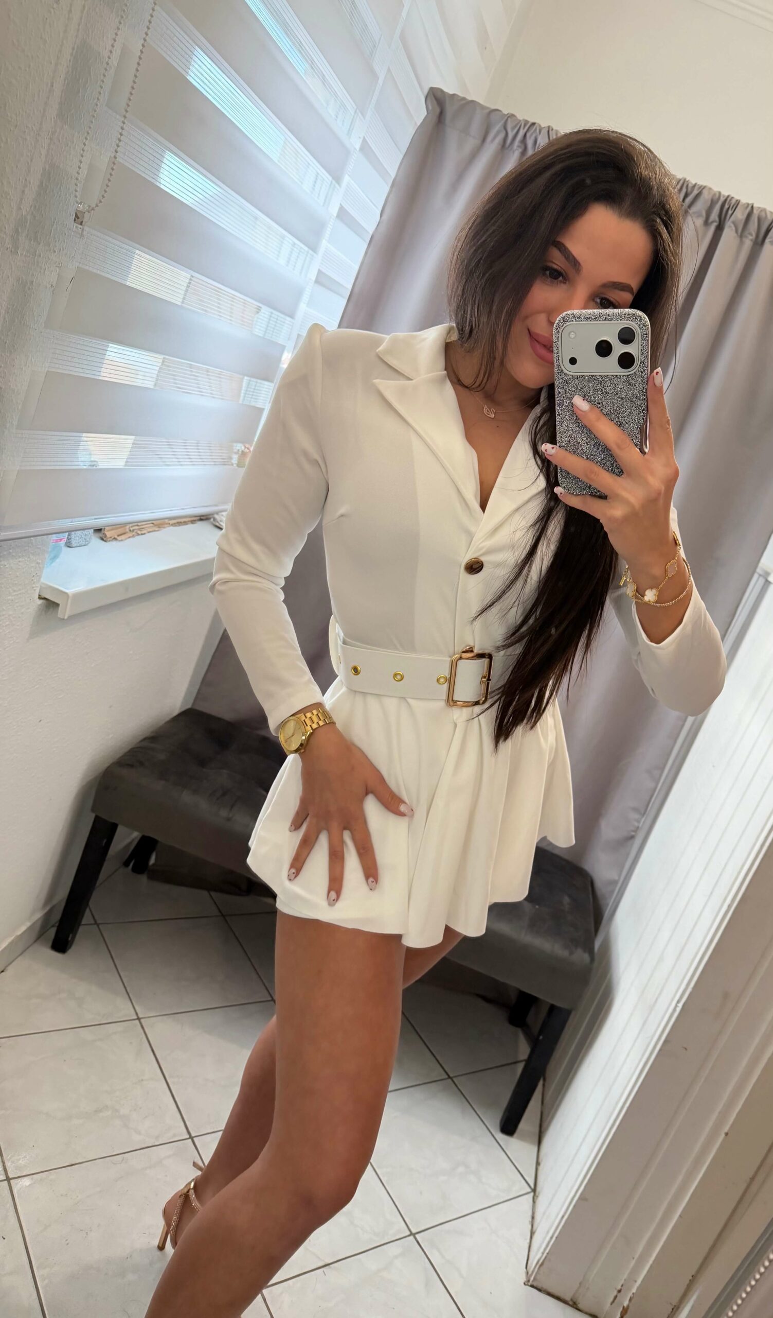 Roxa fehér szoknya nadrágos overál öves diszitéssel.