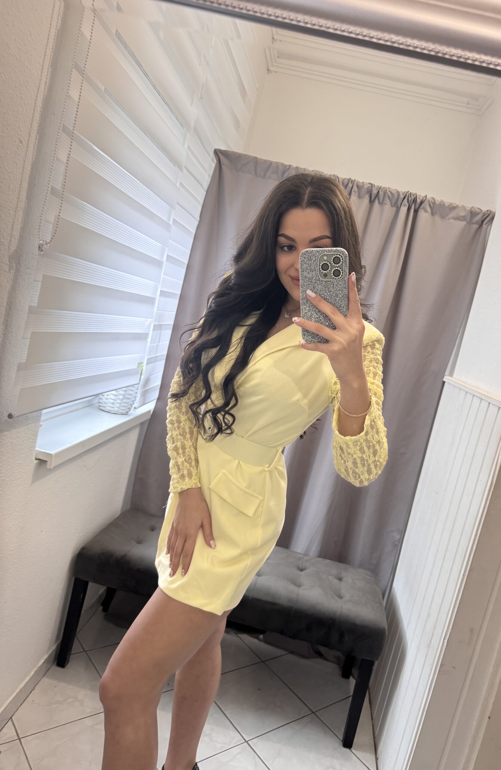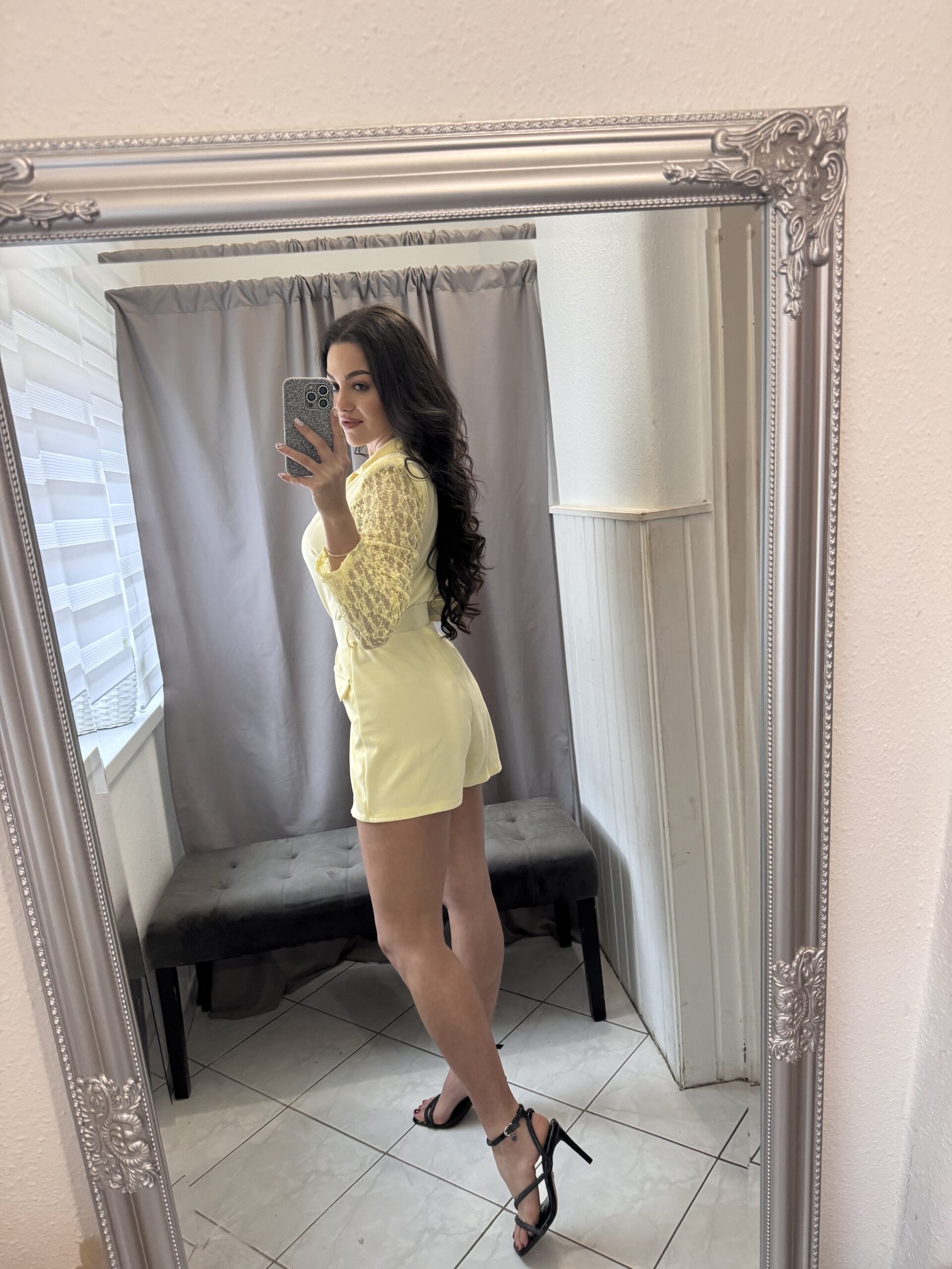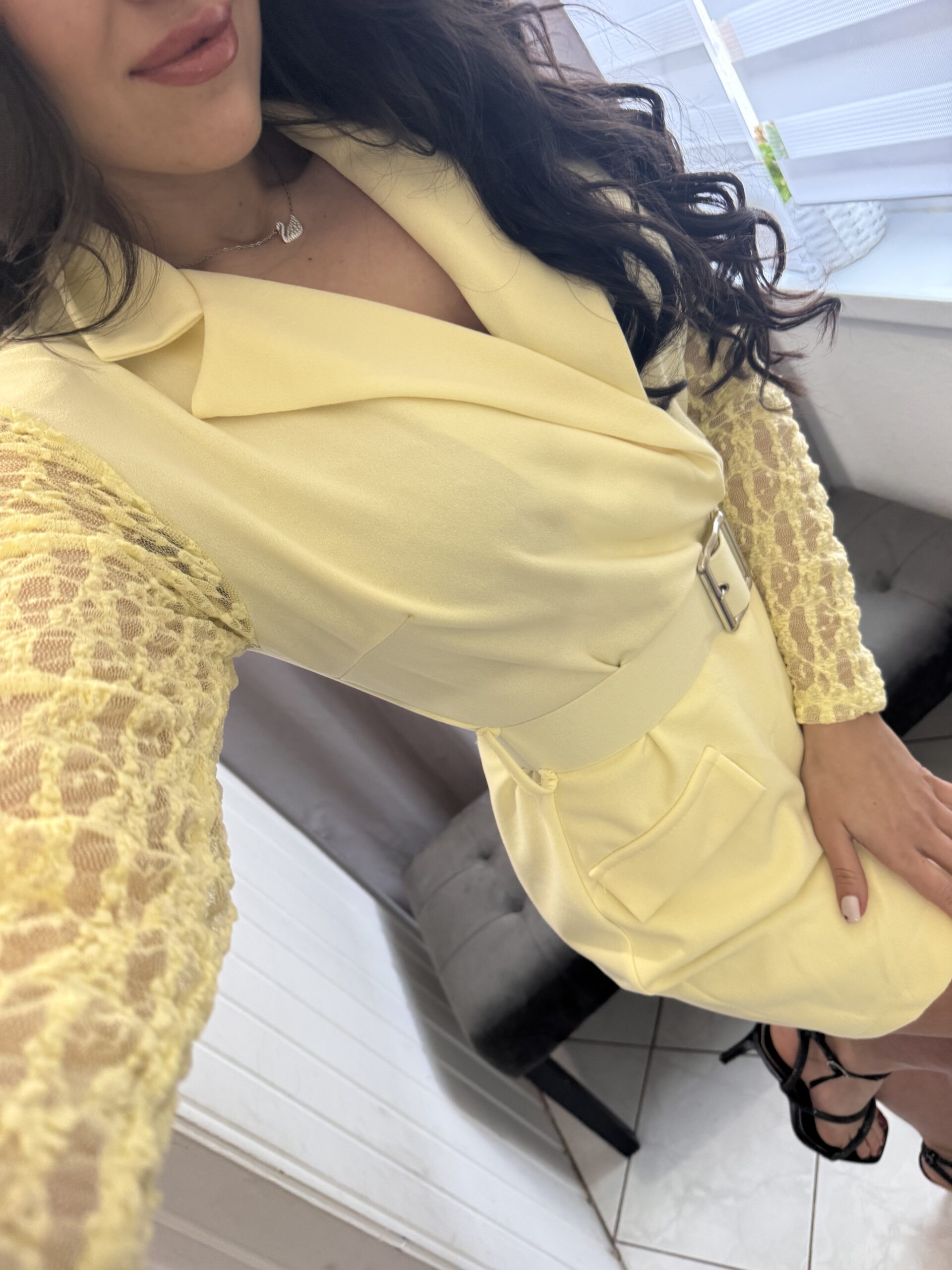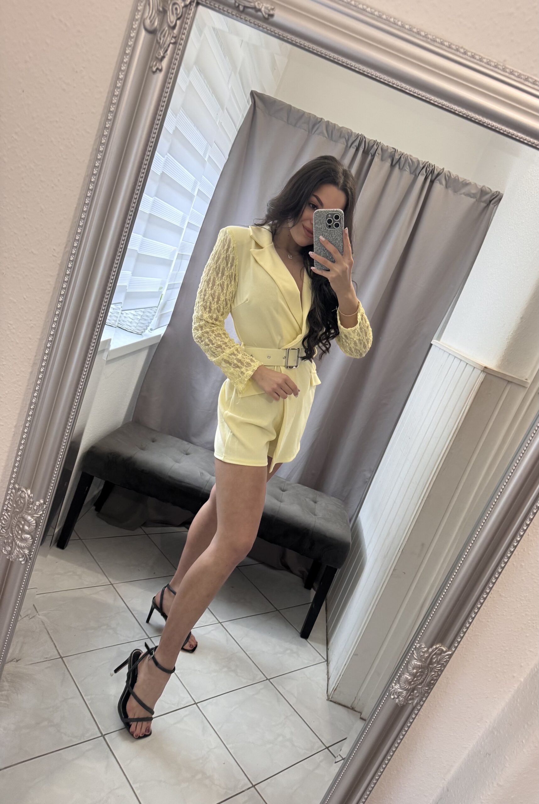Roxen ujján csipkés fazonú szoknya nadrágos sárga overál.