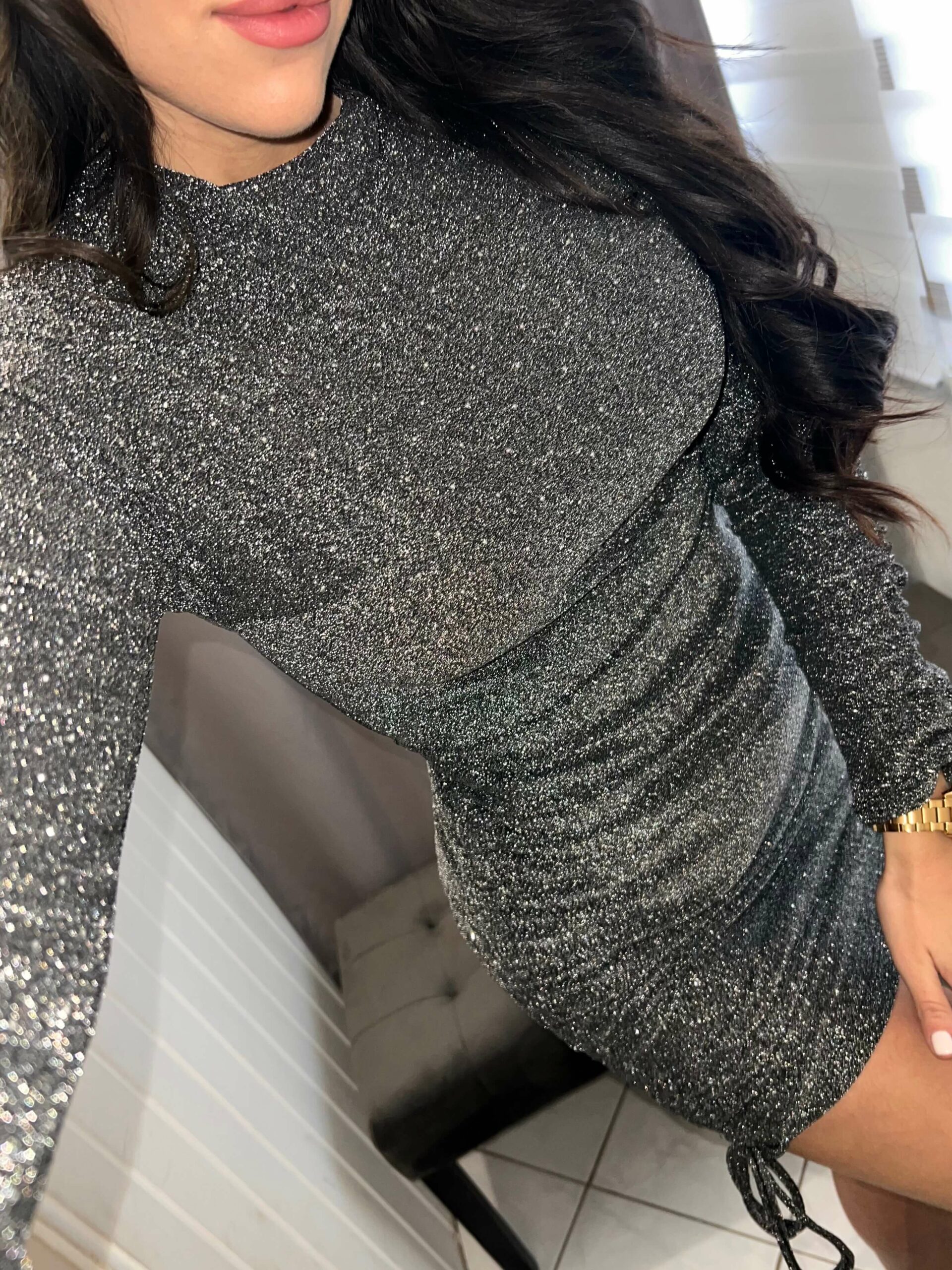 Hosszú ujjú, mini fazonú ruha.