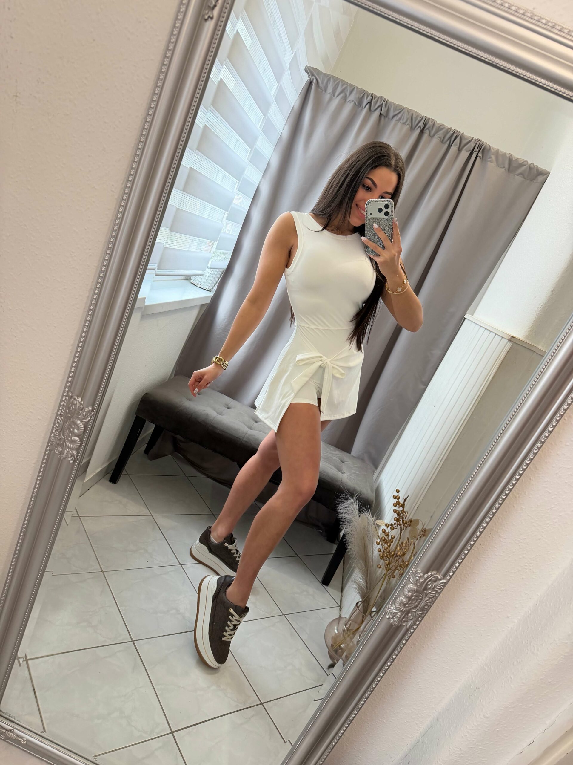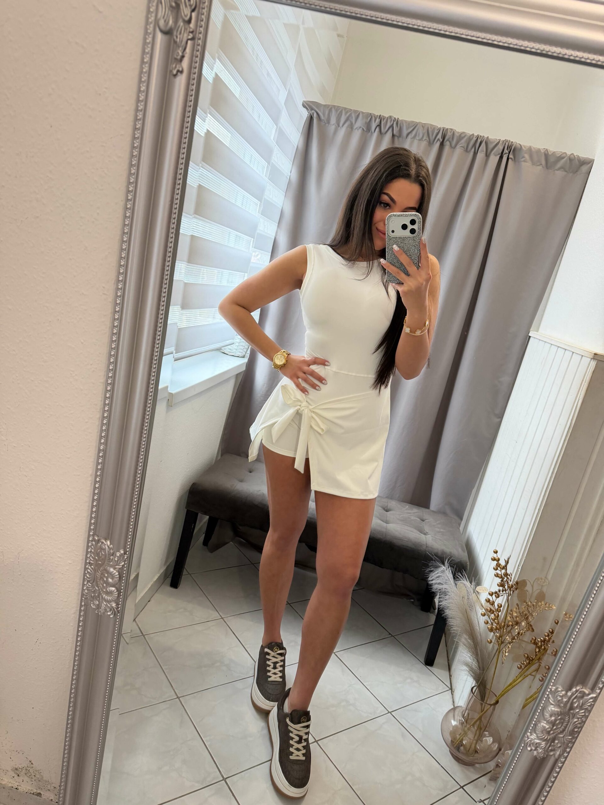 Terin ujjatlan szoknya nadrágos fehér overál.