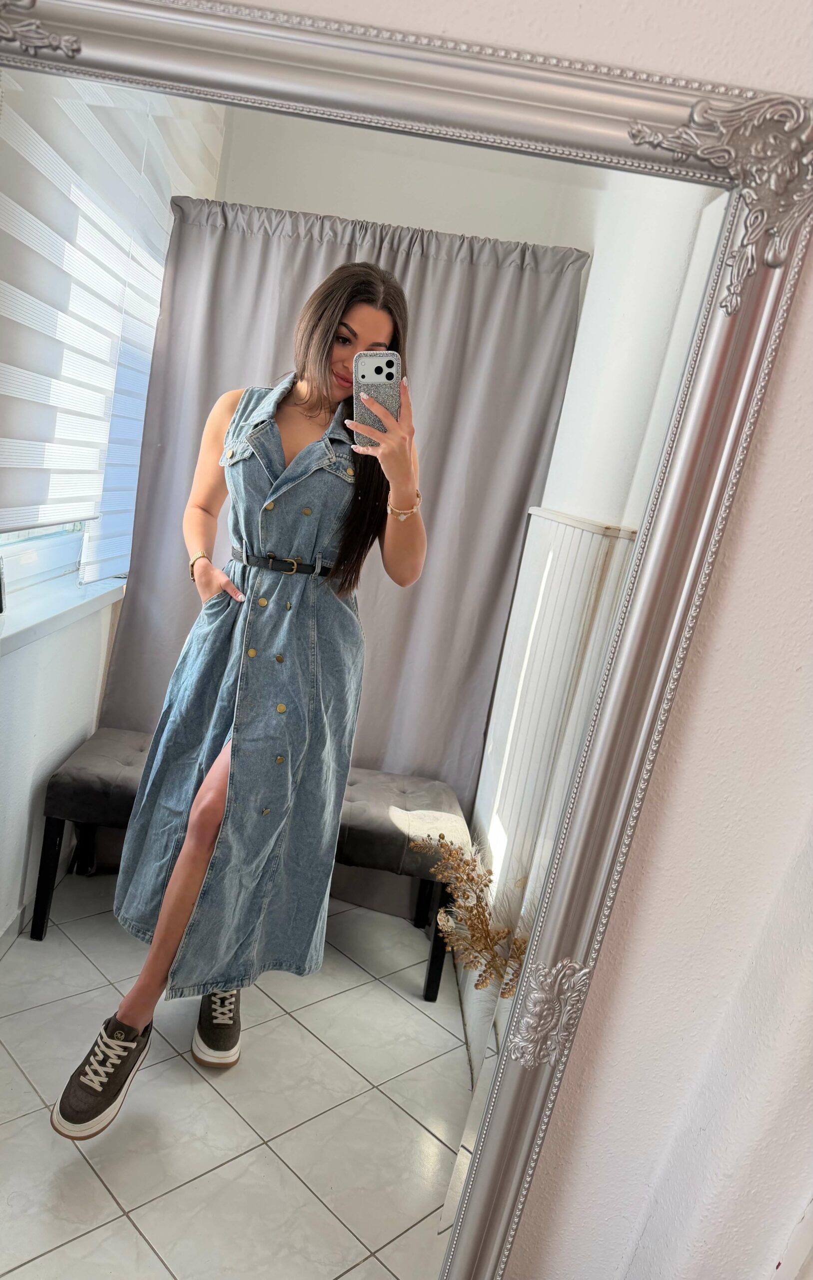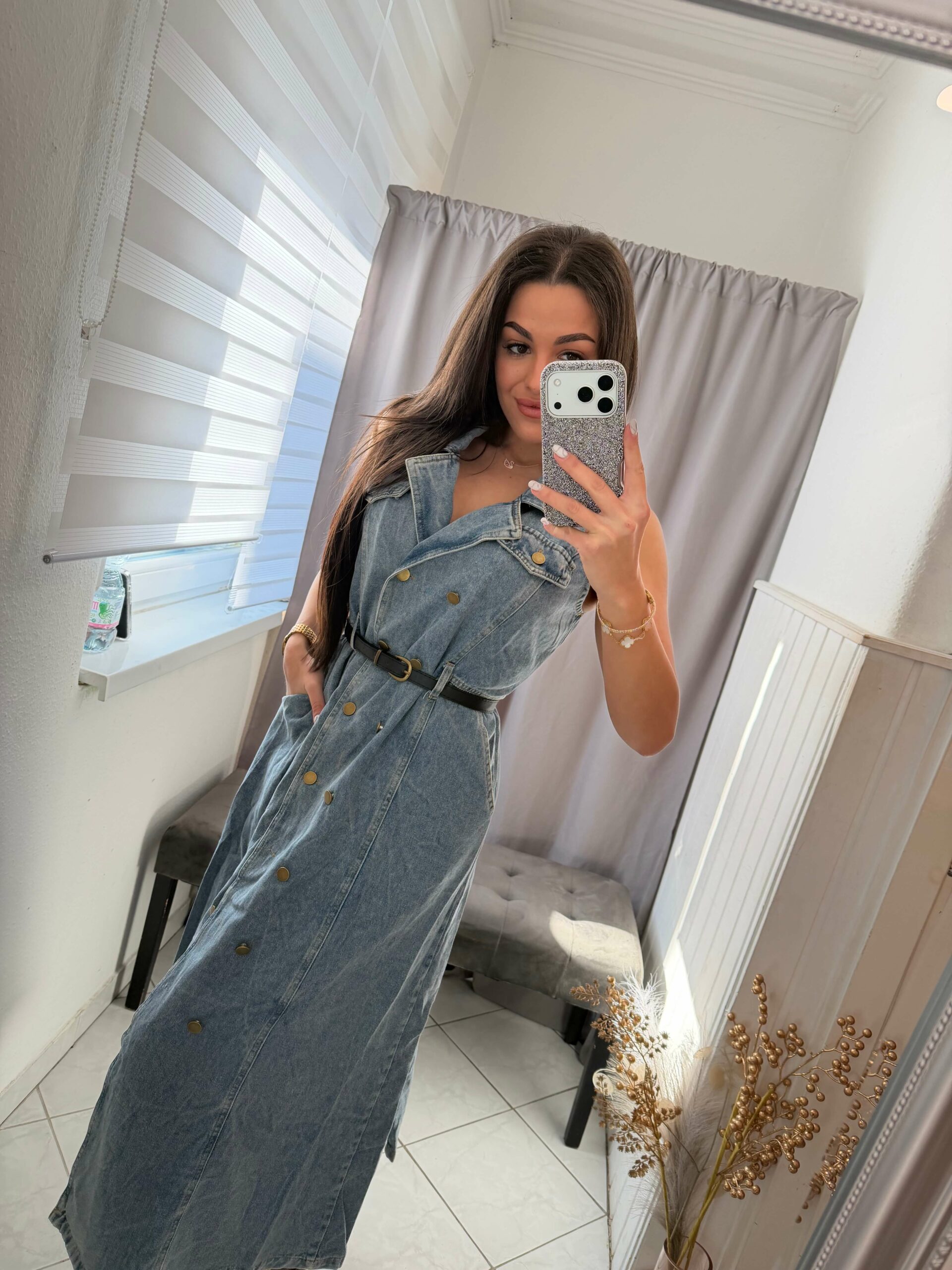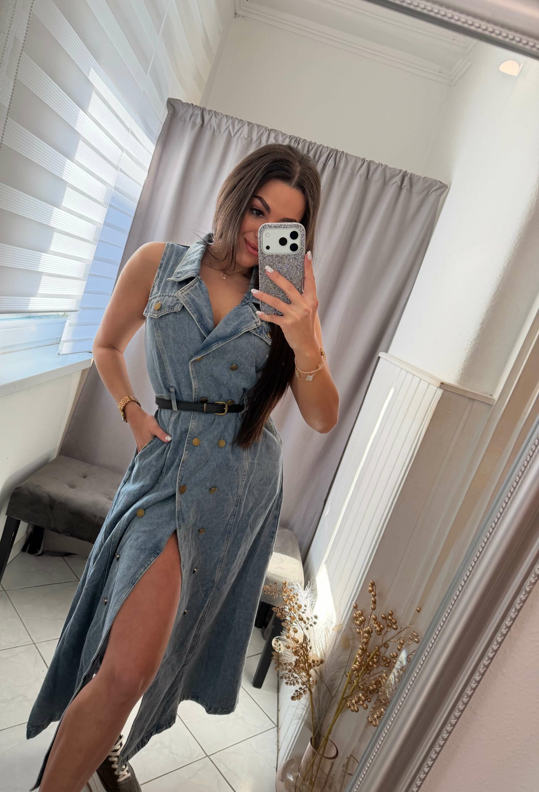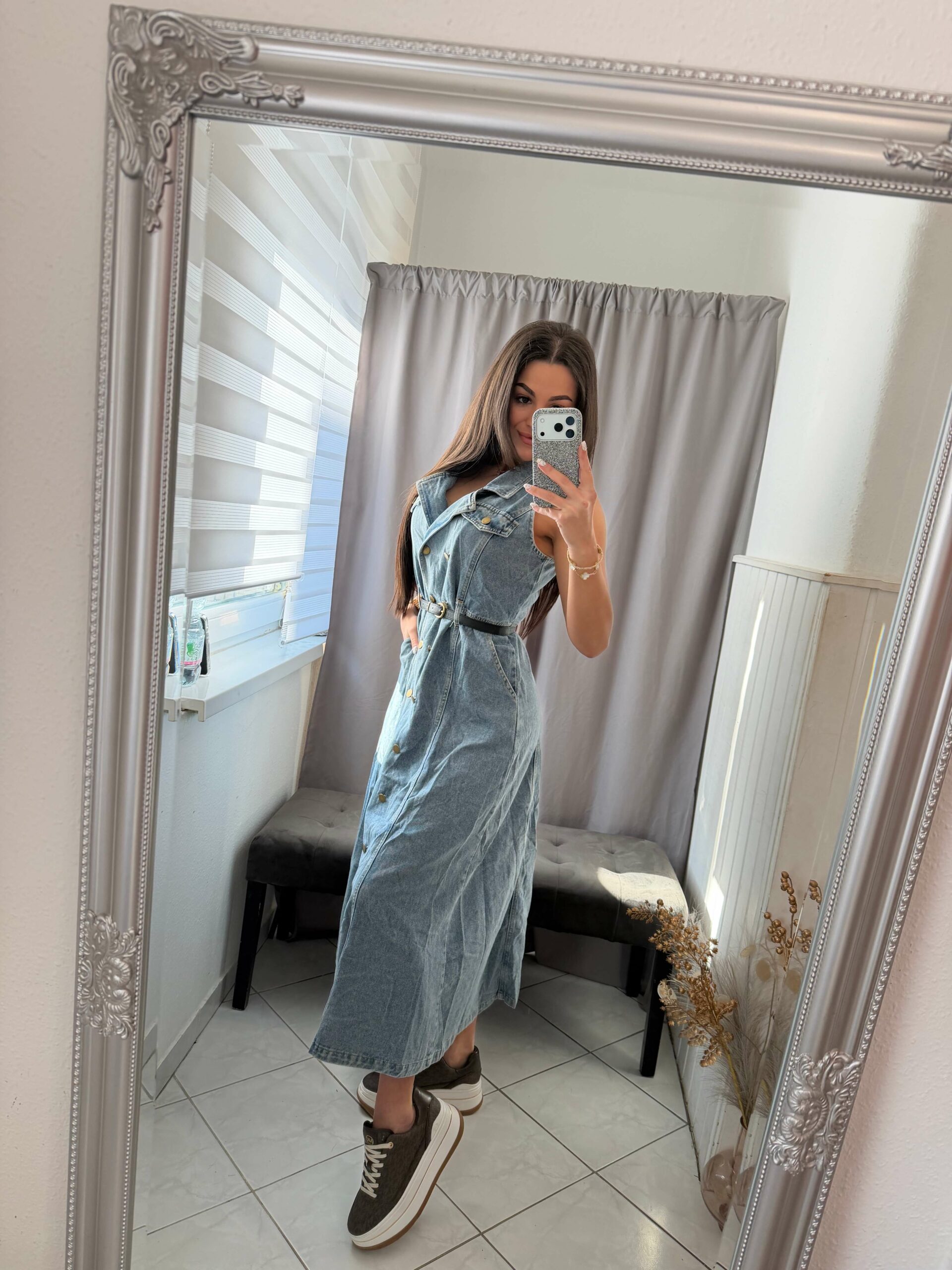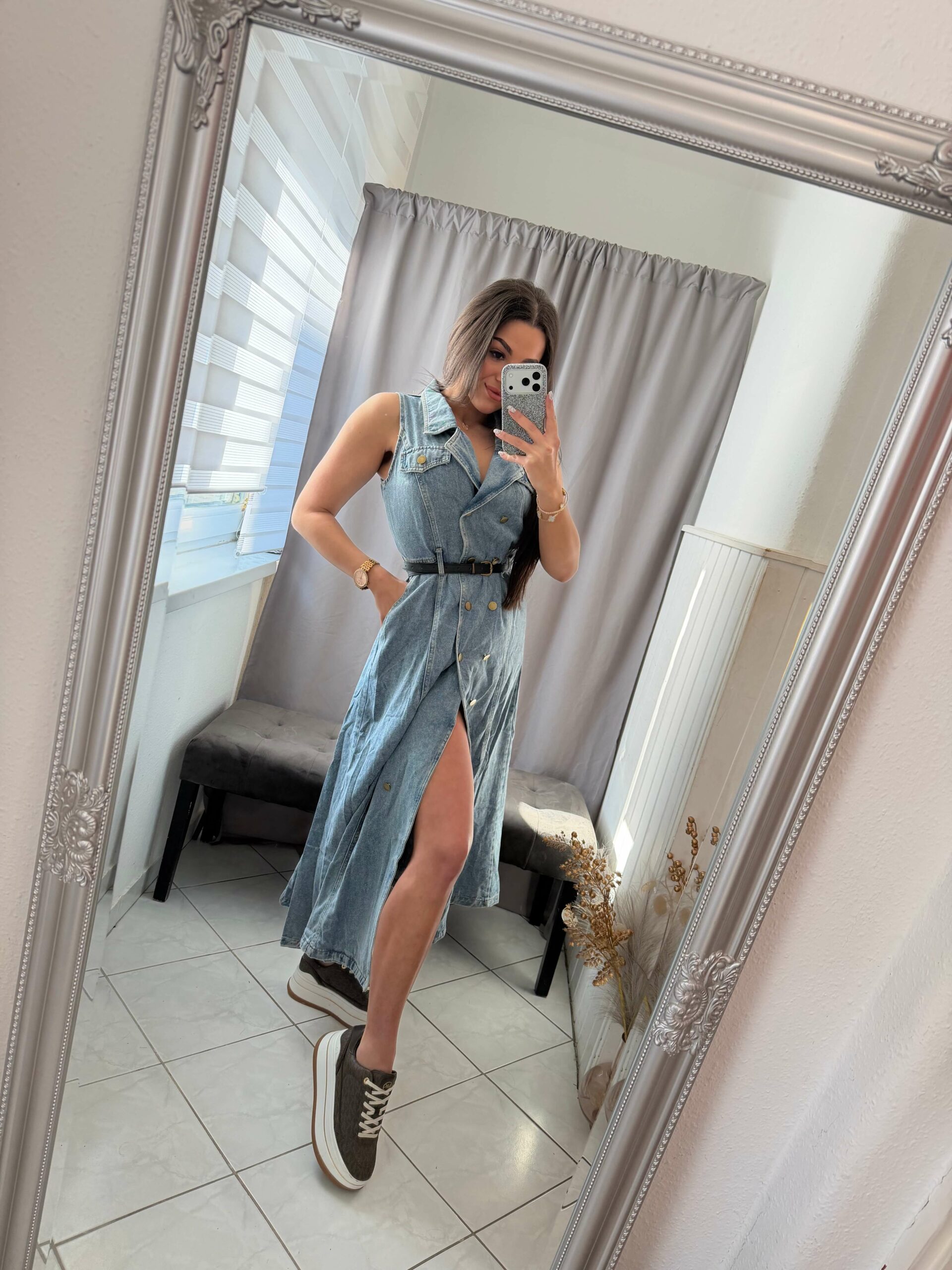 Derekán öves fazonú, kék farmer ruha.