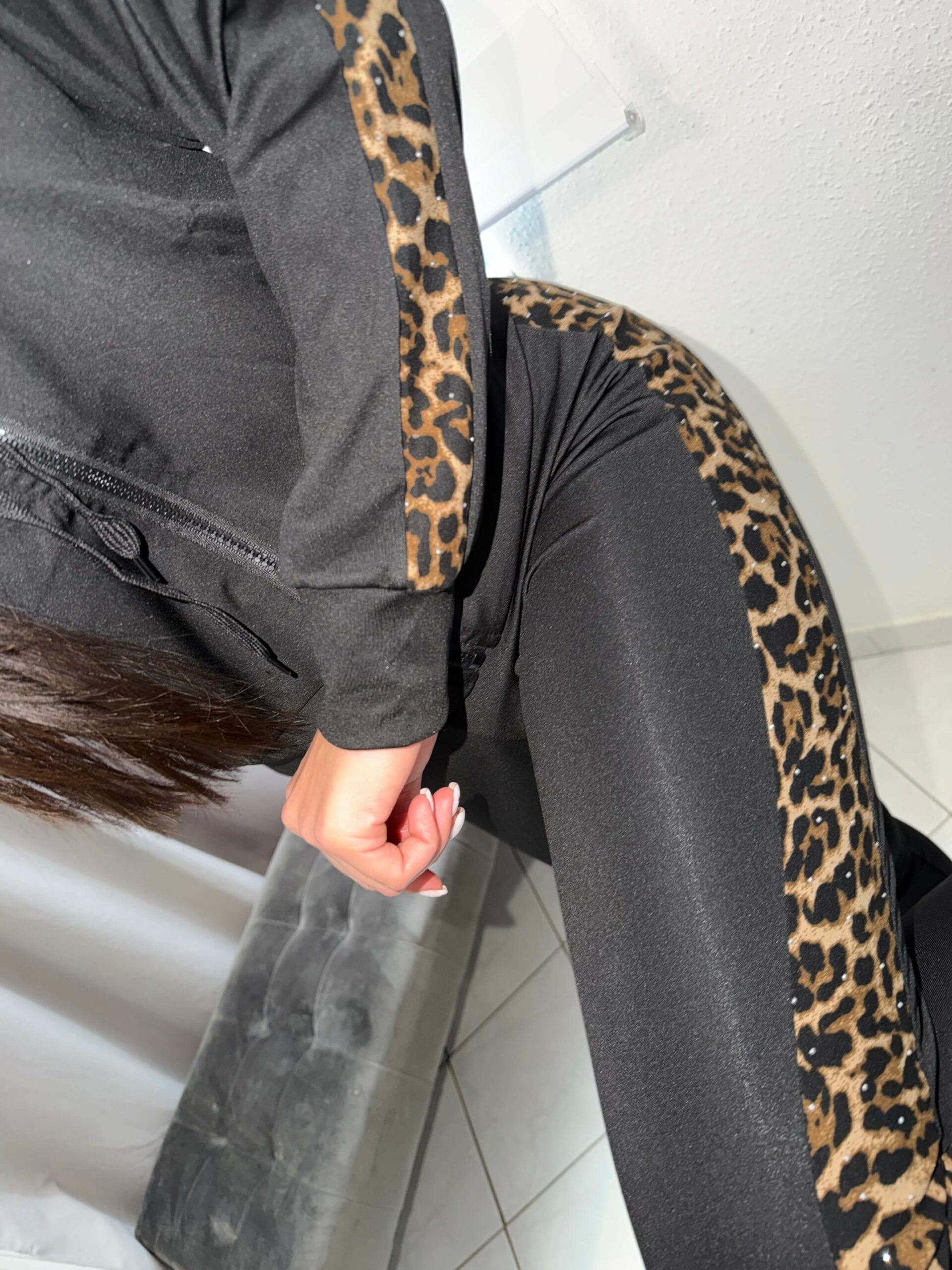 Fekete alapon oldalt fehér ocelot mintával diszitett.