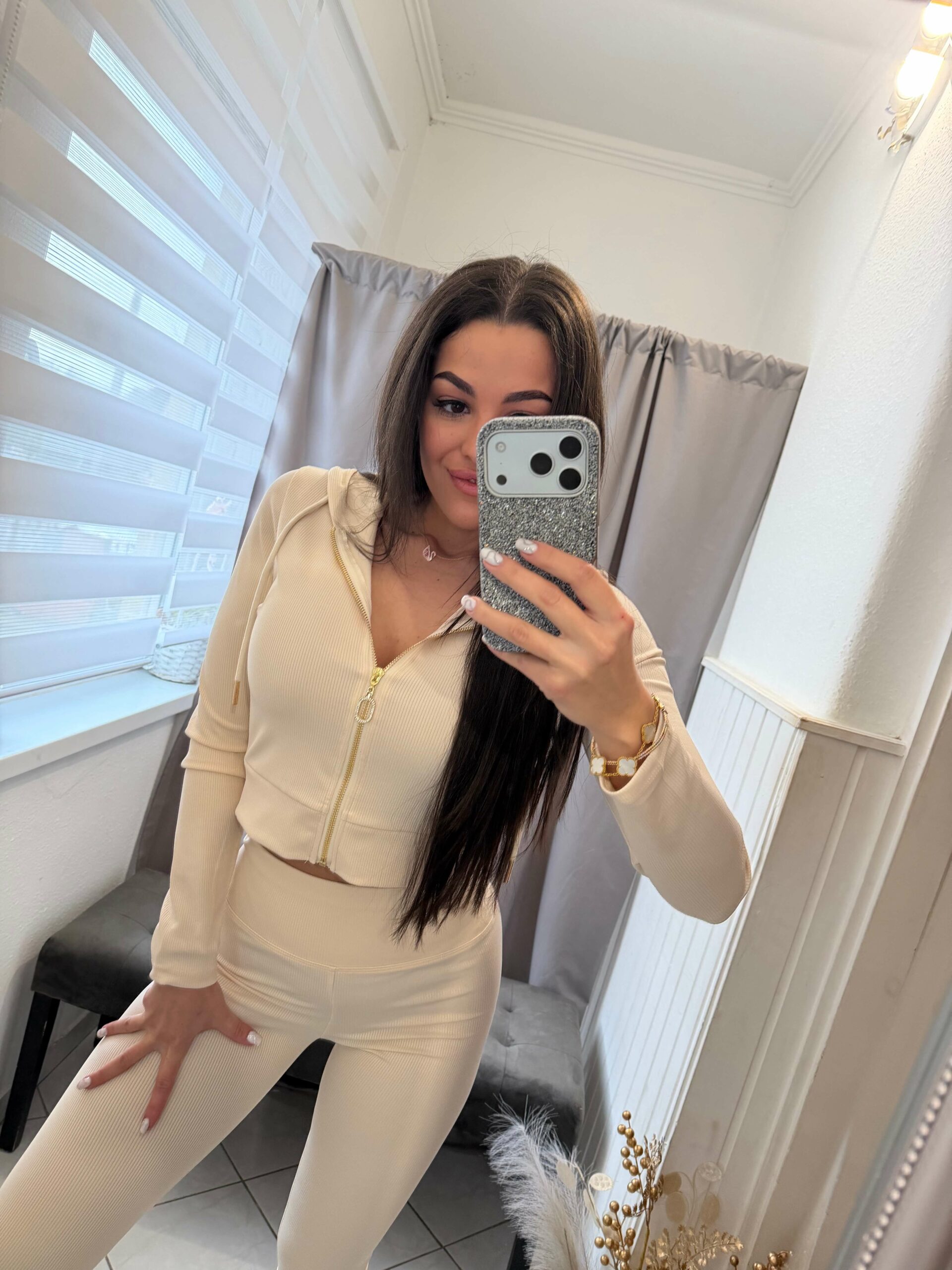Temi bordázott kétrészes bézs szett.