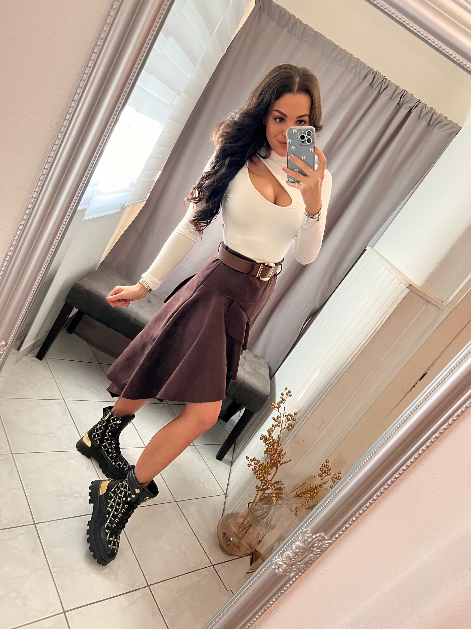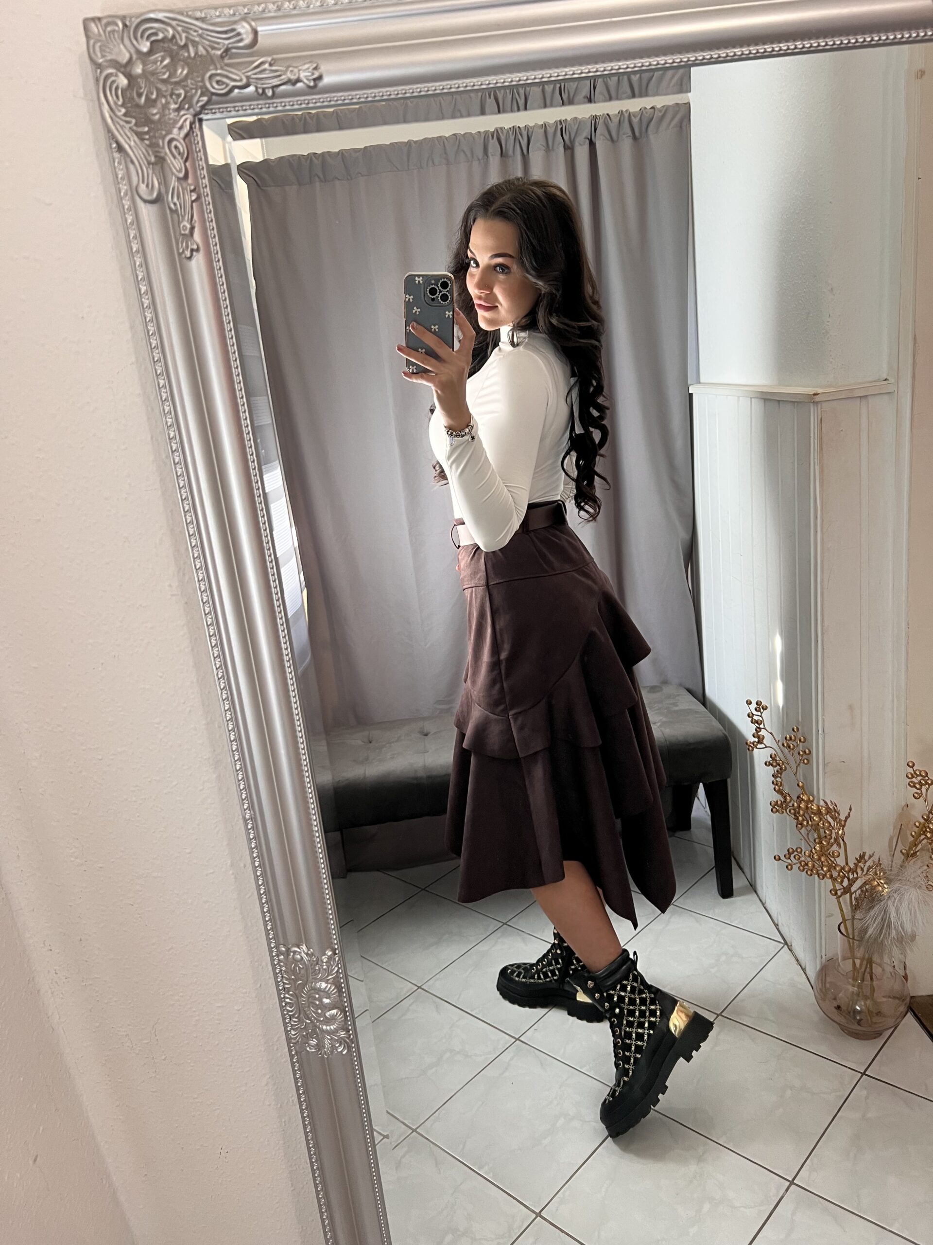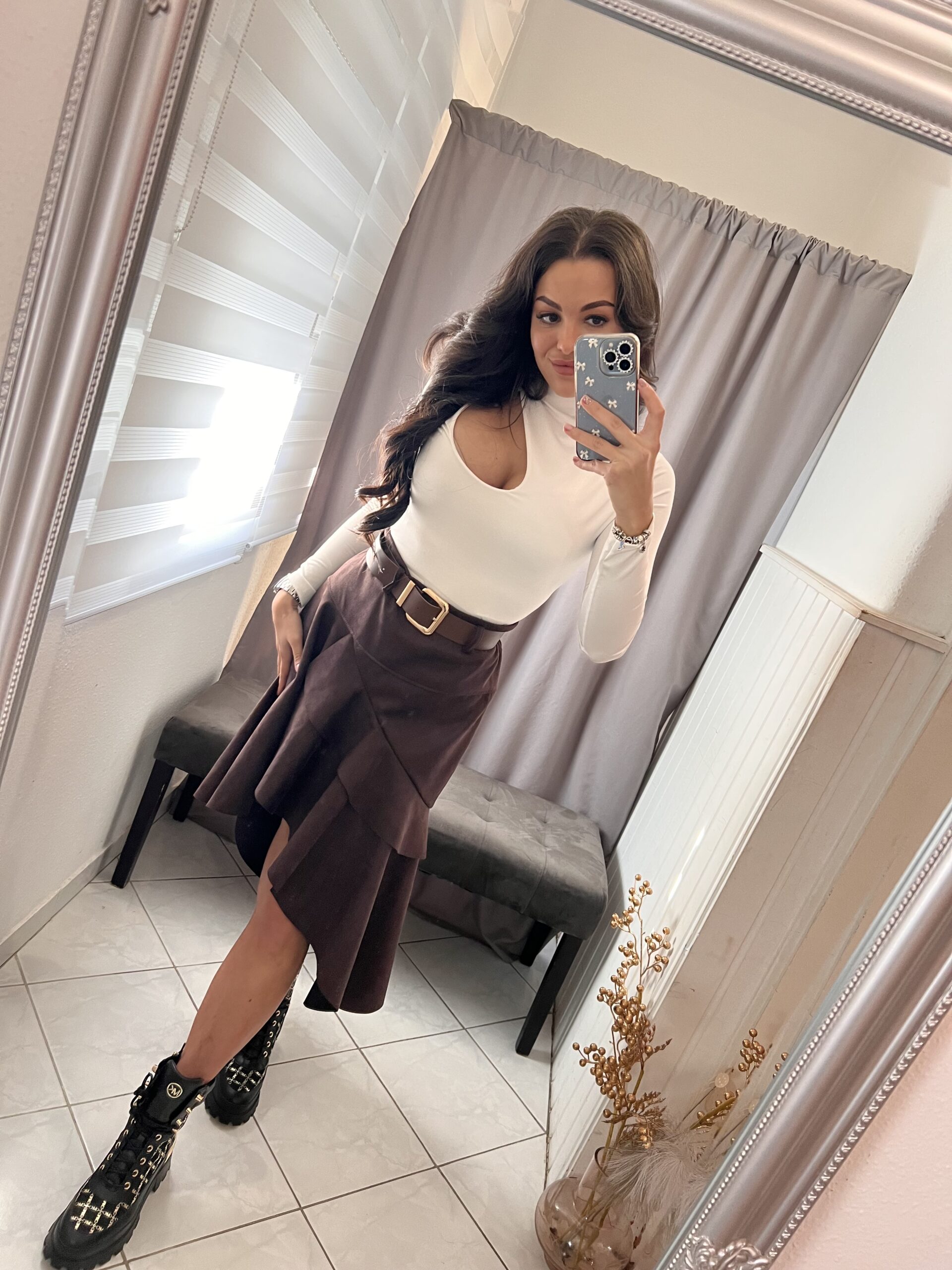 Firen fodros asszimetrikus csoki barna szoknya. Derekán övvel.