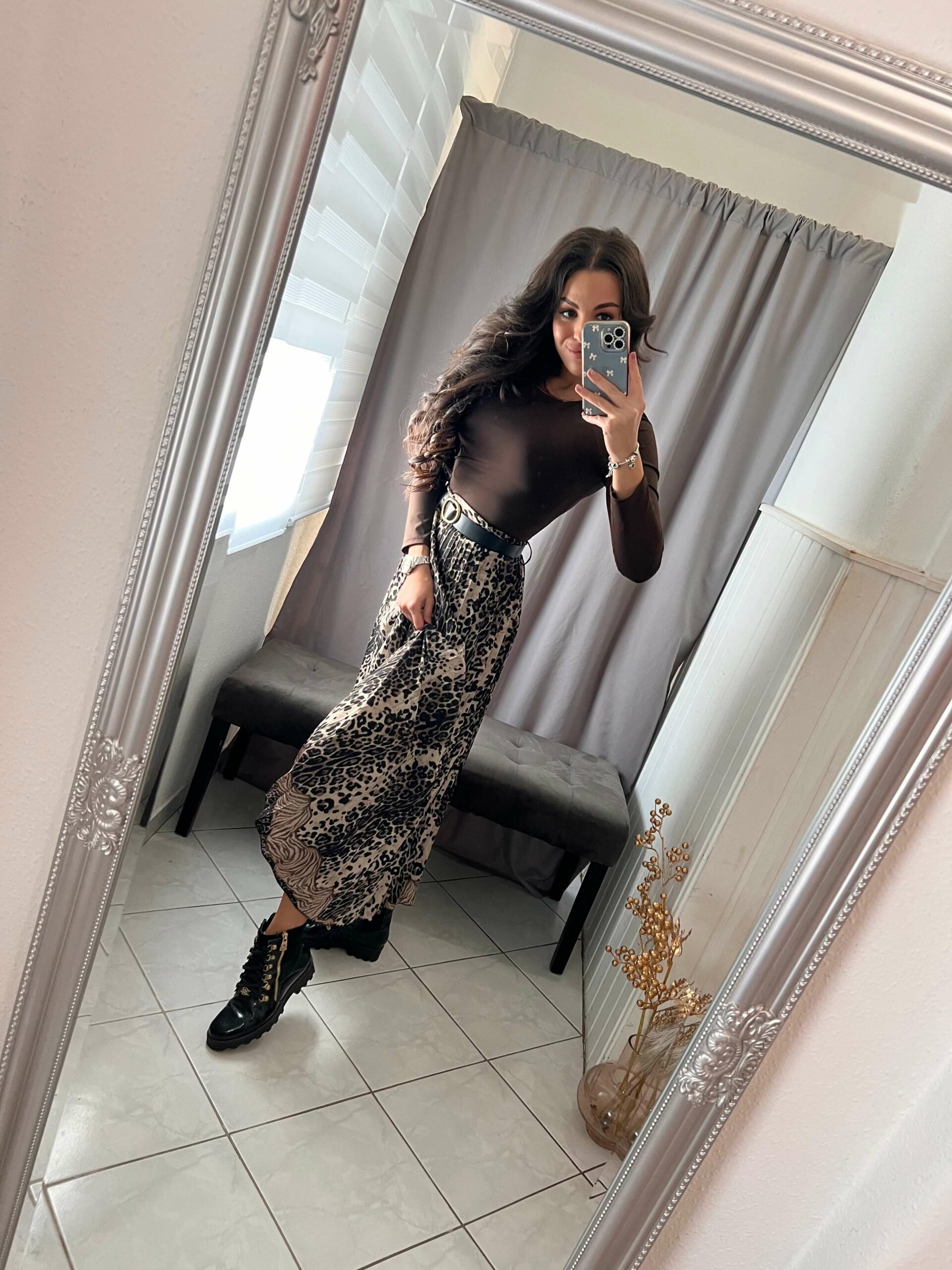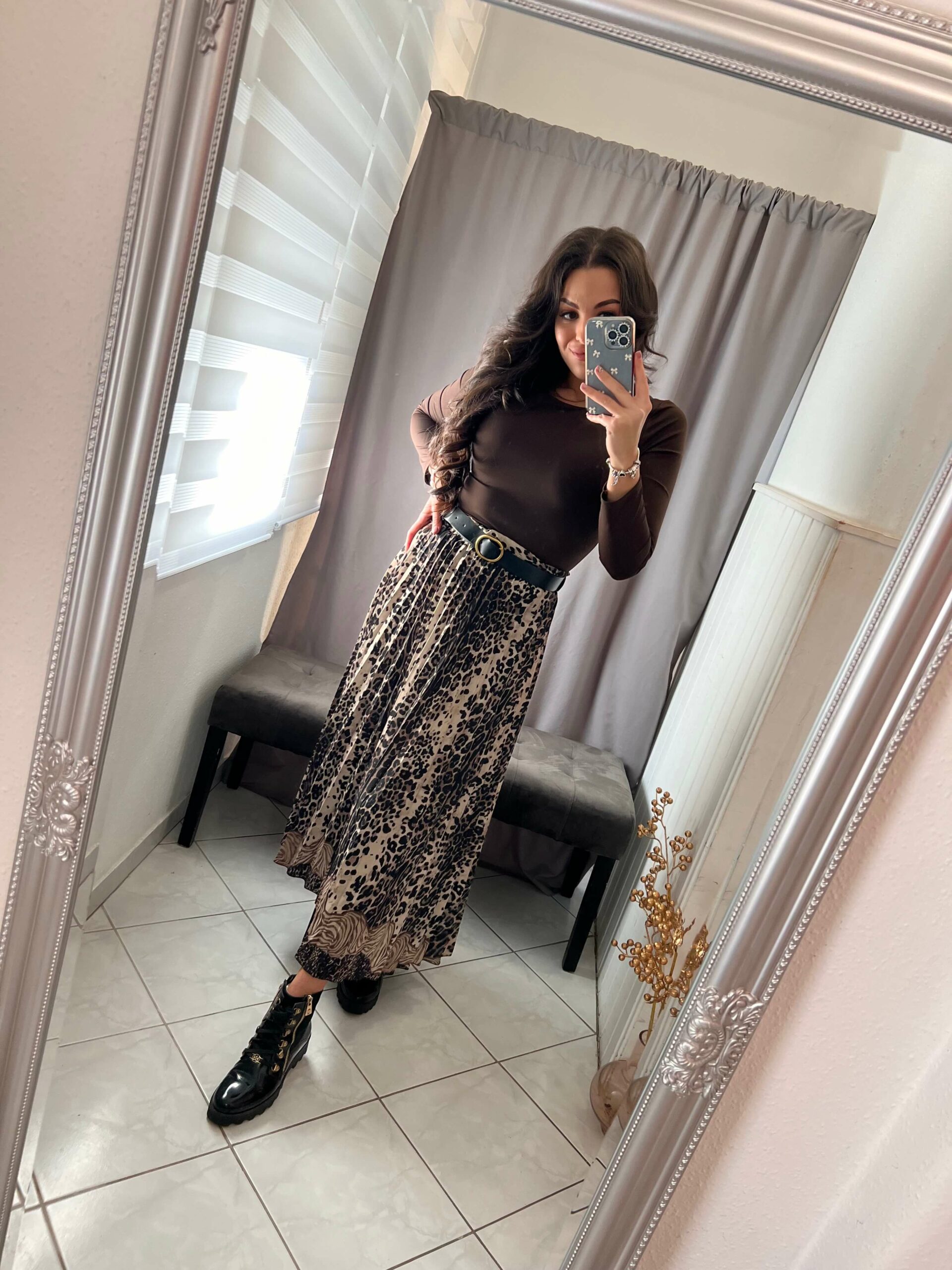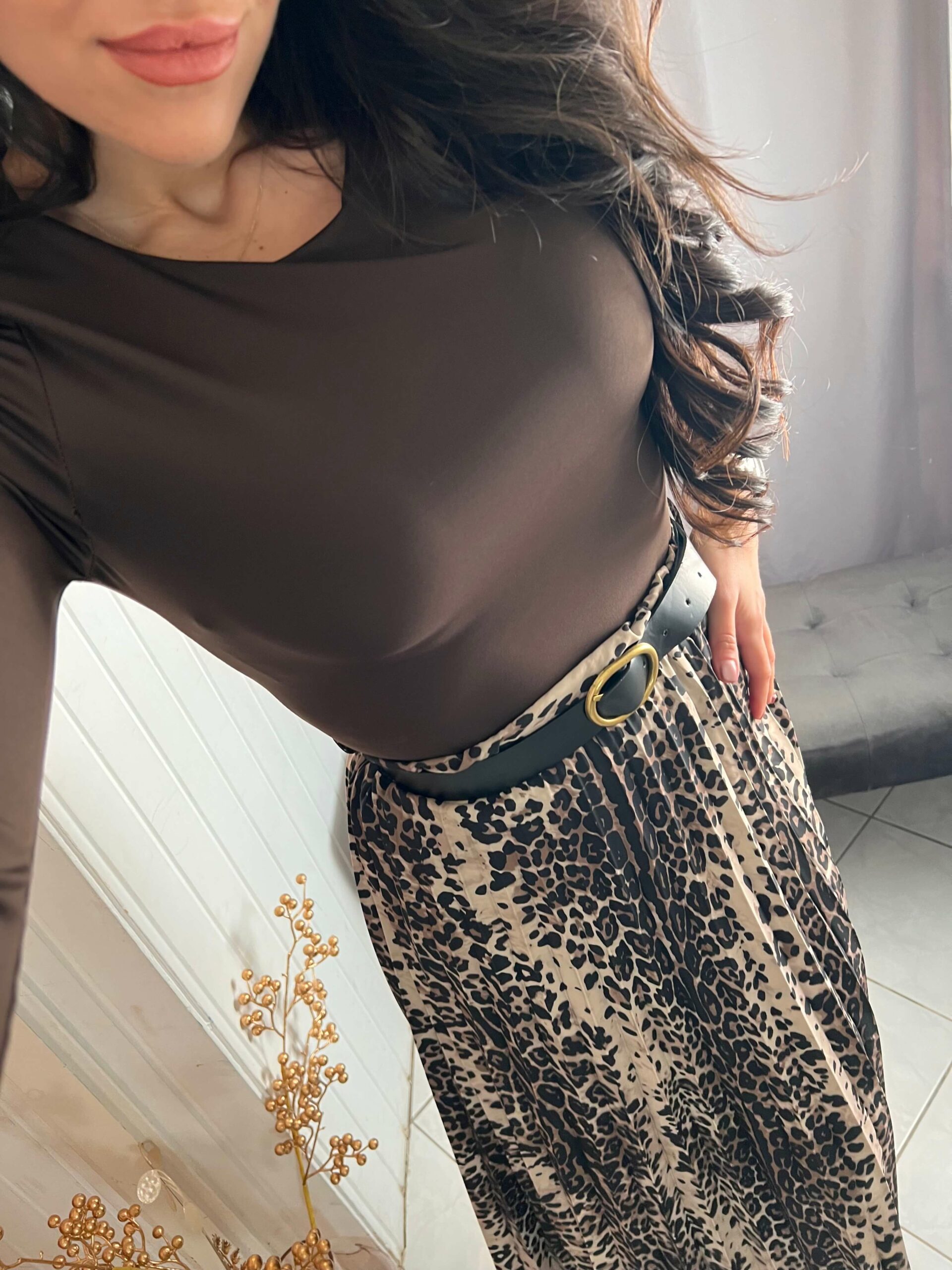 Manna pliszírozott maxi ocelot mintás szoknya, derekán övvel.