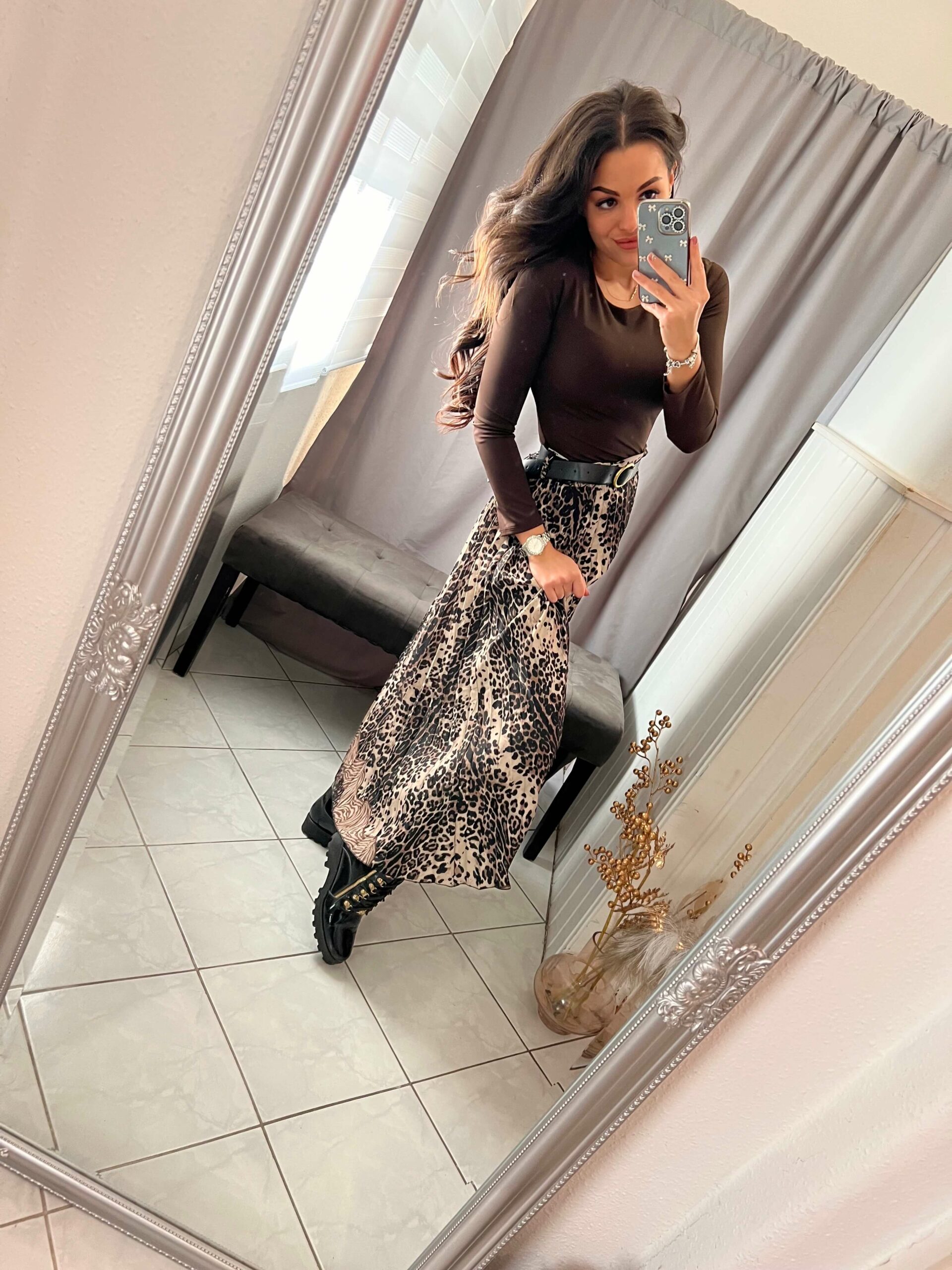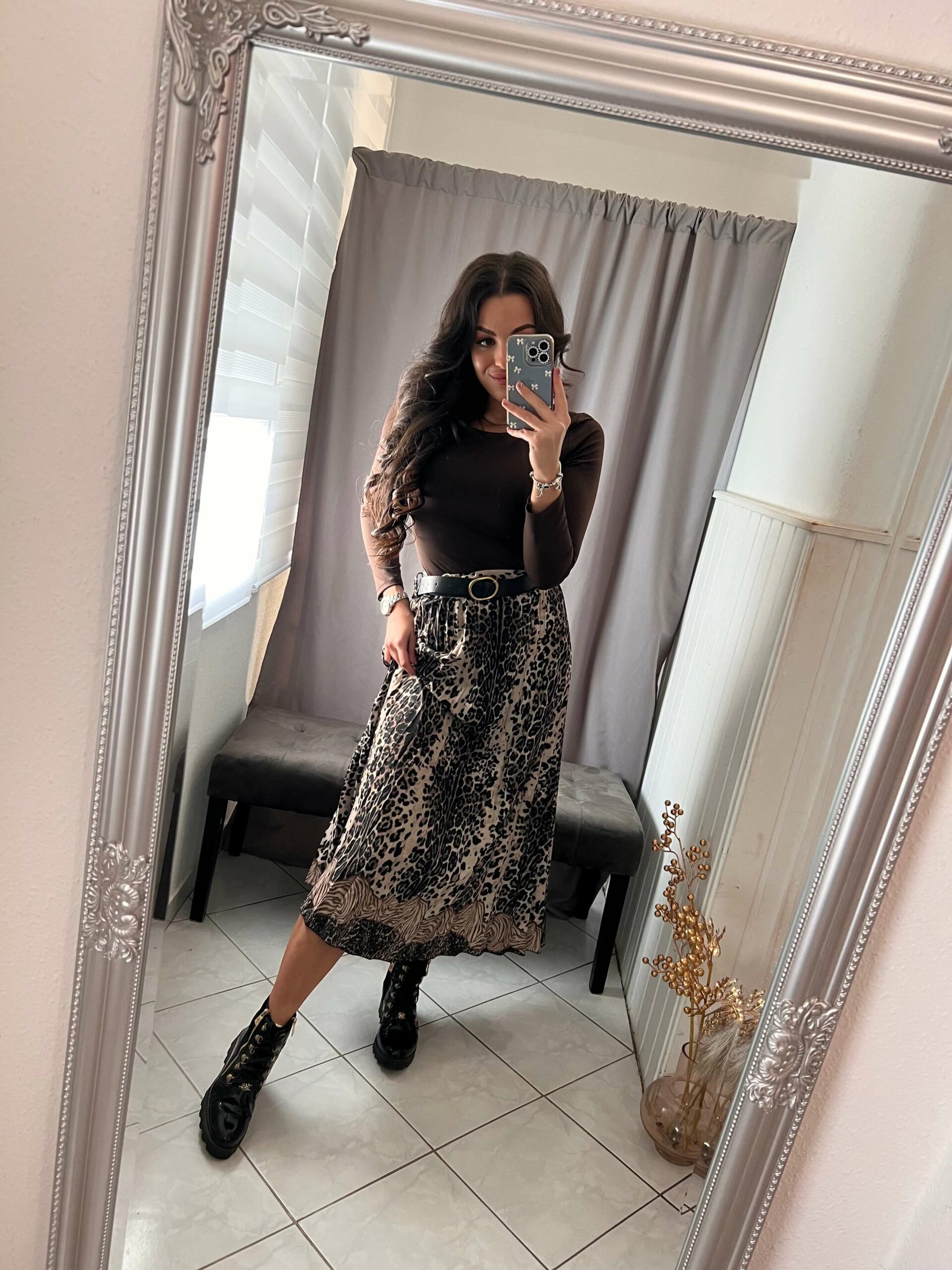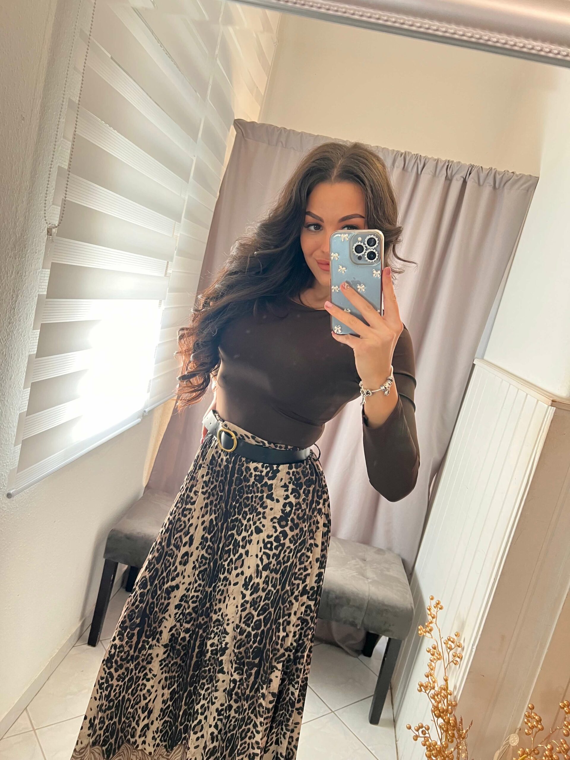 Manna pliszírozott maxi ocelot mintás szoknya, derekán övvel.