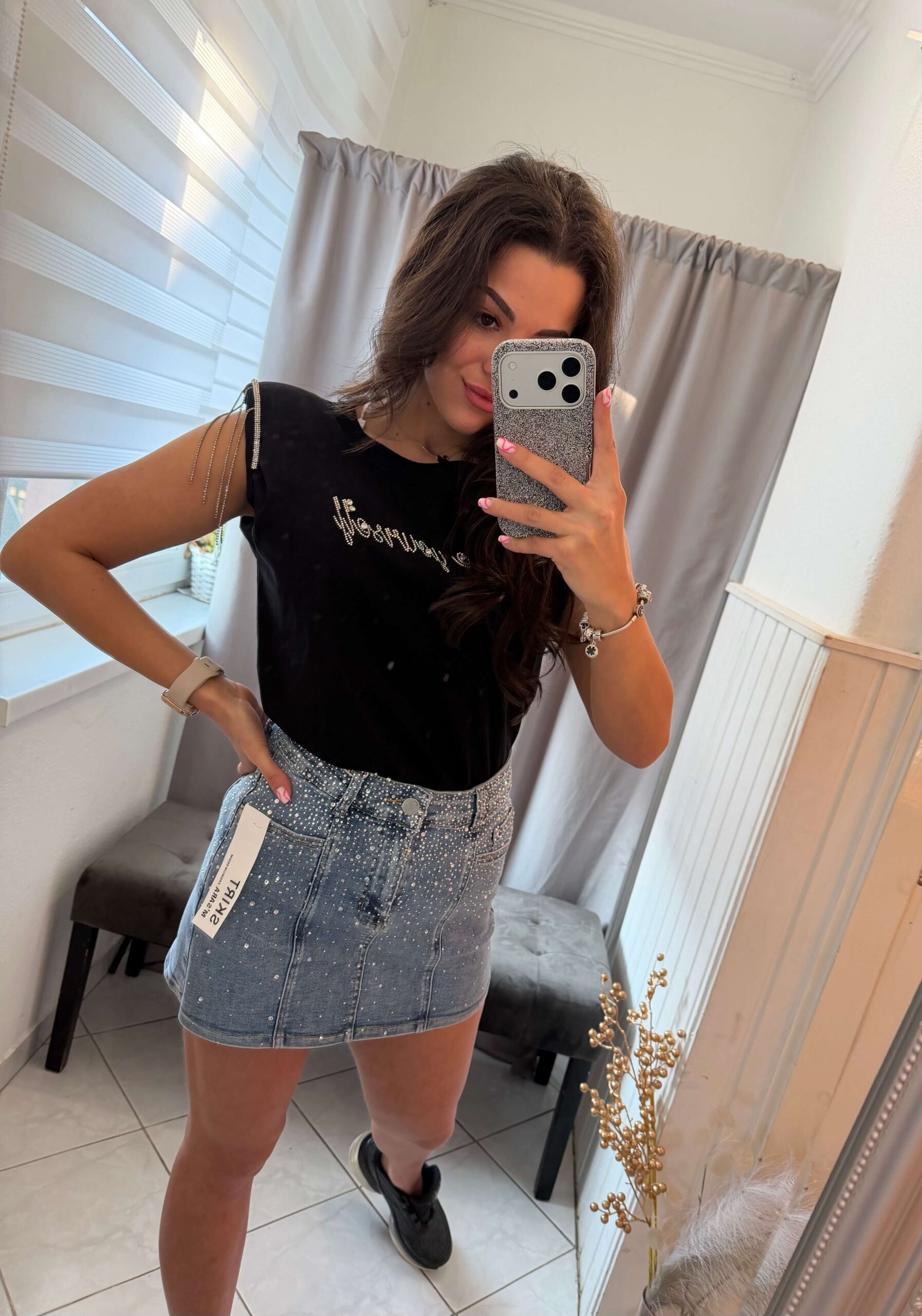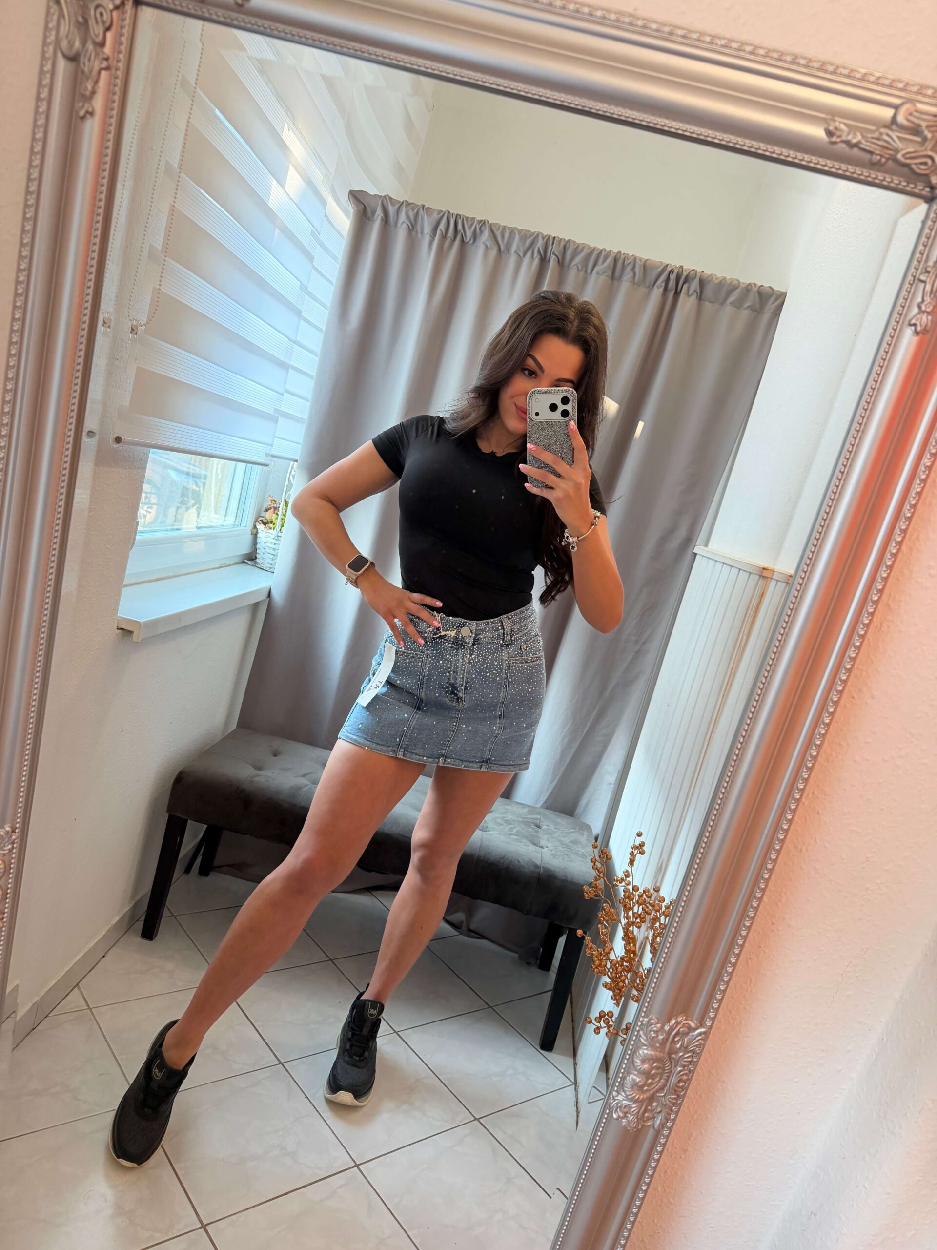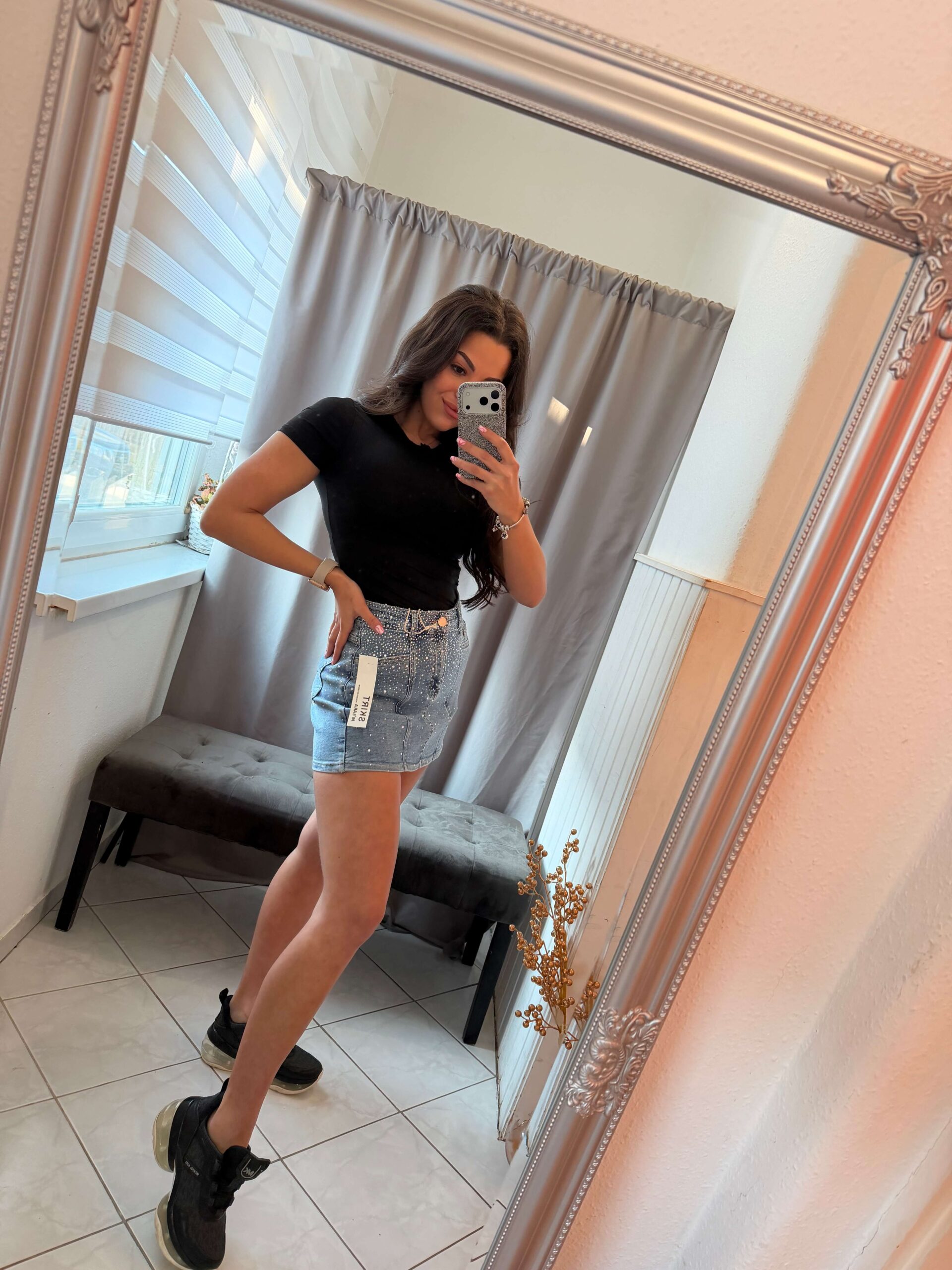 Zena kék kövezett farmer szoknya nadrág.