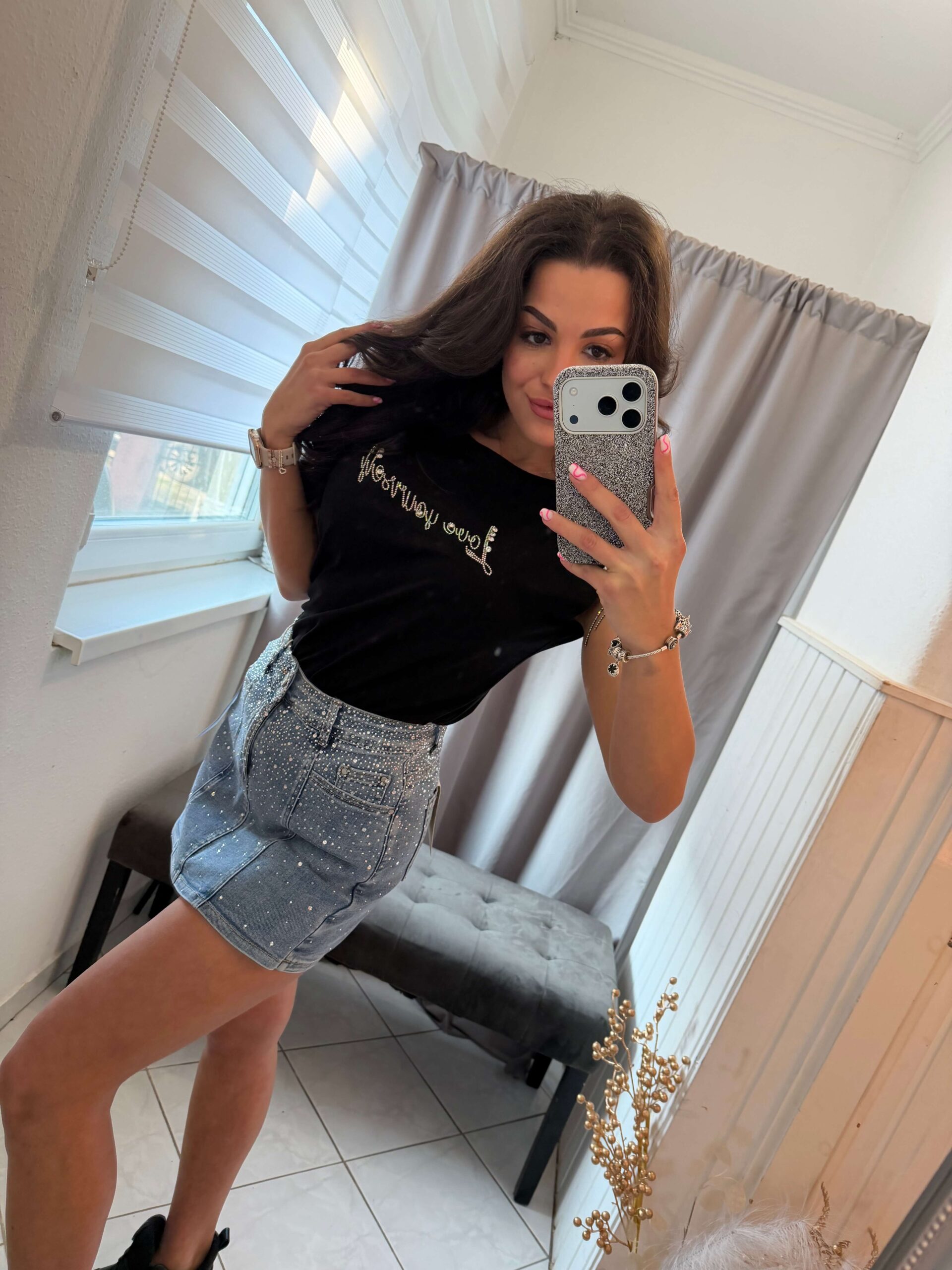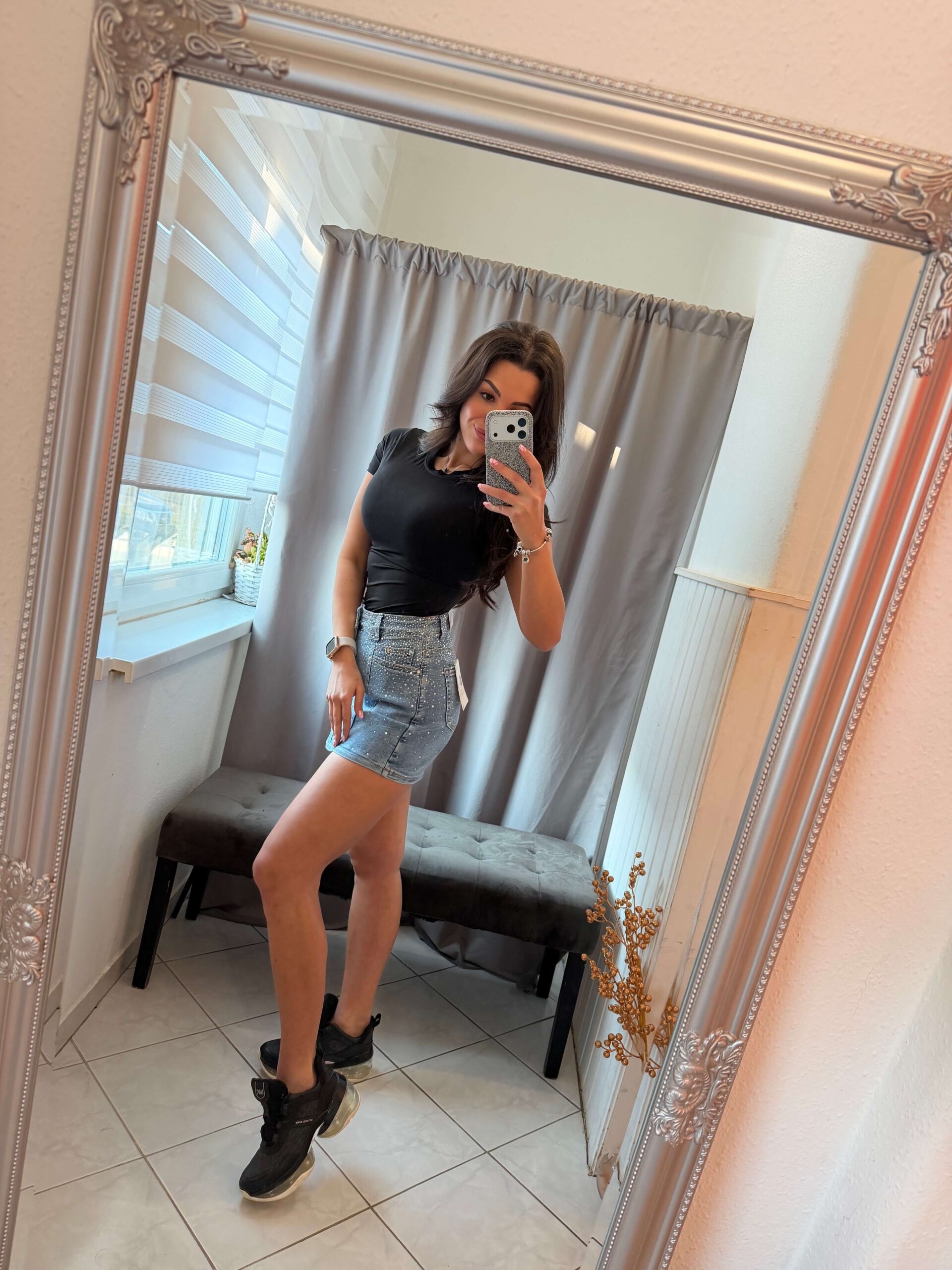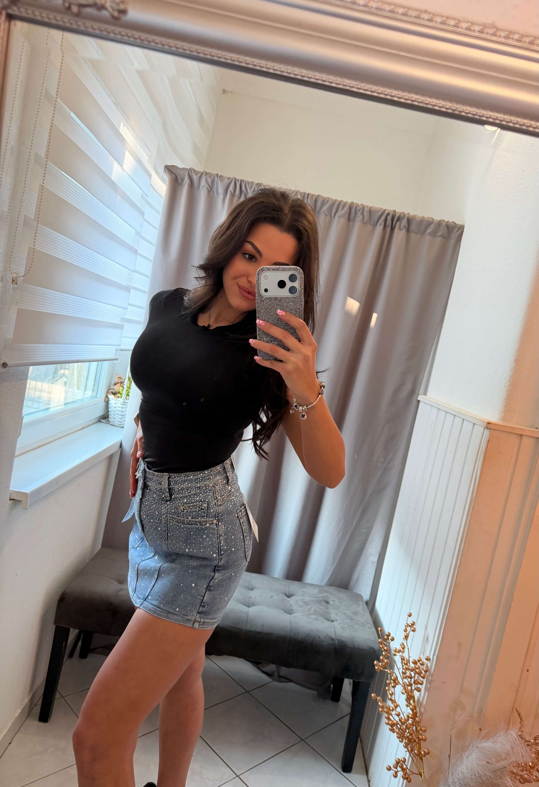 Zena kék kövezett farmer szoknya nadrág.
