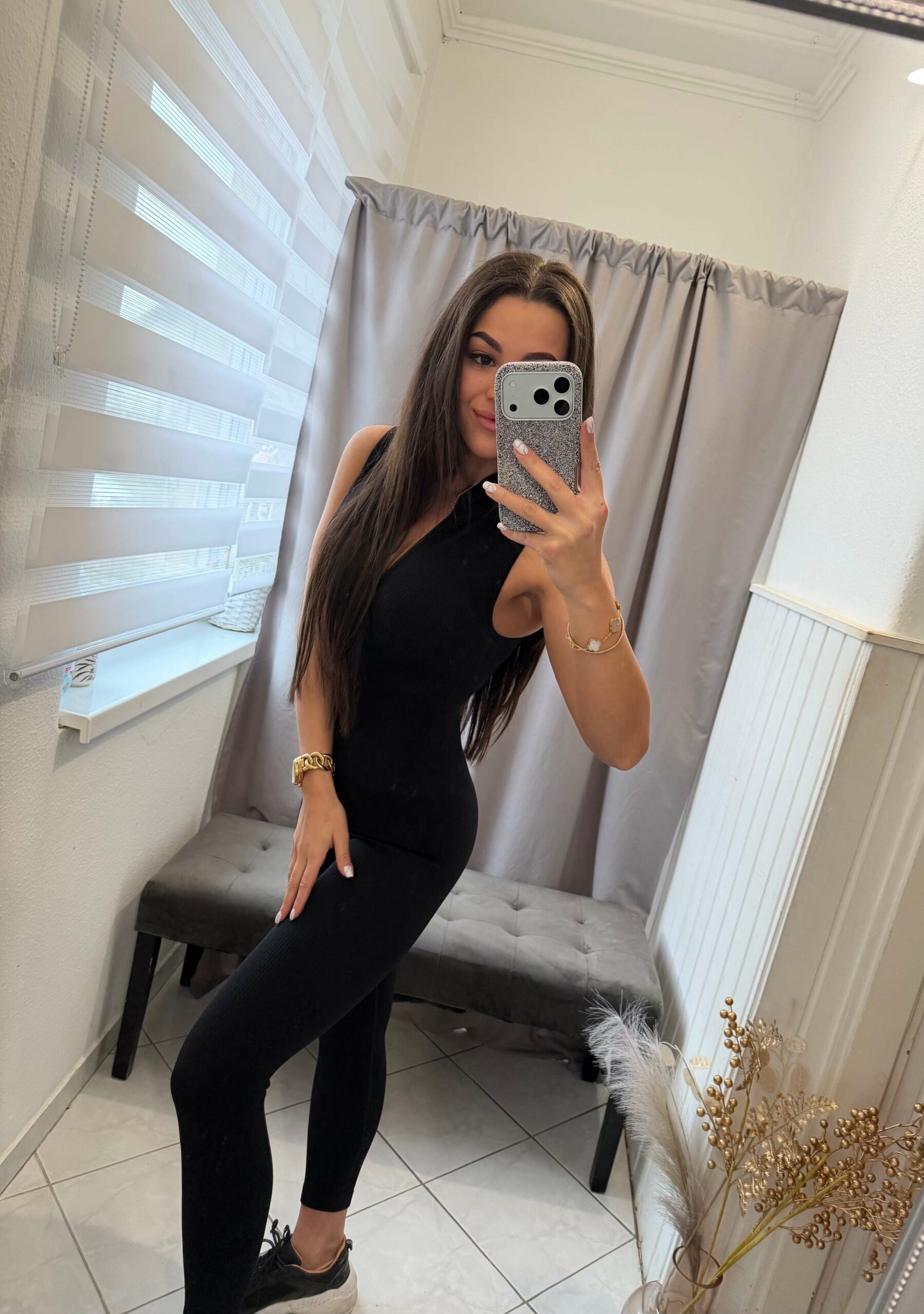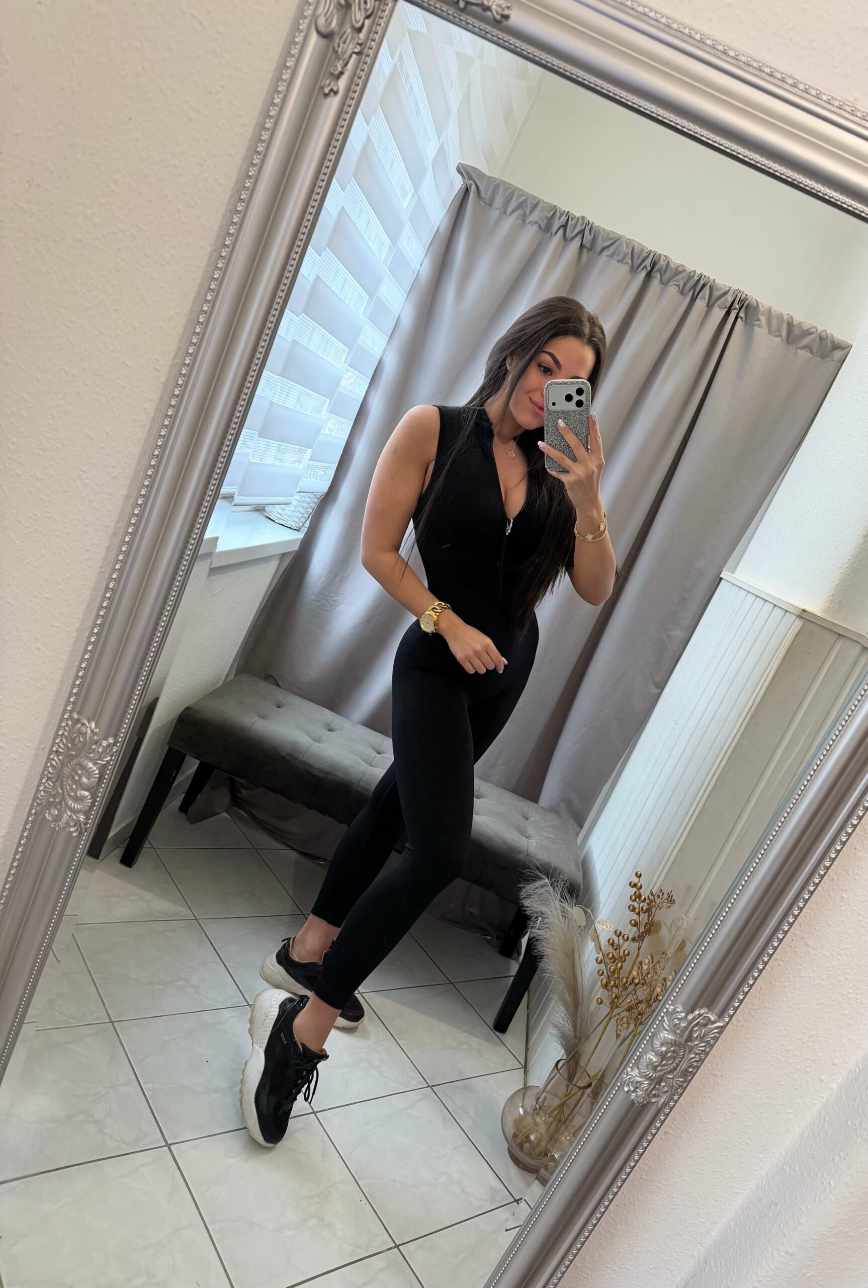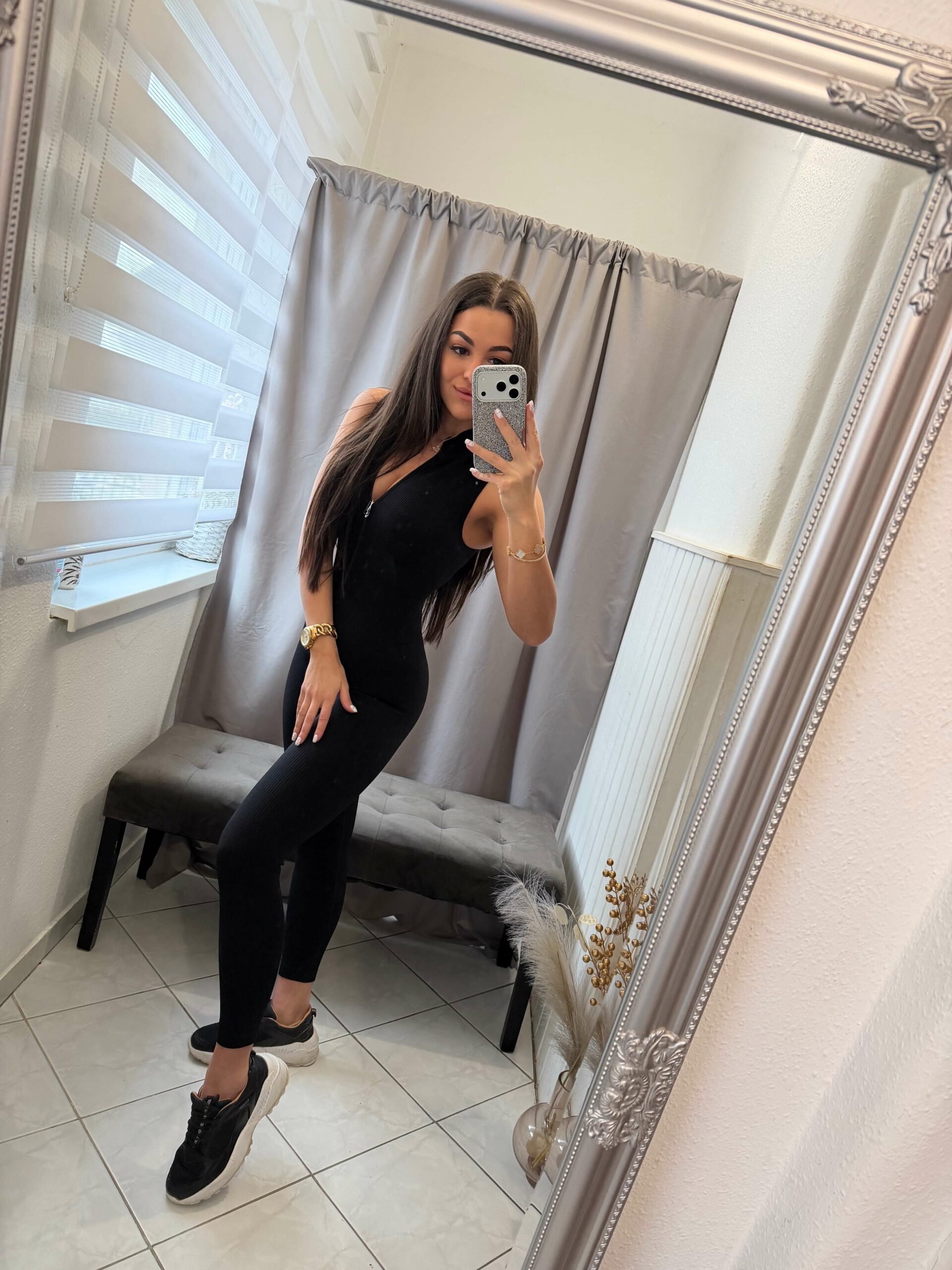 Fazon: cipzáras fazon, fekete ujjatlan hosszú nadrágos alakformáló overál.