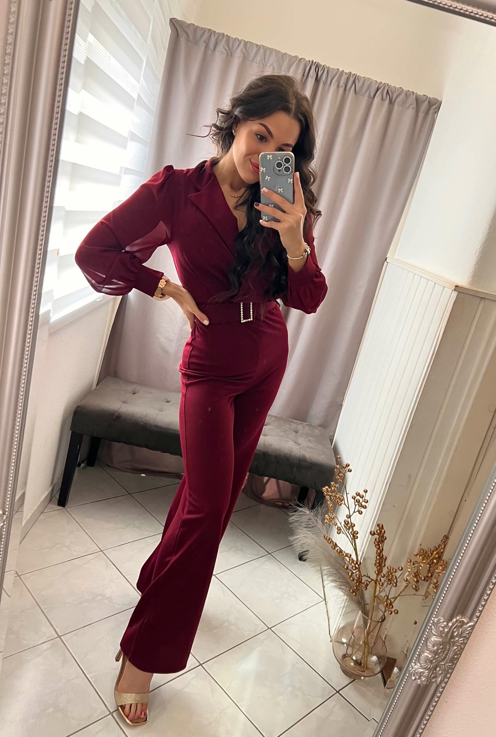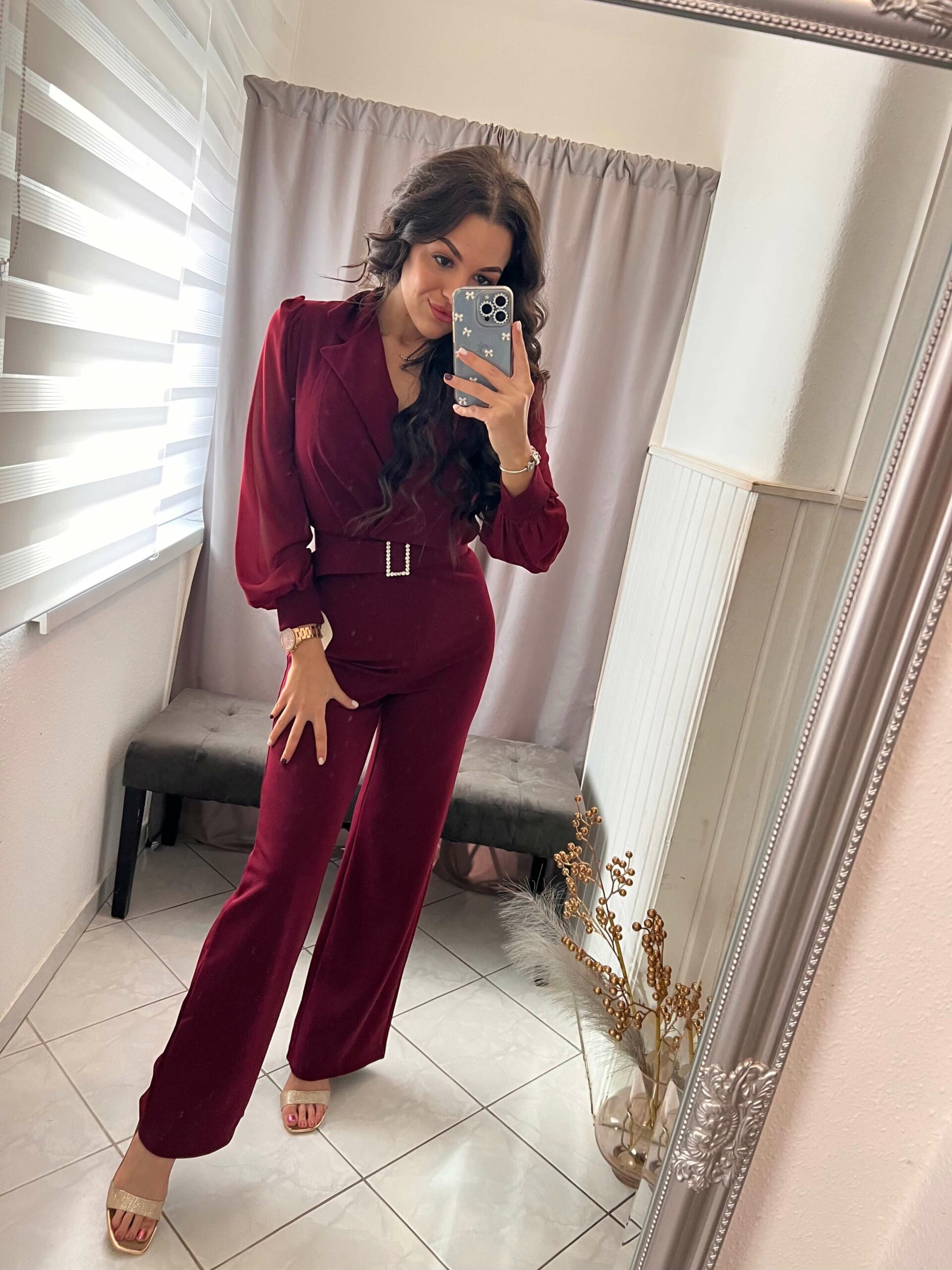 Magasitott nyakú, bő szárú tüllös fazonú , derekán öves overál.