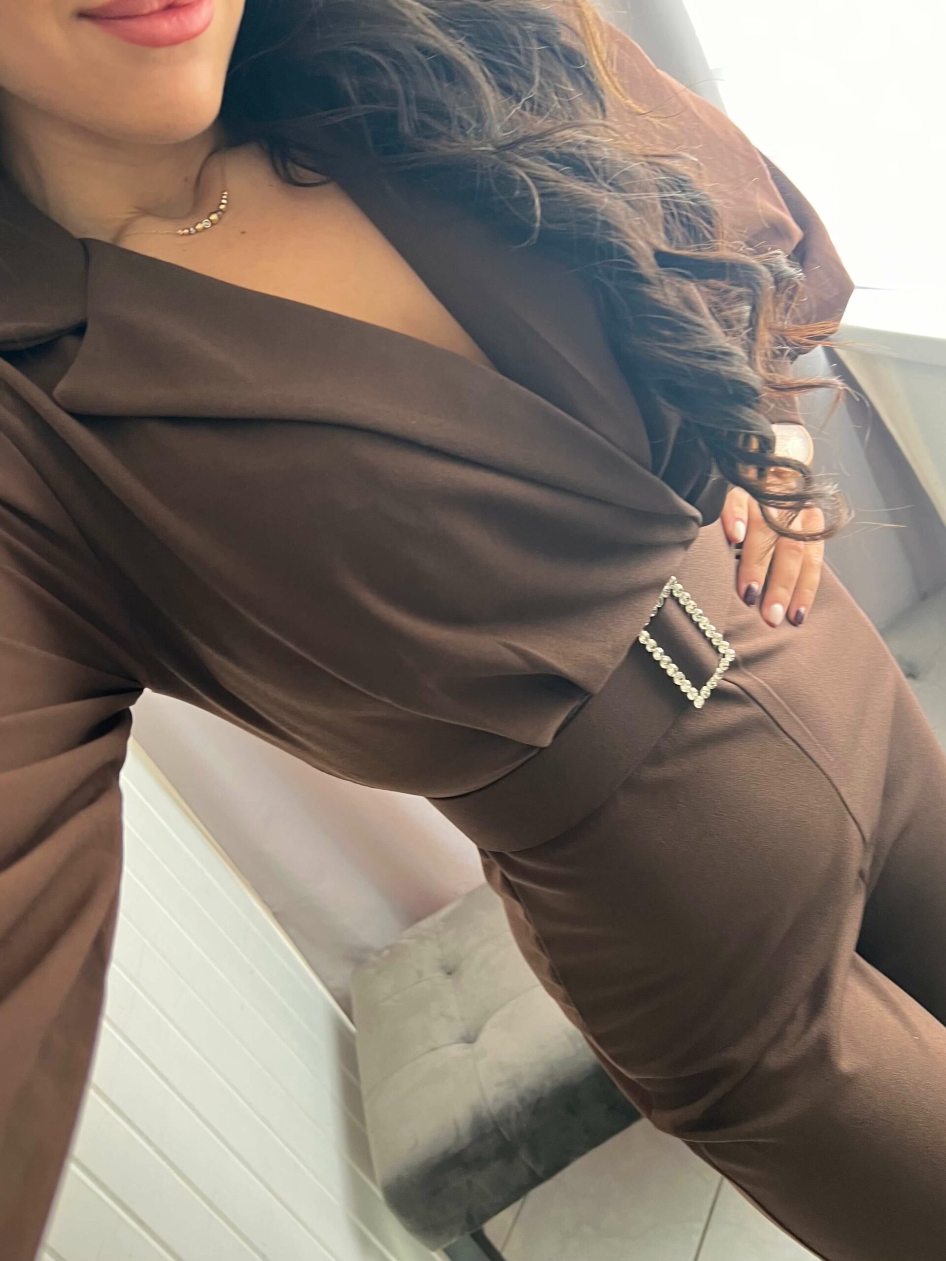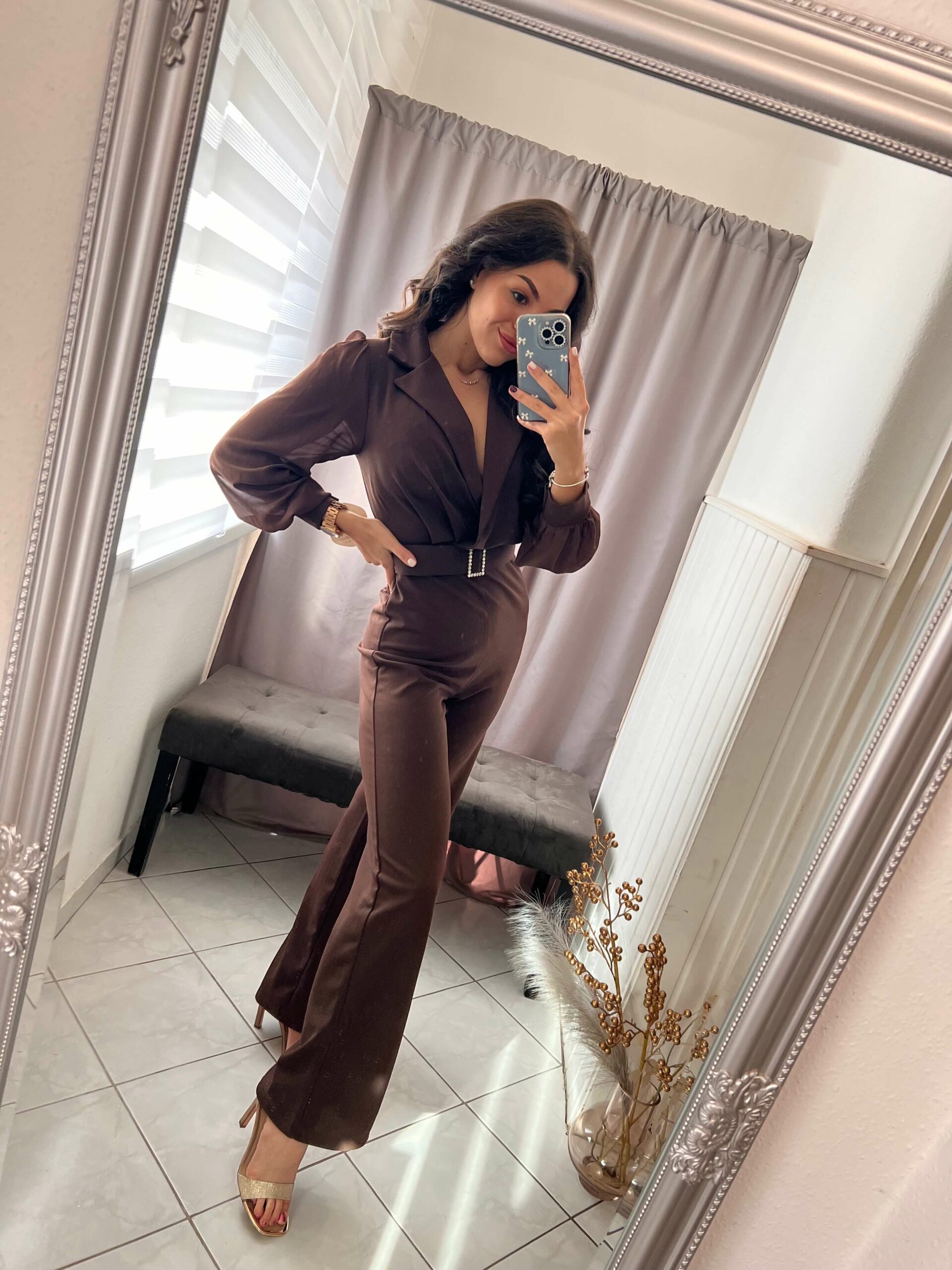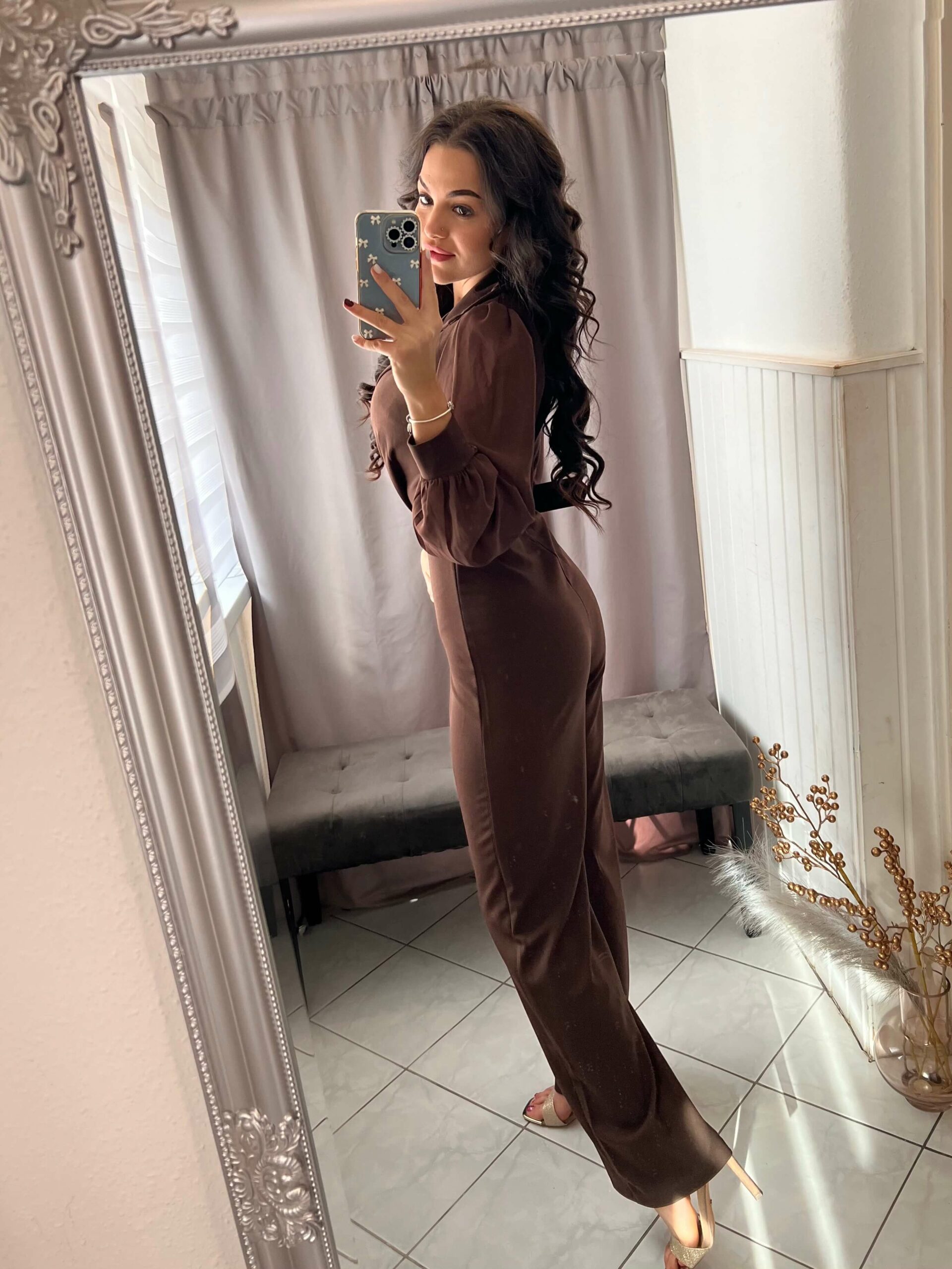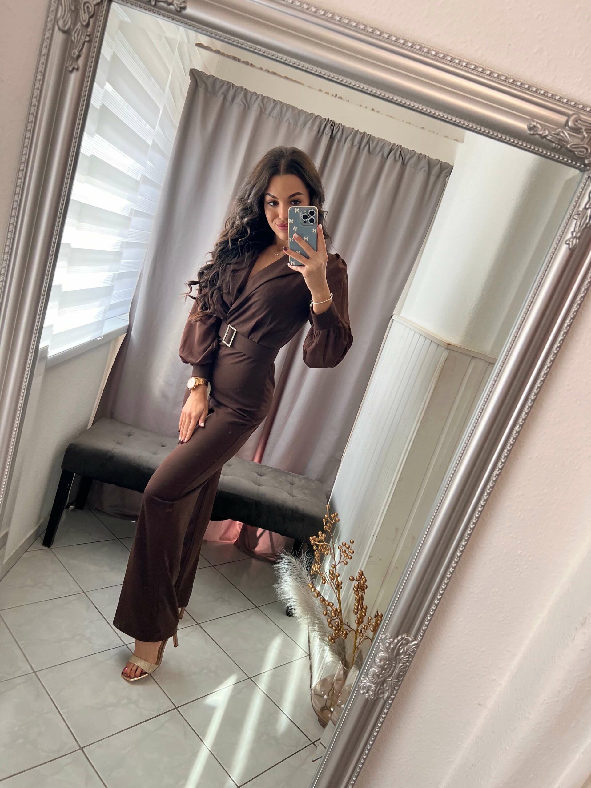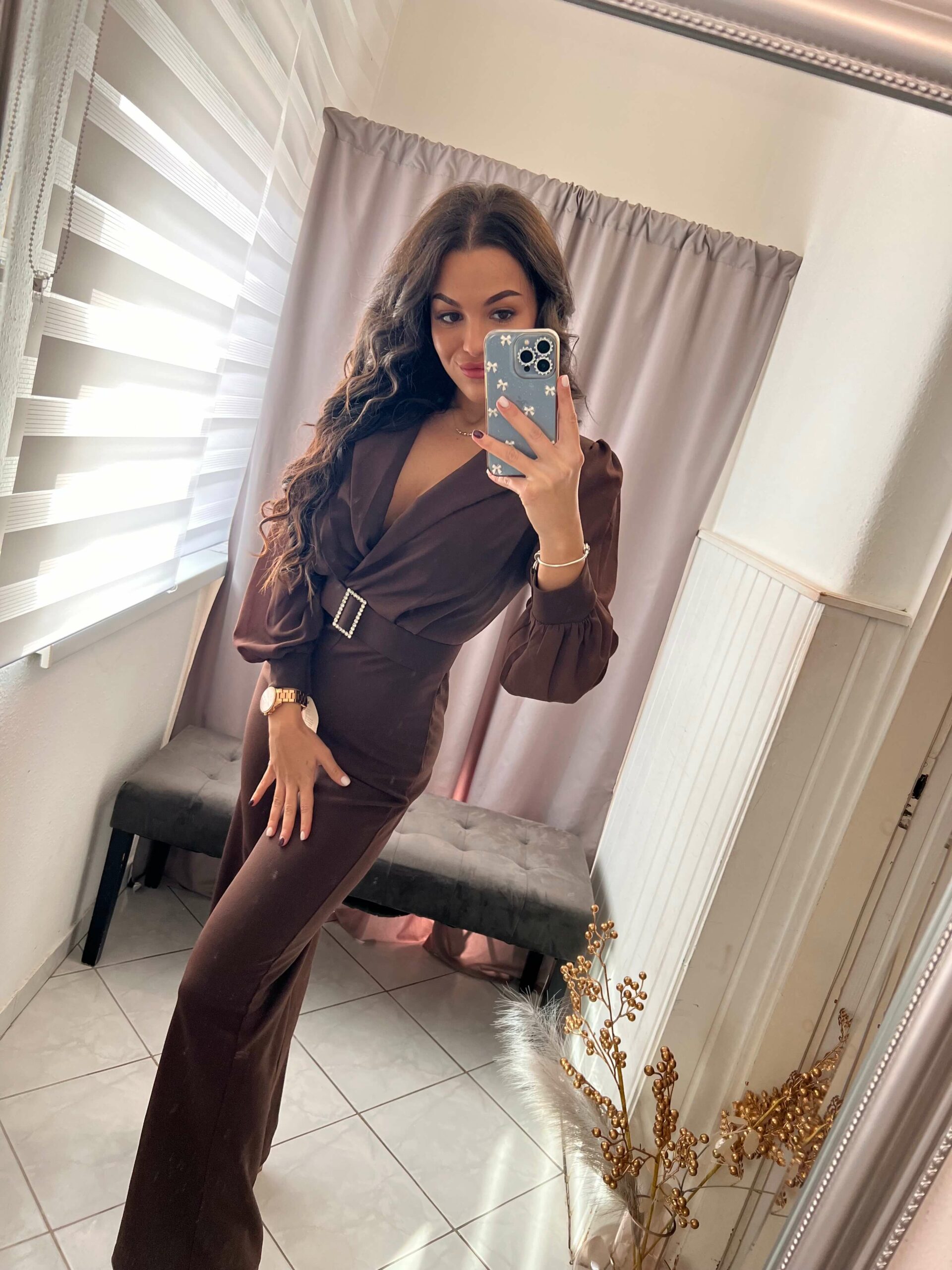 Magasitott nyakú, bő szárú tüllös fazonú , derekán öves overál.