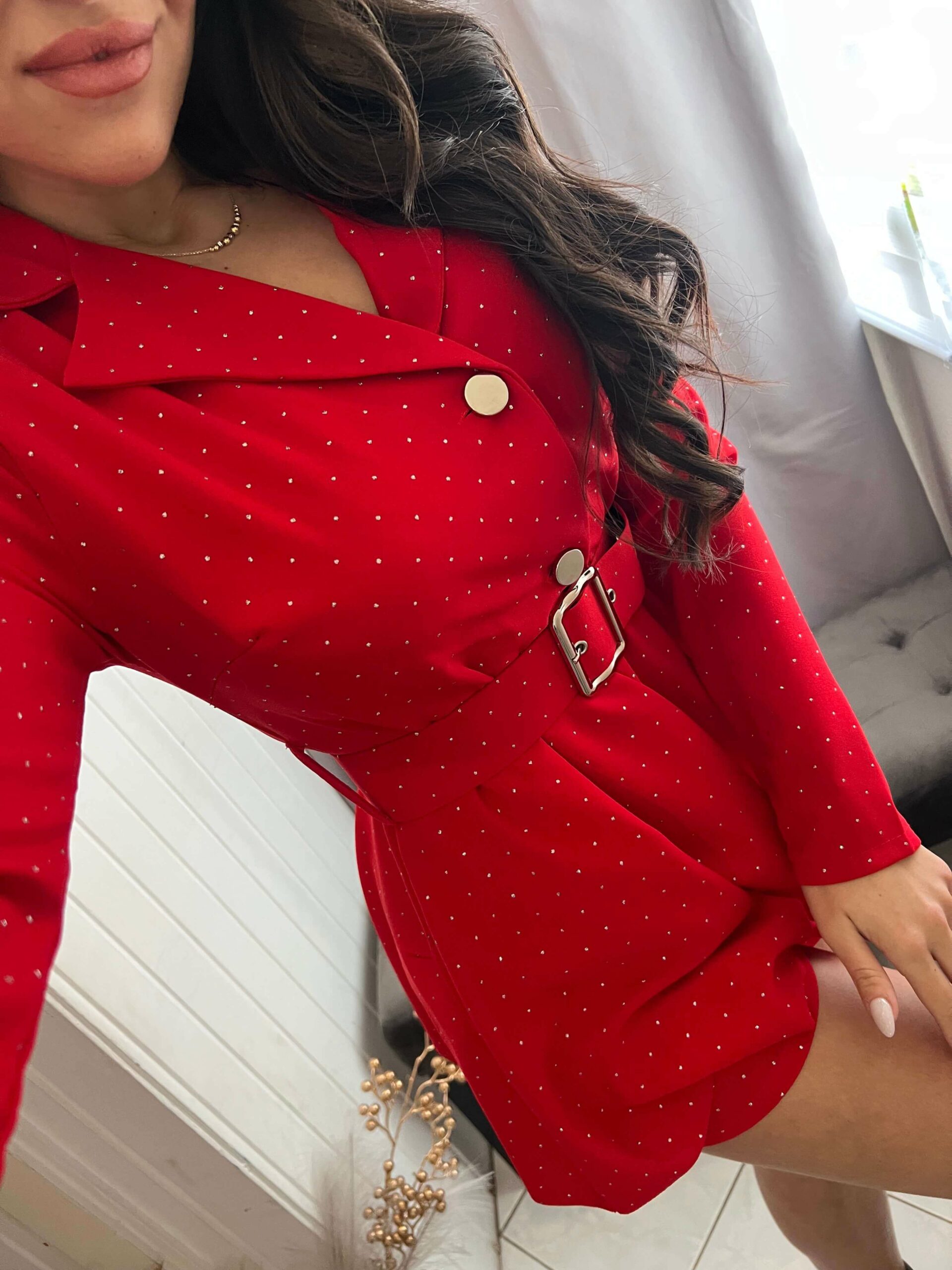 Lona piros szoknya nadrágos overál kövezett diszitéssel.