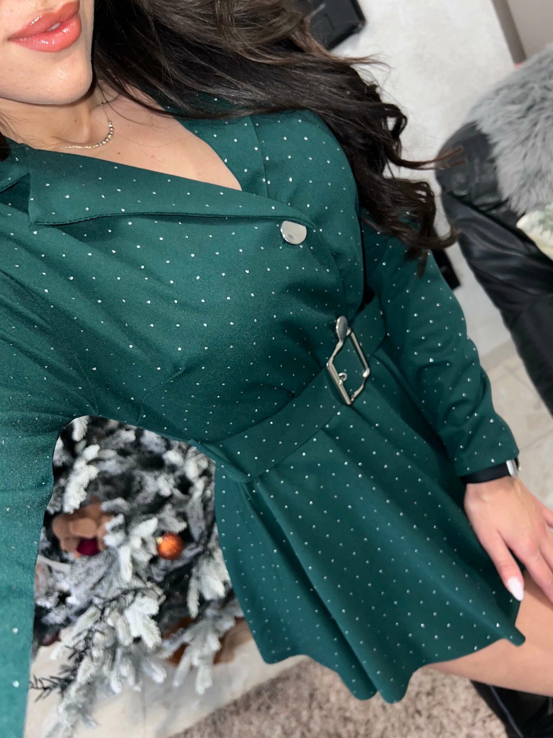 Lona zöld szoknya nadrágos overál kövezett diszitéssel.